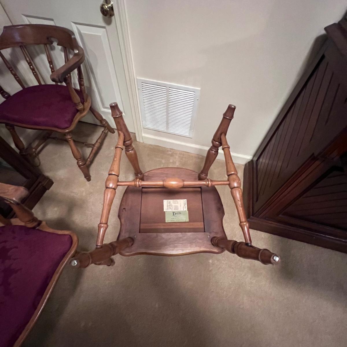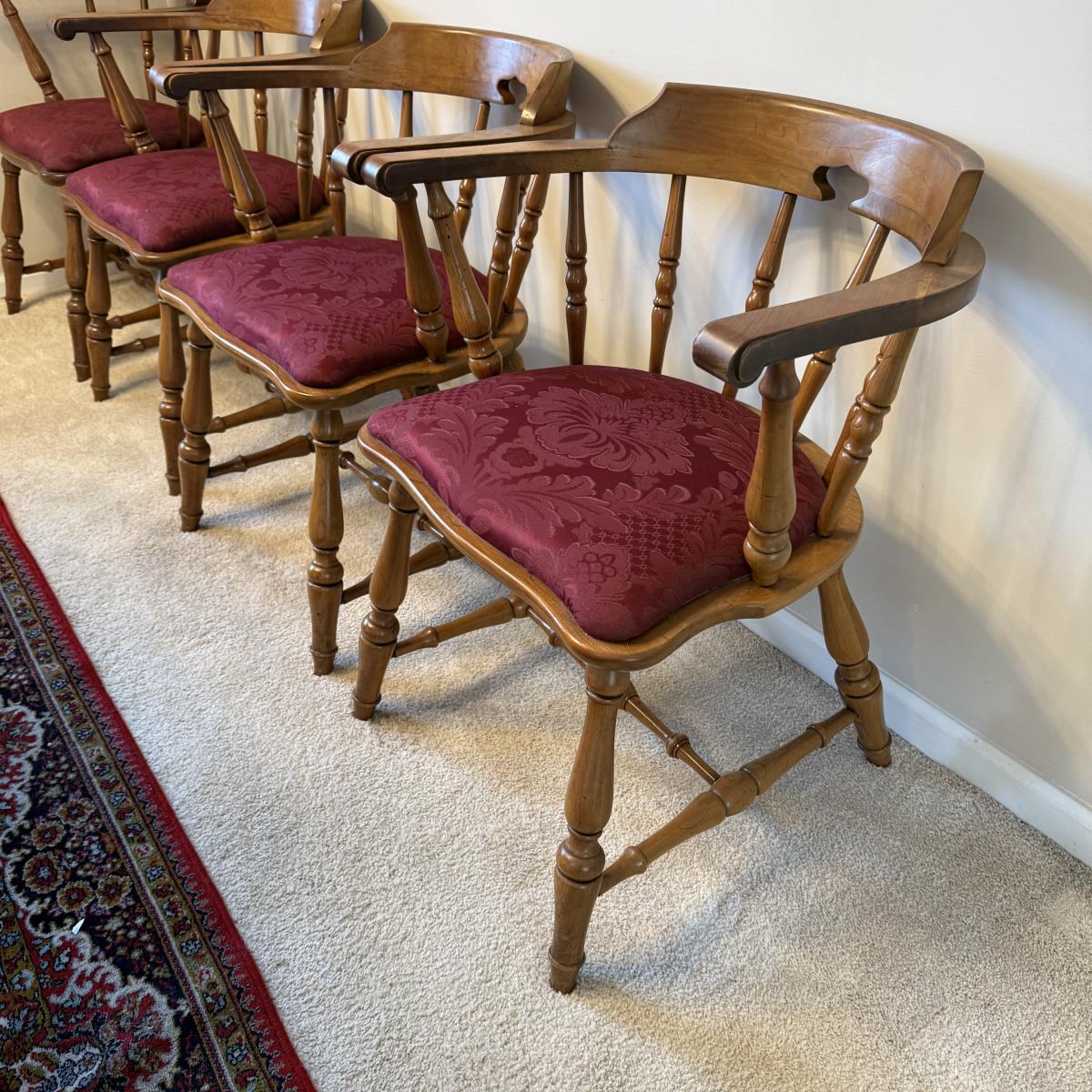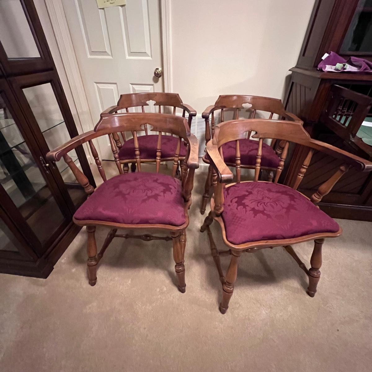 Matching set of four solid wood chairs with burgundy damask style upholstered seats.