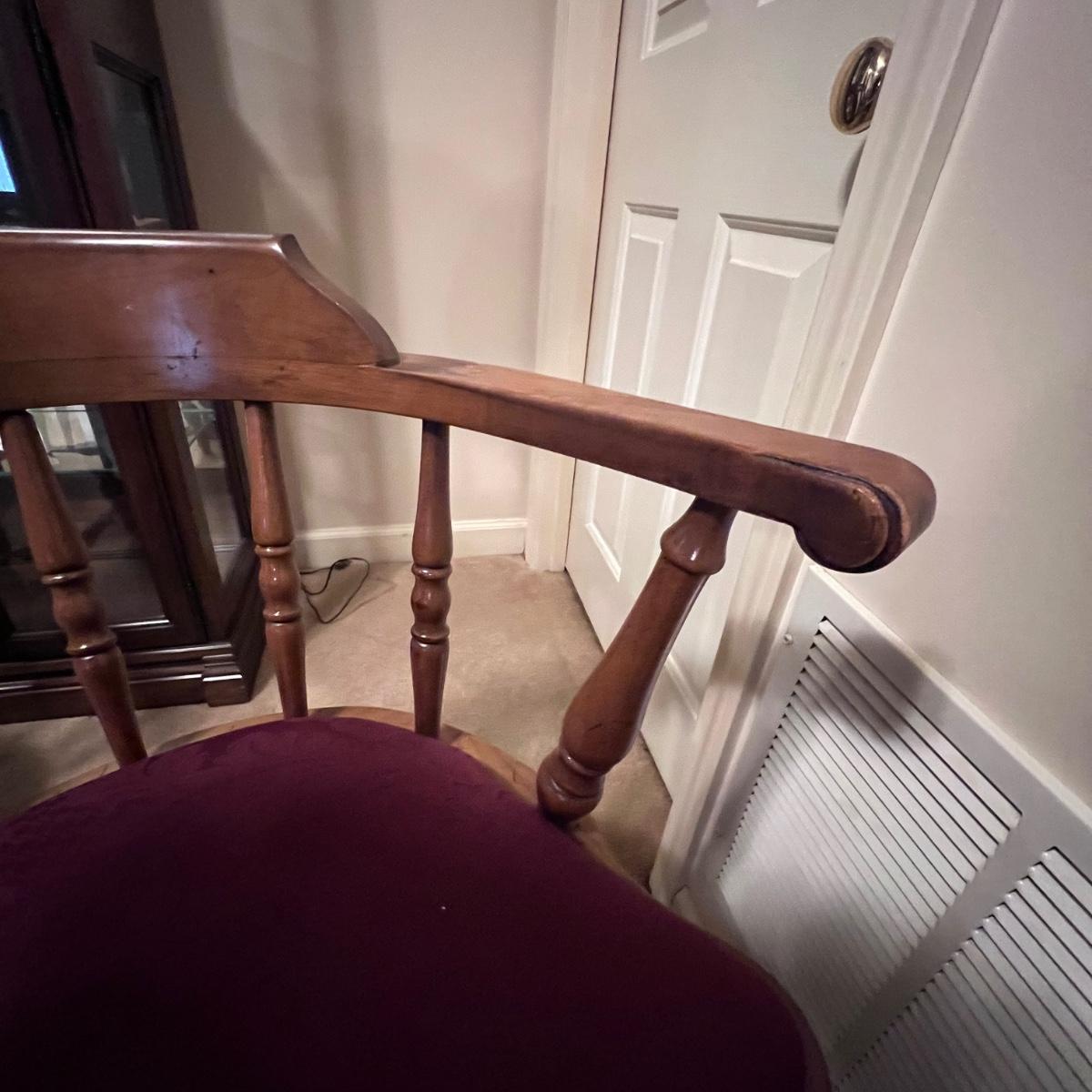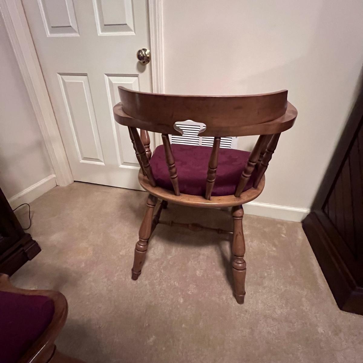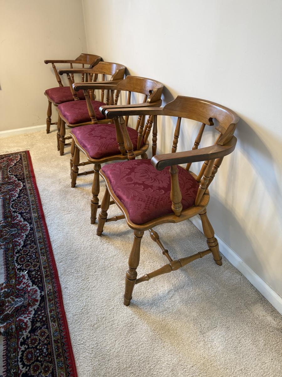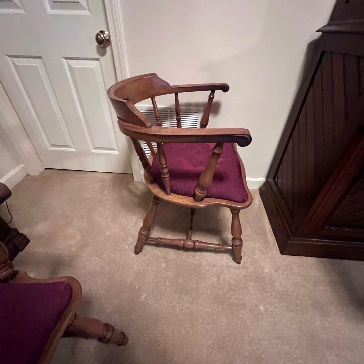 Matching set of four solid wood chairs with burgundy damask style upholstered seats.