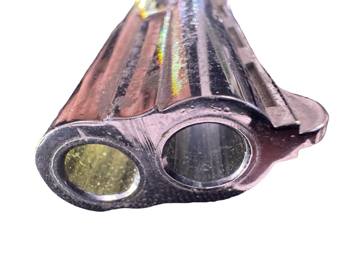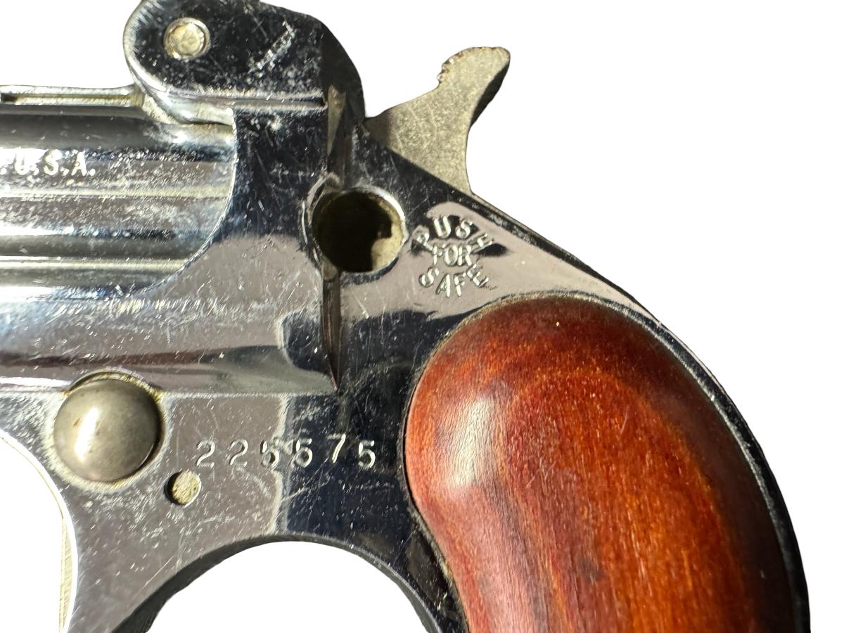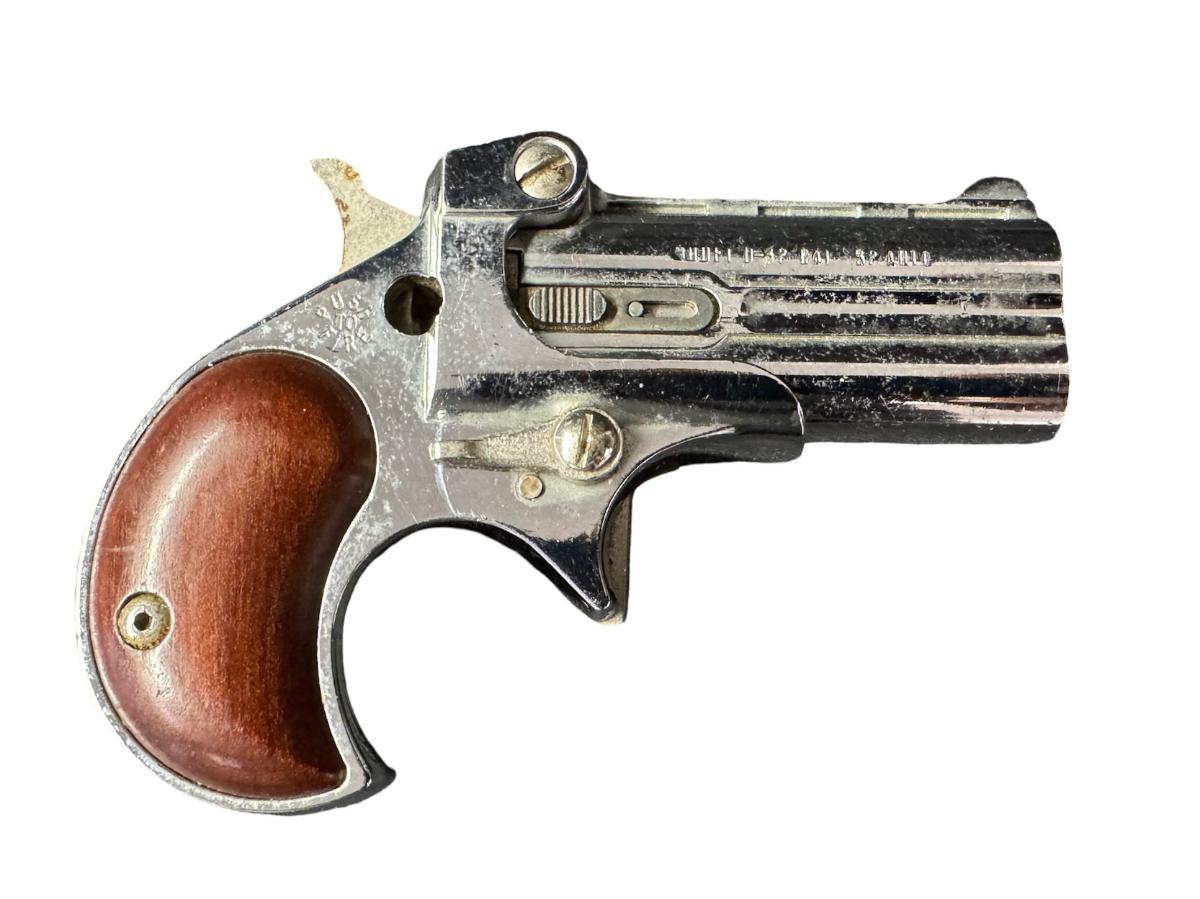 This is a two shot derringer with a nickel finish. It fires a .32 ACP round. It has hardwood grips. The barrel length is 2.38 inches. The overall length is 4 inches. The gun appears to be missing the safety, and should be inspected. Serial number 225575. Not tested. [PM]