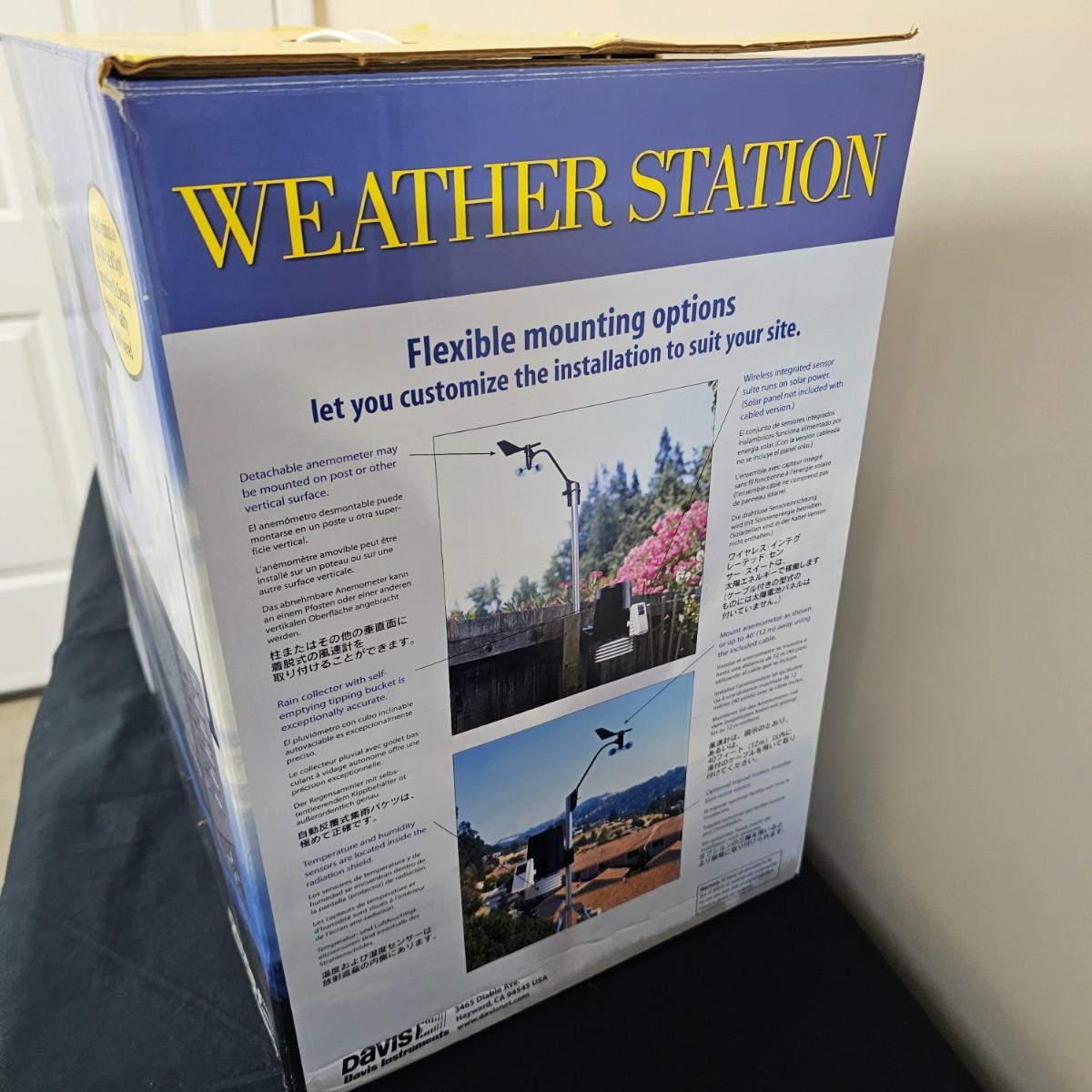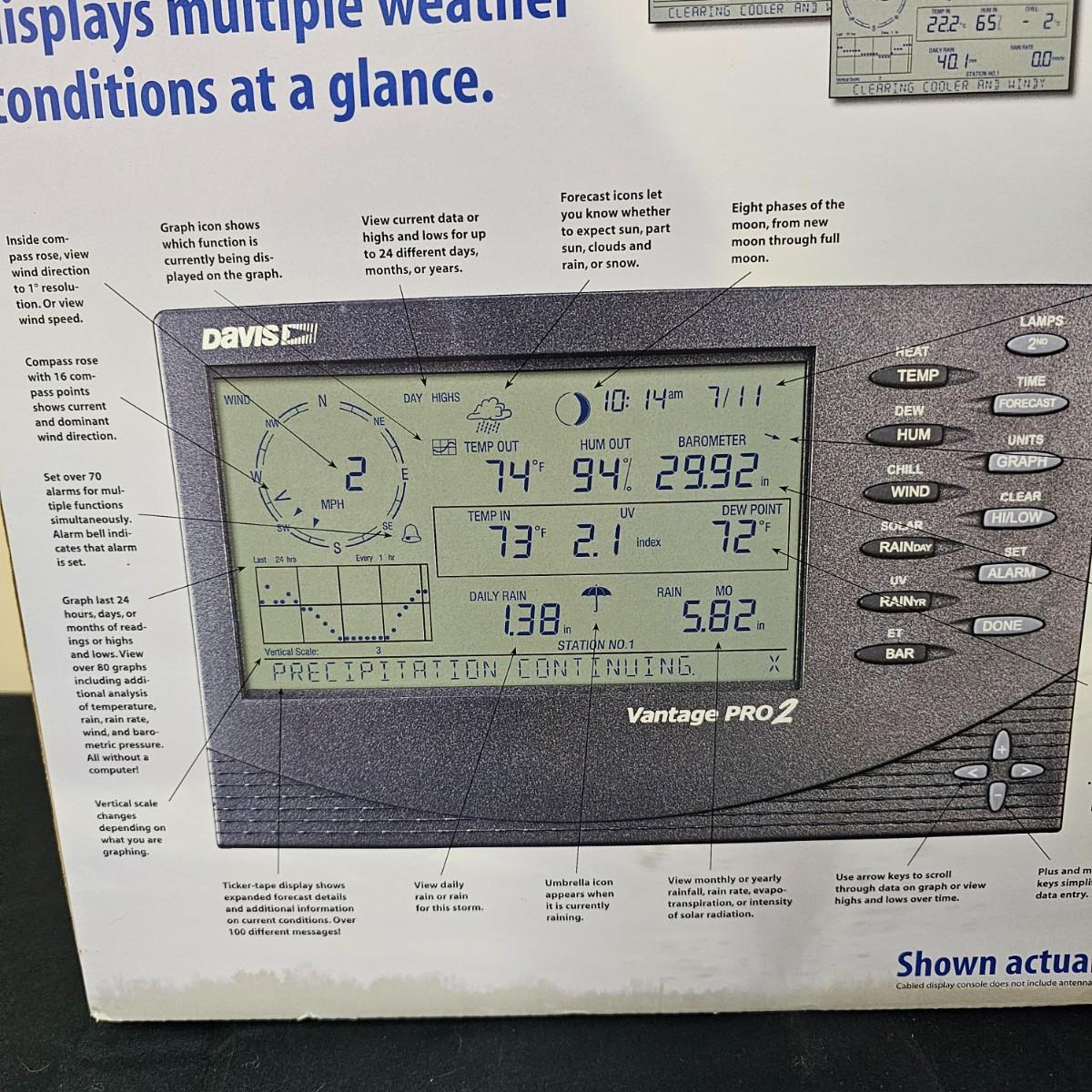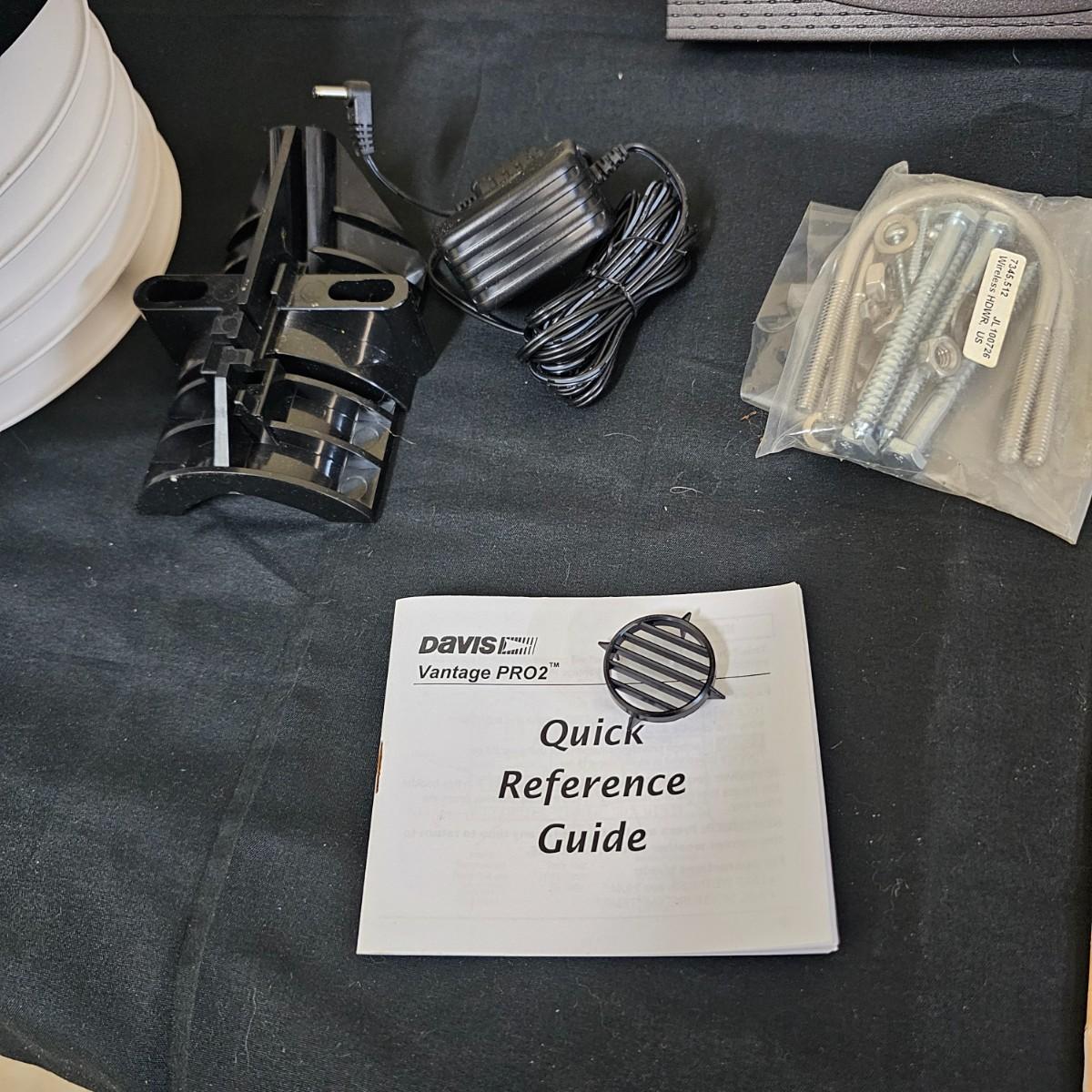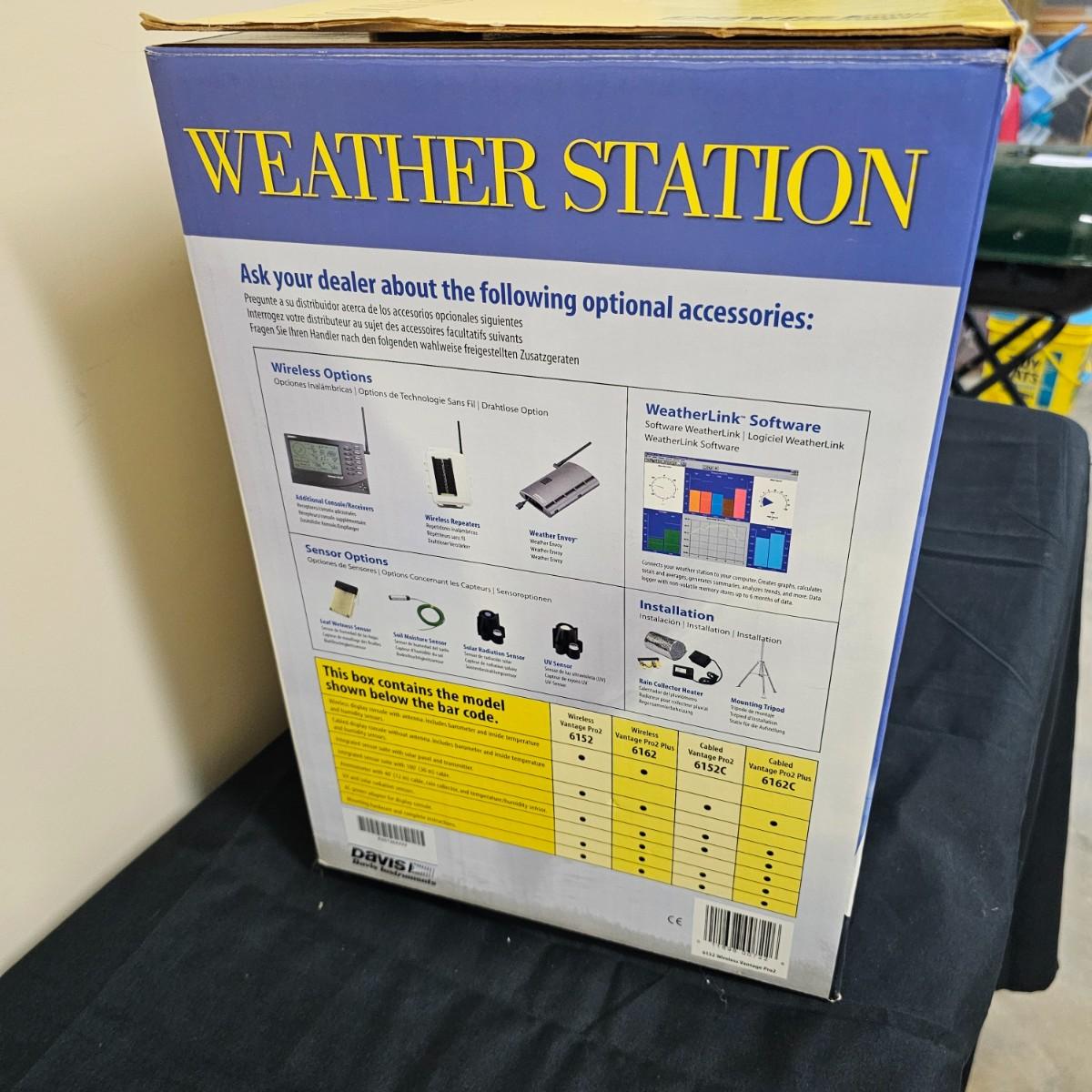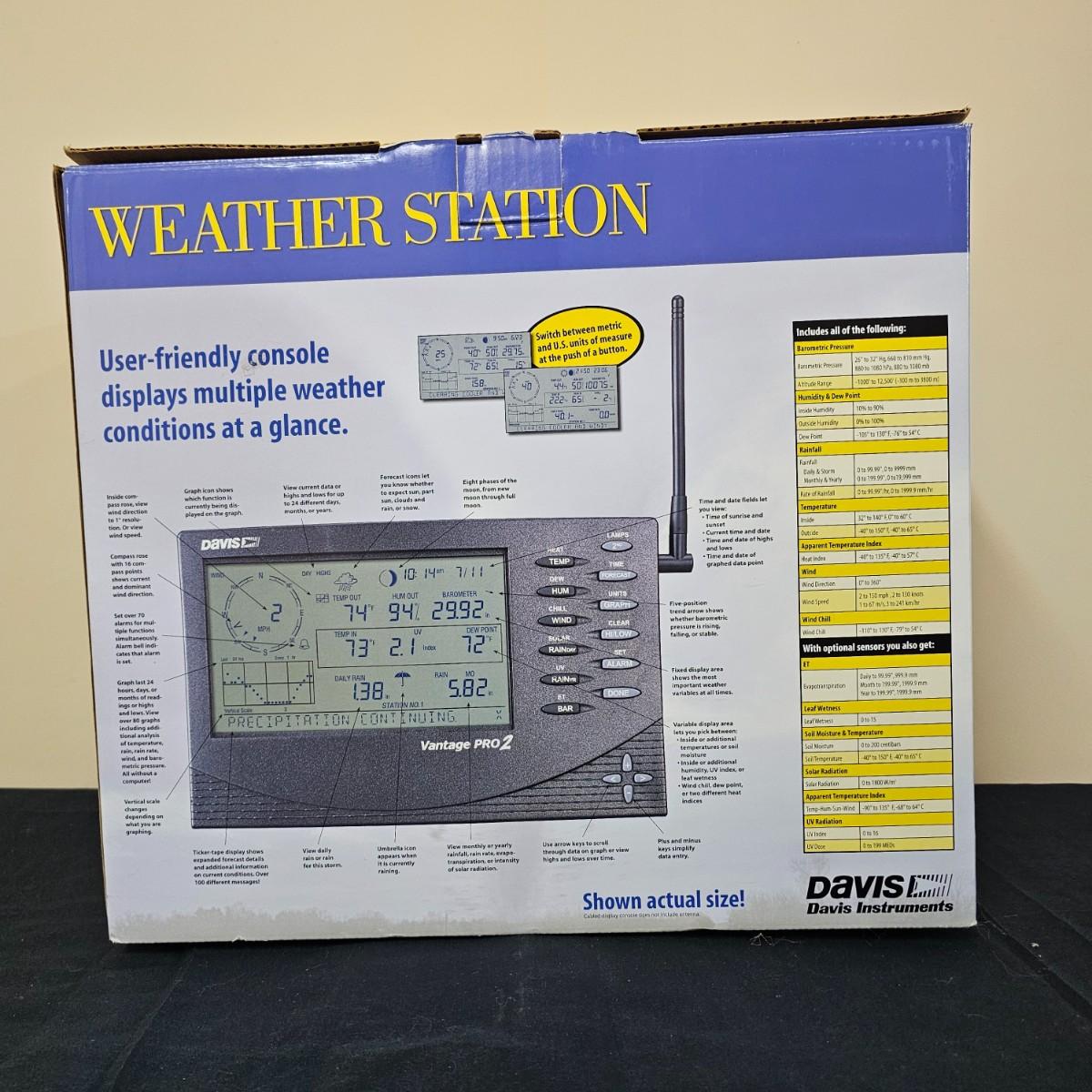 Outdoor sensor unit shows barometric pressure, humidity & dew point, rainfall, temperature, wind and more. Hardware connects to inside console unit, or can be done wireless with optional accessories. Unit powered on when plugged in, but outside pieces not tested. Box has been opened, all pieces may not be present. See photos for details. Shipping available.