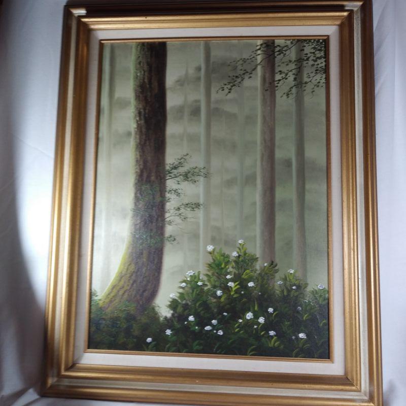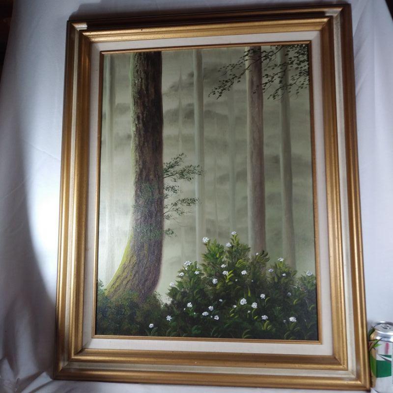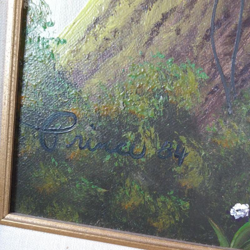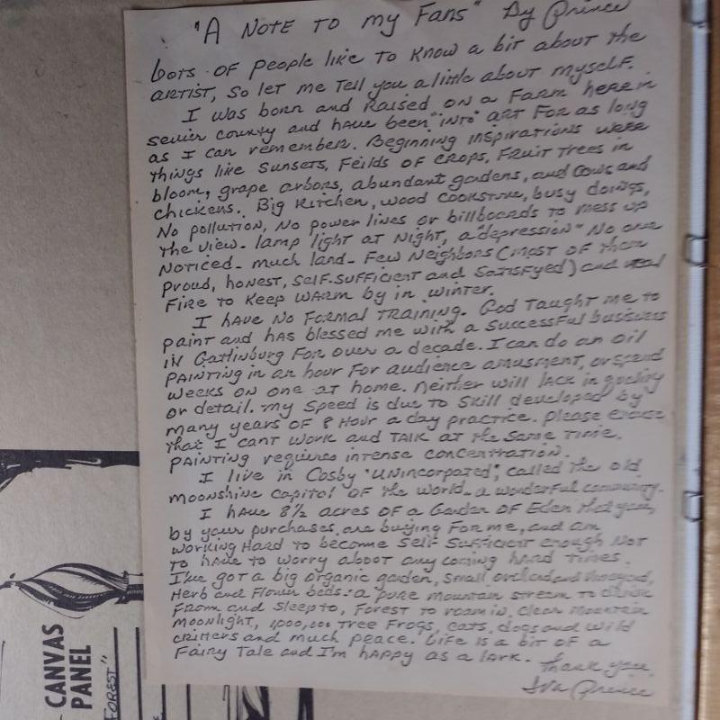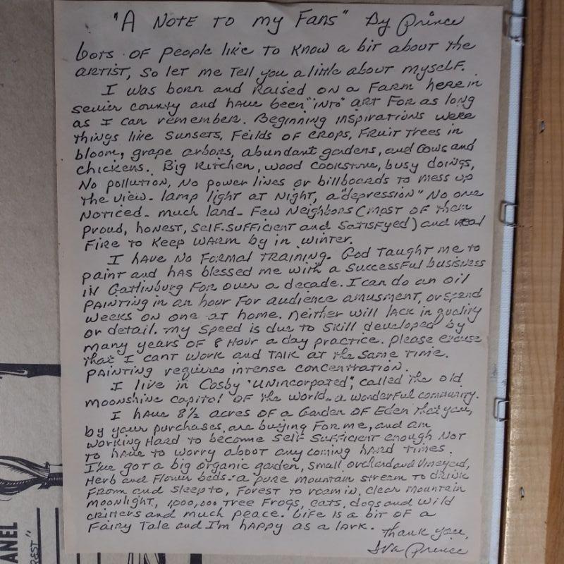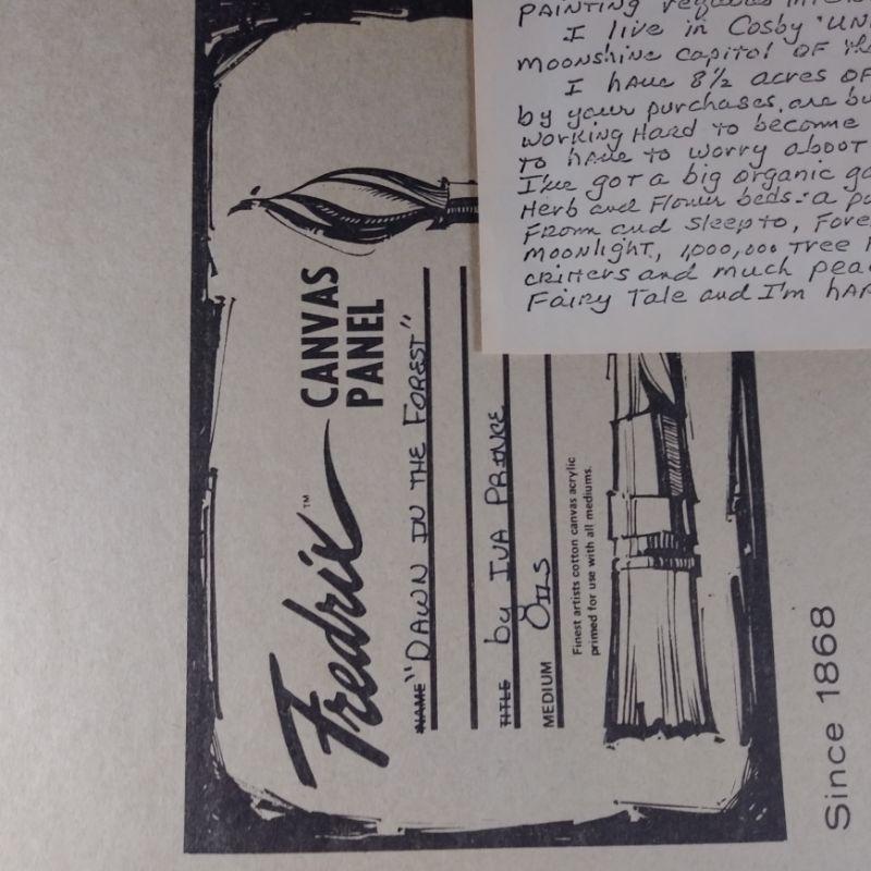 "Dawn In The Forest" is a large framed oil painting on canvas board. Signed by the artist - Iva Prince and dated '84. Prince is a listed artist whose works are held in many regional - especially Tennessee, collections. She attached a hand-written note about herself and her art on the back of the painting by her own hand. This is a large artwork in very good condition - ready to hang. The painting is 24 1/2-inches wide X 10 1/2-inches tall (framed).
