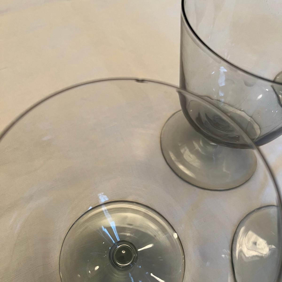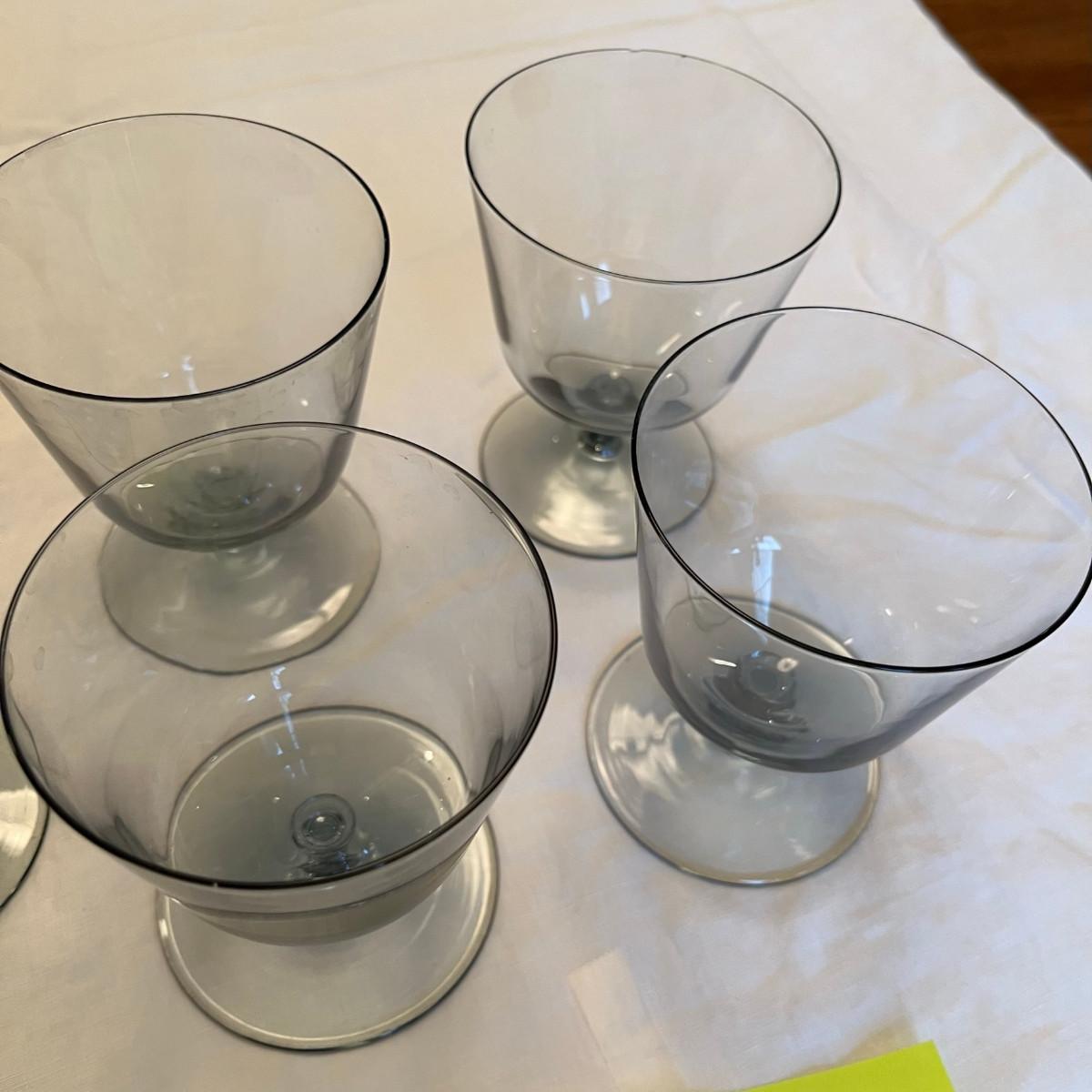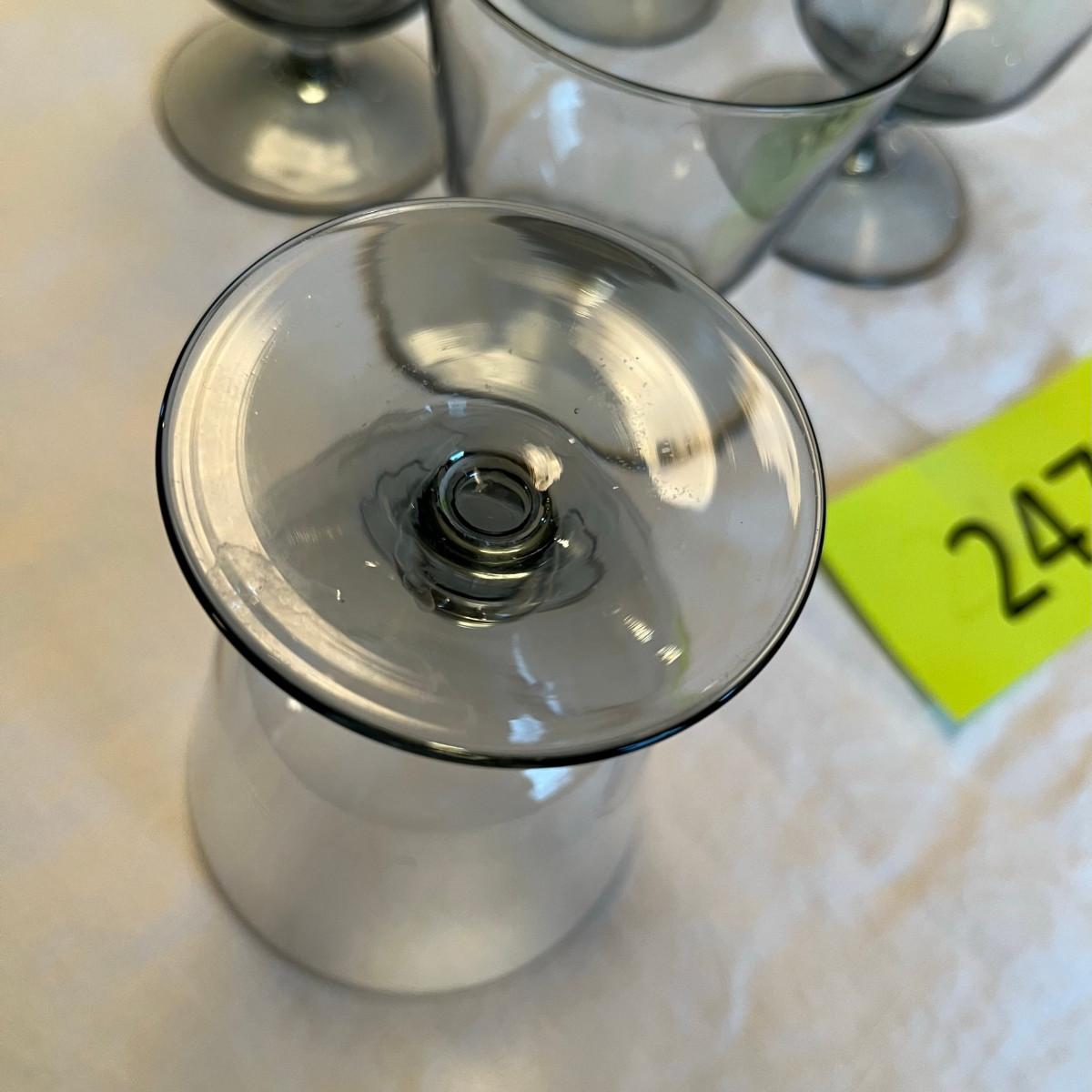 Lot of 5 cocktails. These do somewhat change from a smoke color to a blue in certain light. Not sure if they are Heisey. No marks. More shapes to follow. Some have small chips, look at pictures; please!
