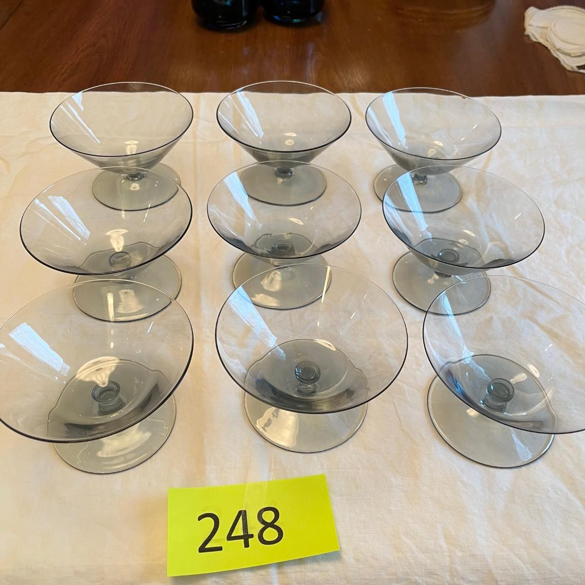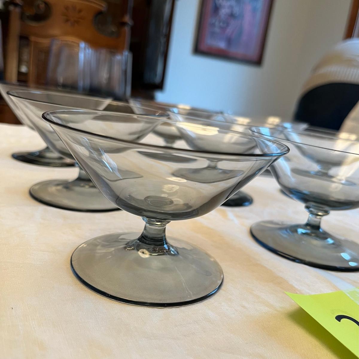 These do somewhat change from a smoke color to a blue in certain light. Not sure if they are Heisey. No marks. More shapes to follow. Some have small chips, look at pictures; please!