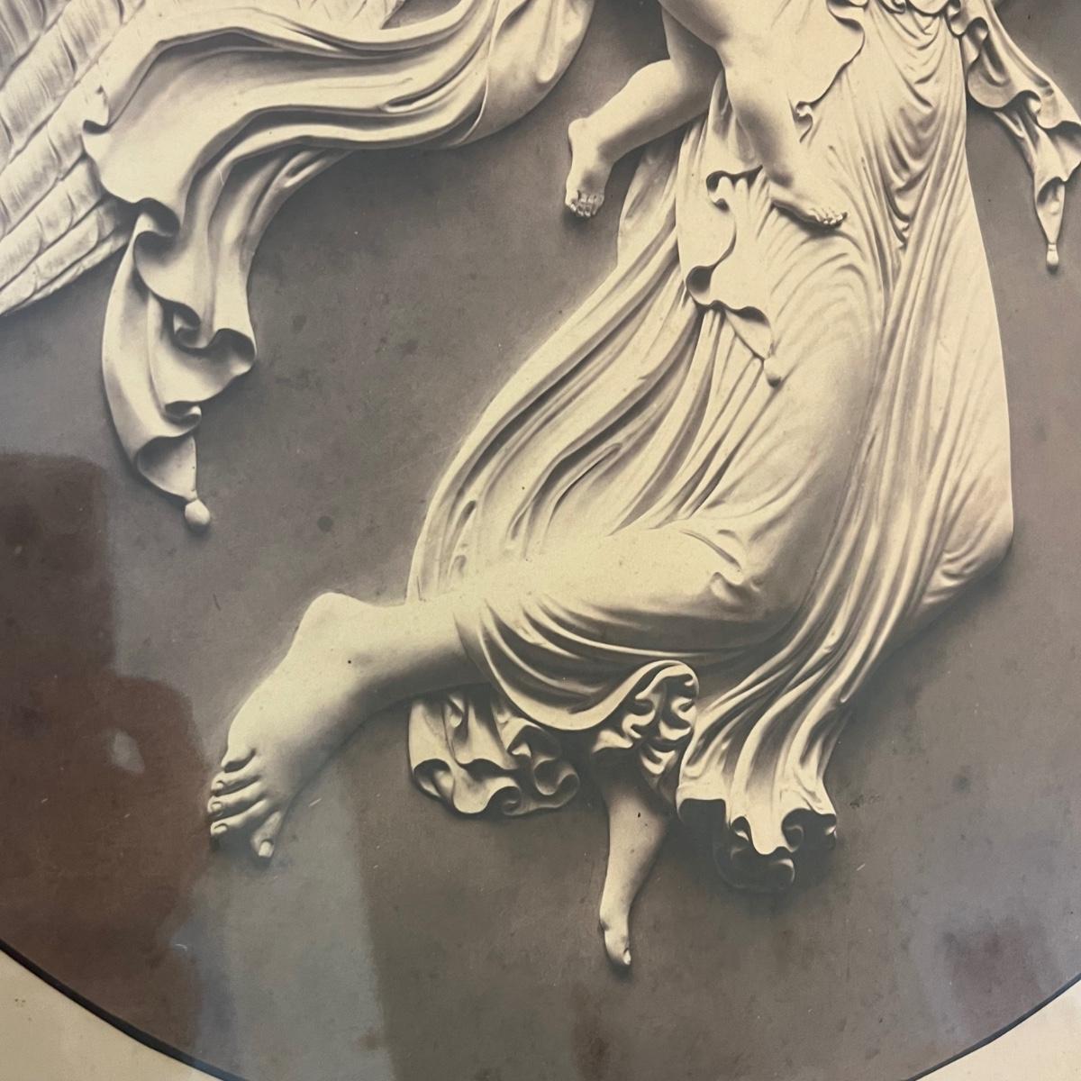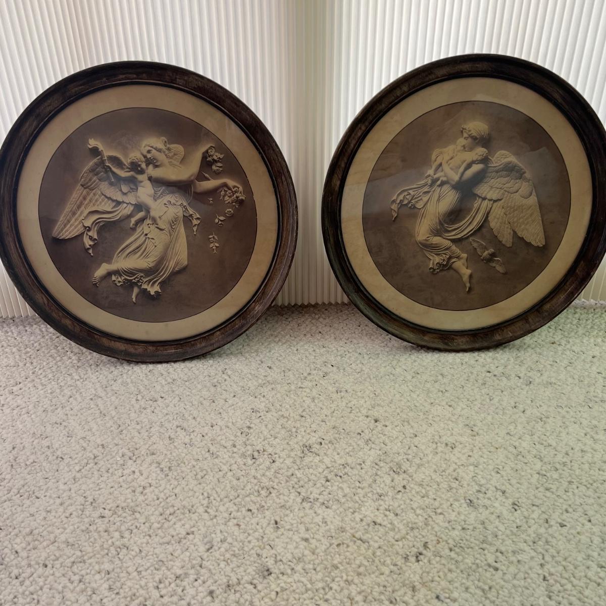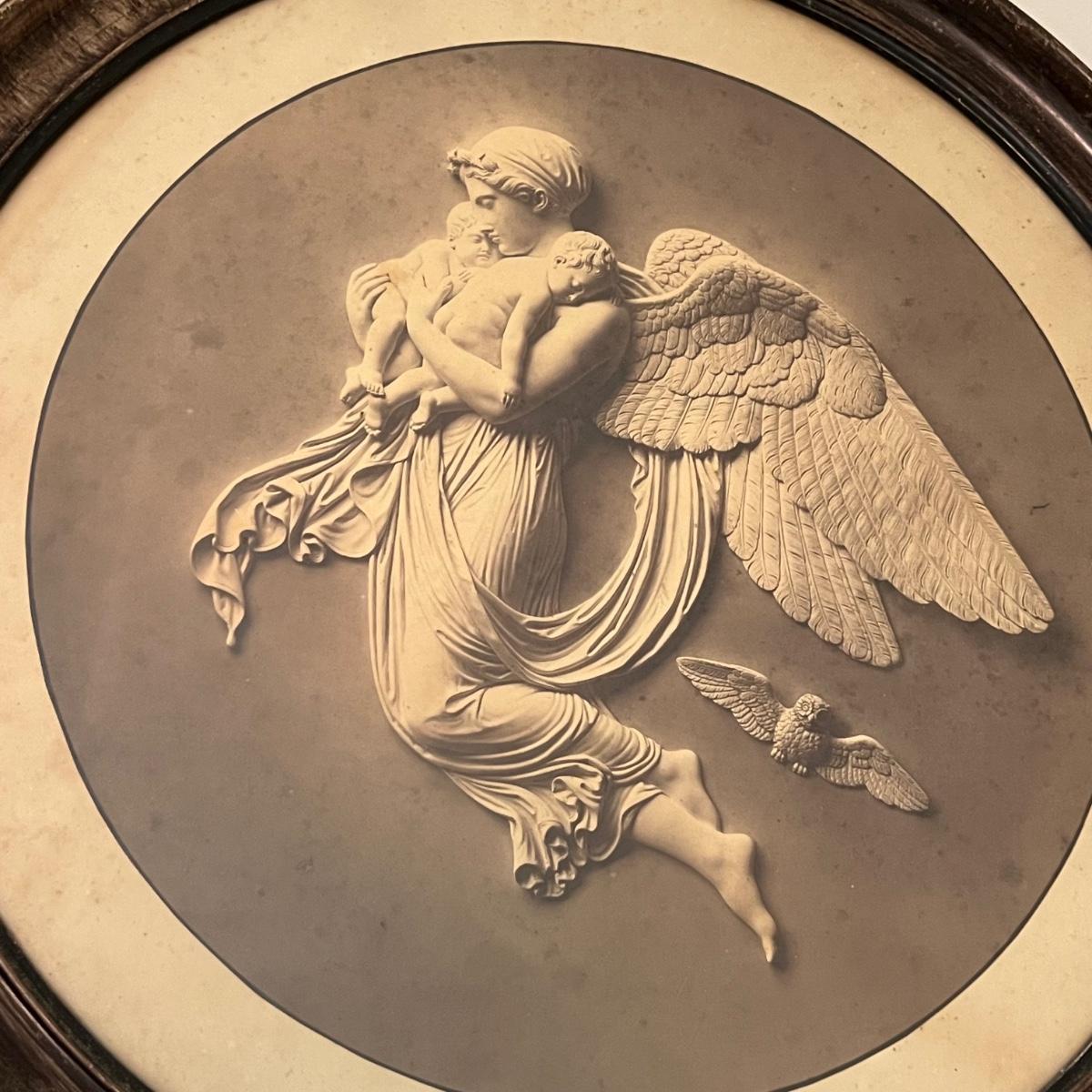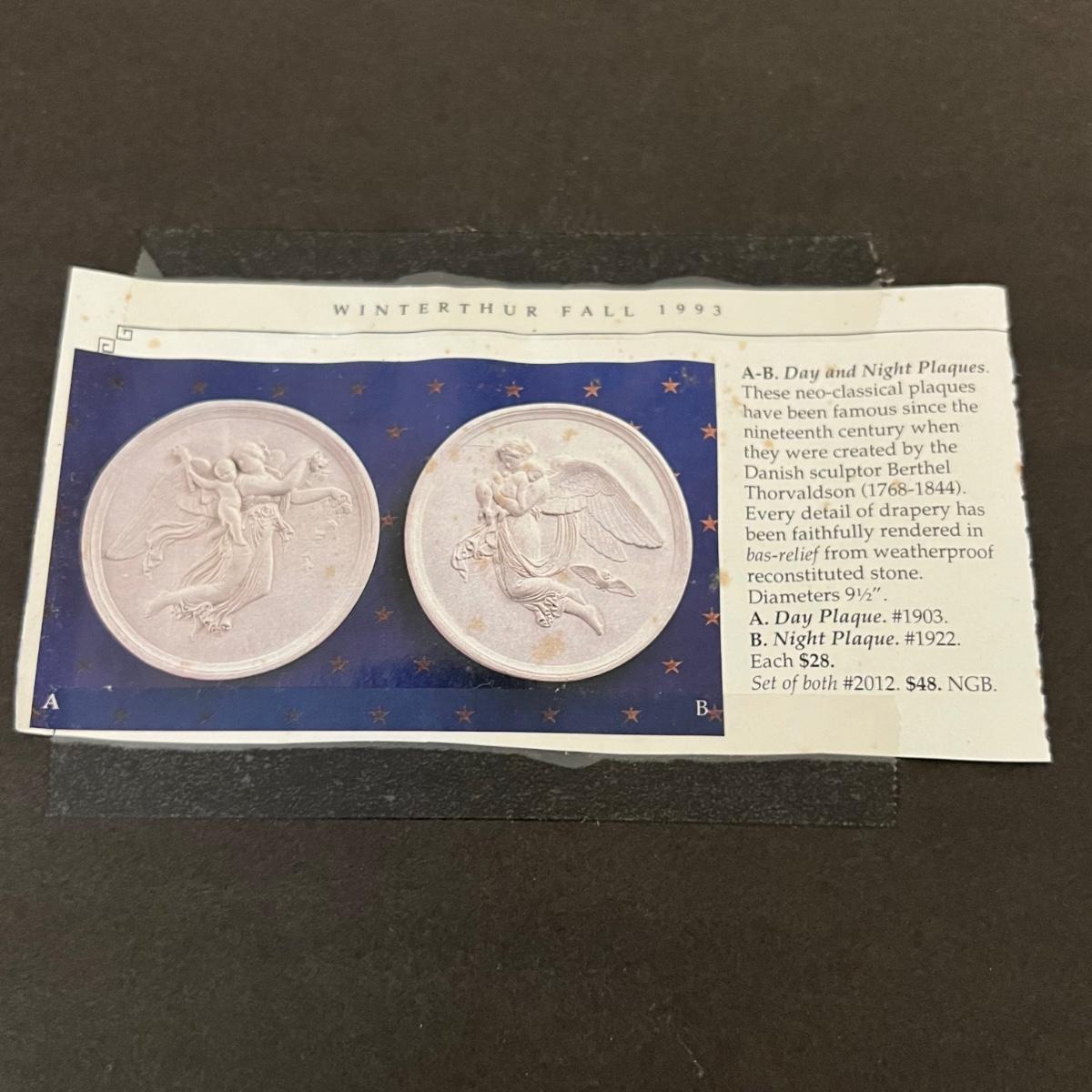 Two beautifully framed photos taken of the neo-classical plaques “Day” and “Night” created by Danish sculptor Berthel Thorvaldson. Each piece measures 22.5”D x 1.75”H framed in a distressed wooden circle frame with aged-looking matting.