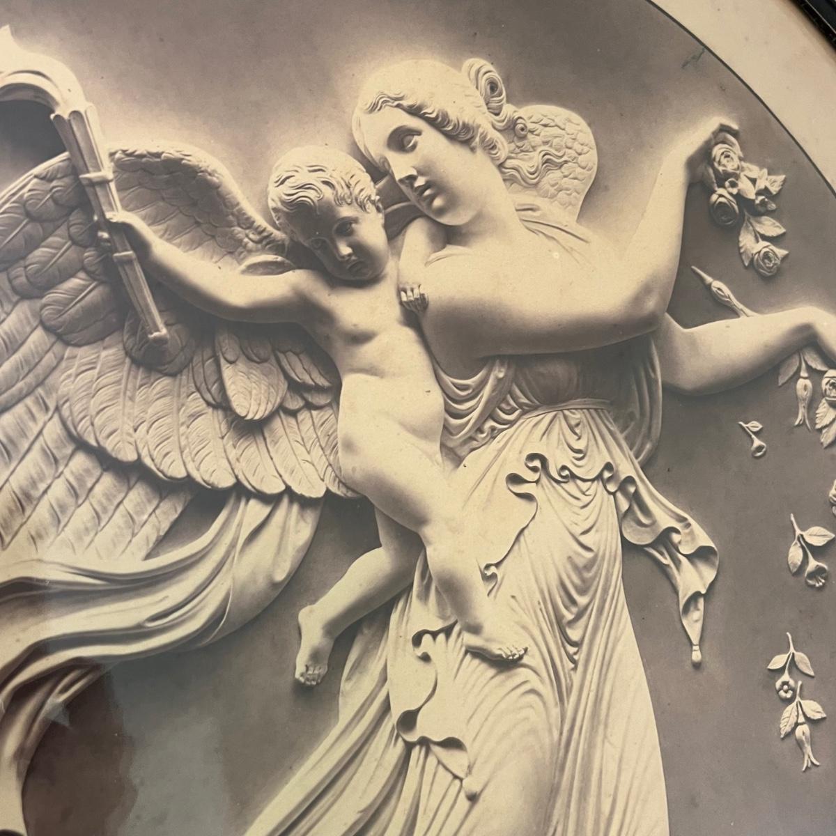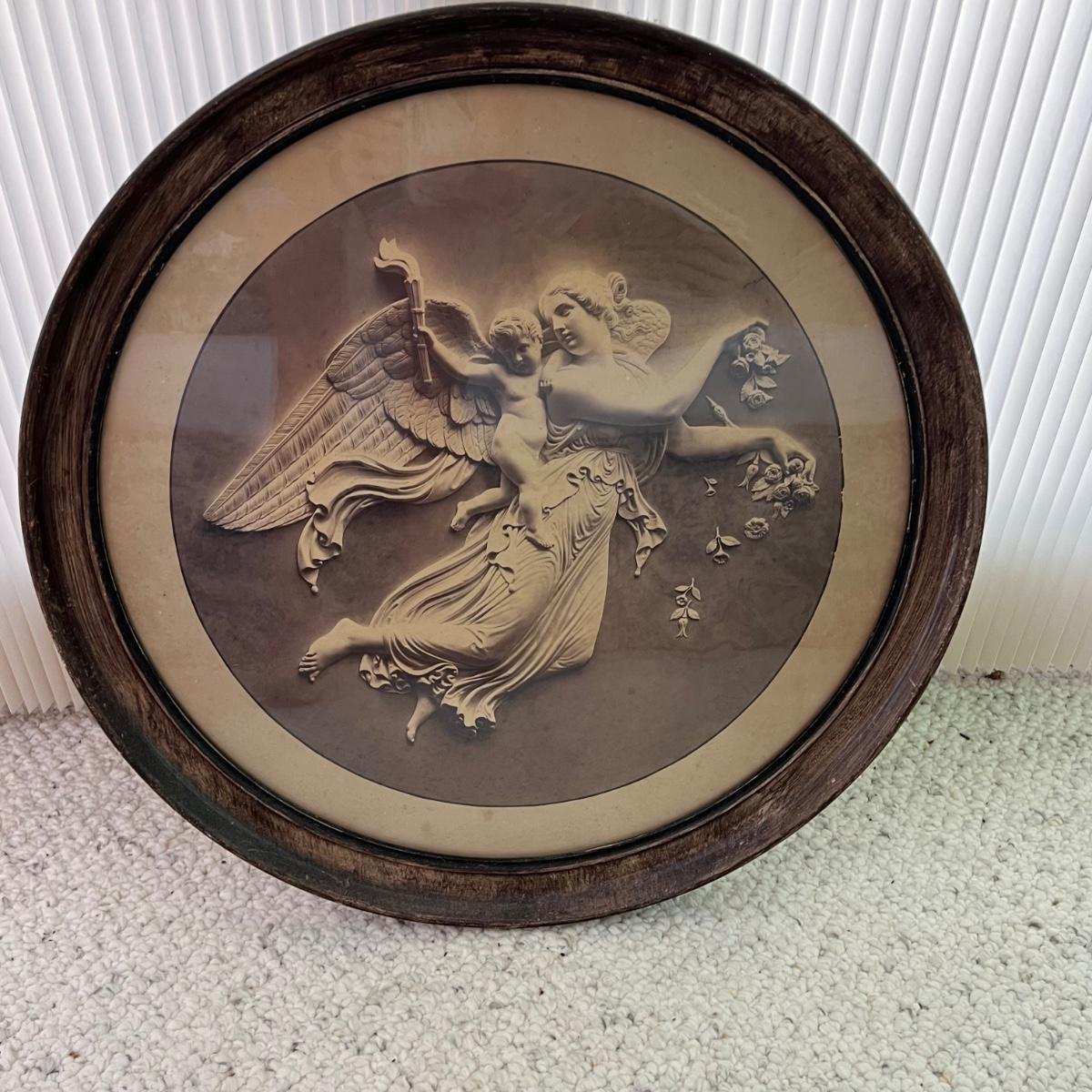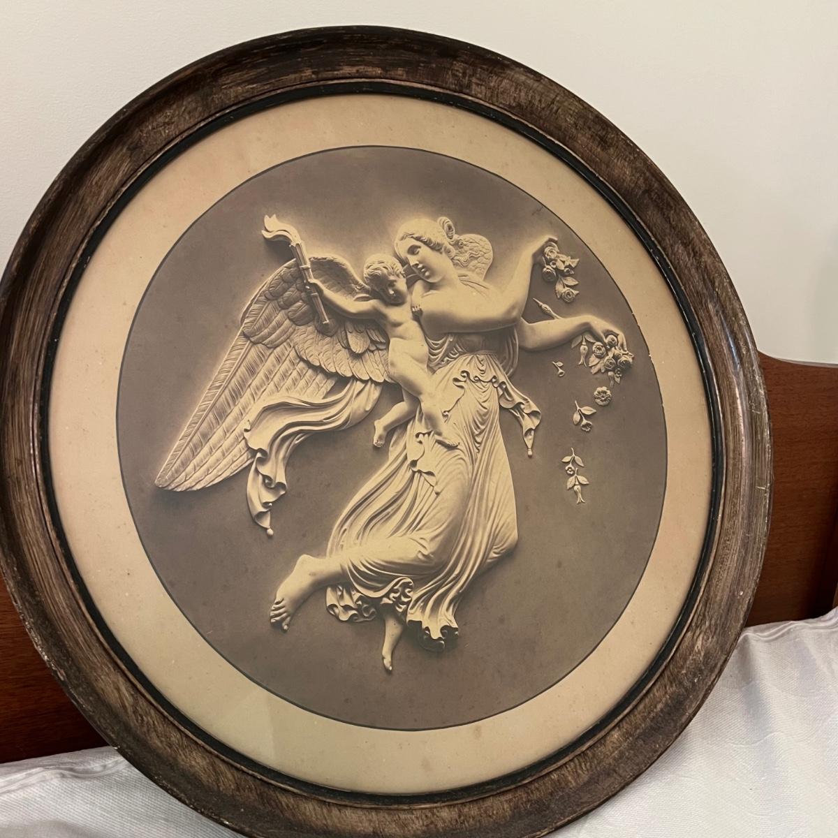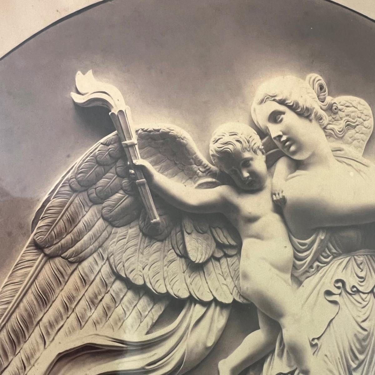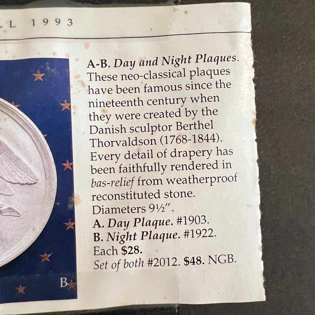 Two beautifully framed photos taken of the neo-classical plaques “Day” and “Night” created by Danish sculptor Berthel Thorvaldson. Each piece measures 22.5”D x 1.75”H framed in a distressed wooden circle frame with aged-looking matting.