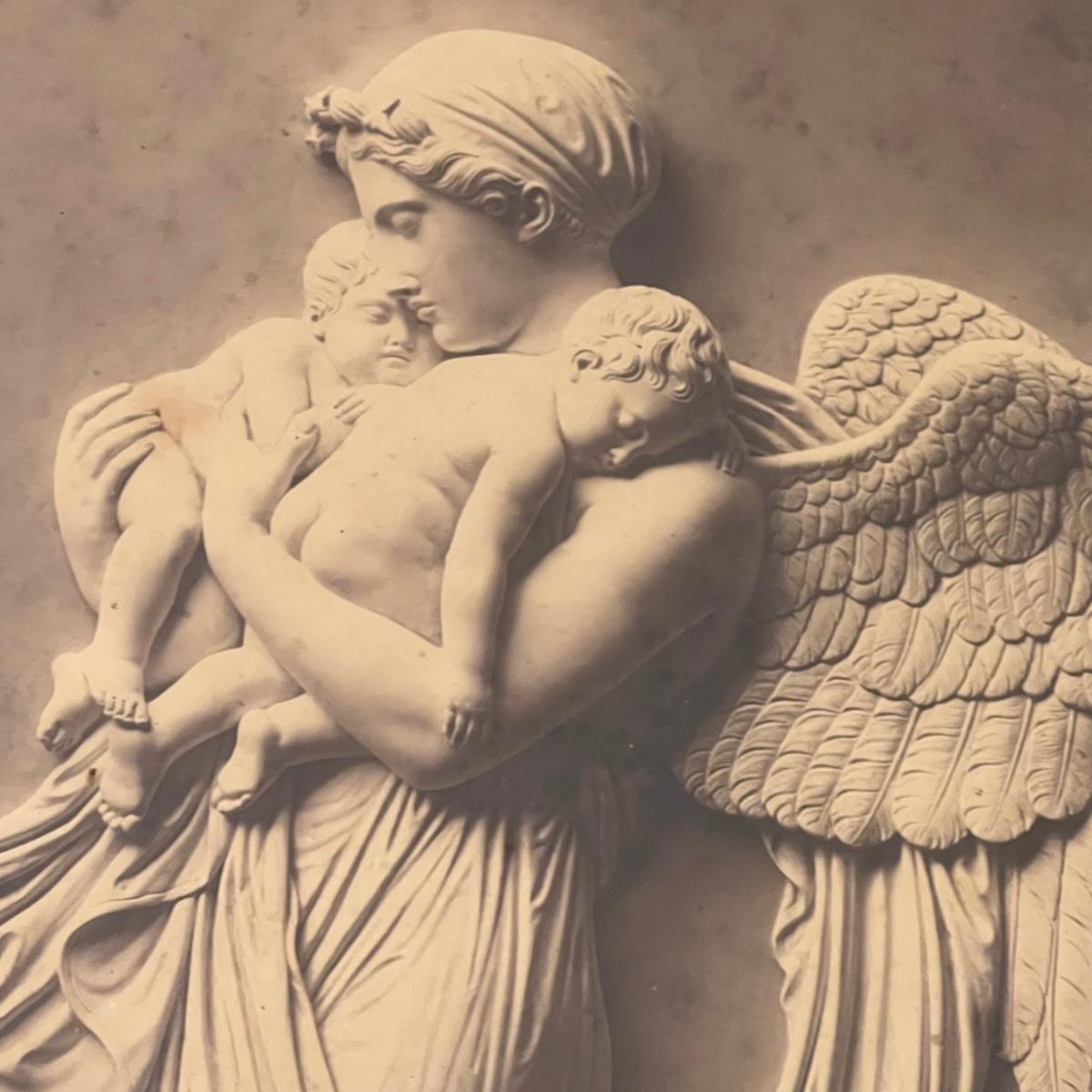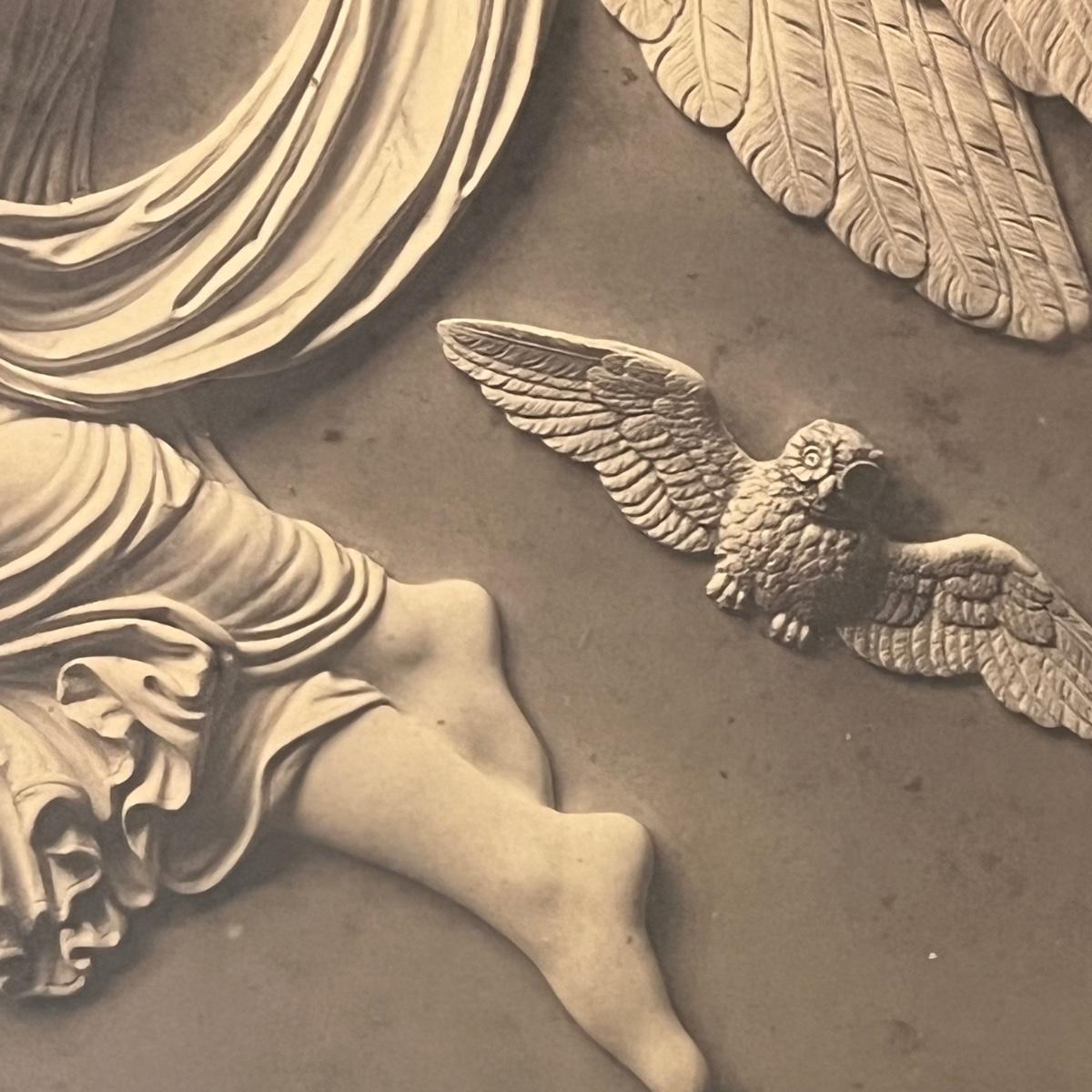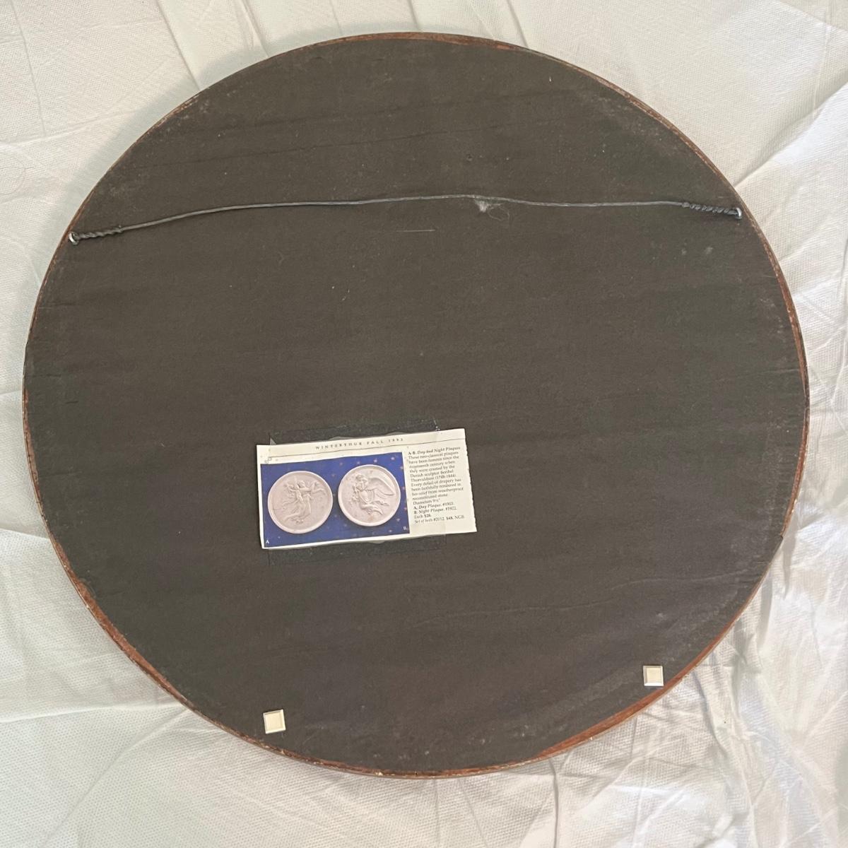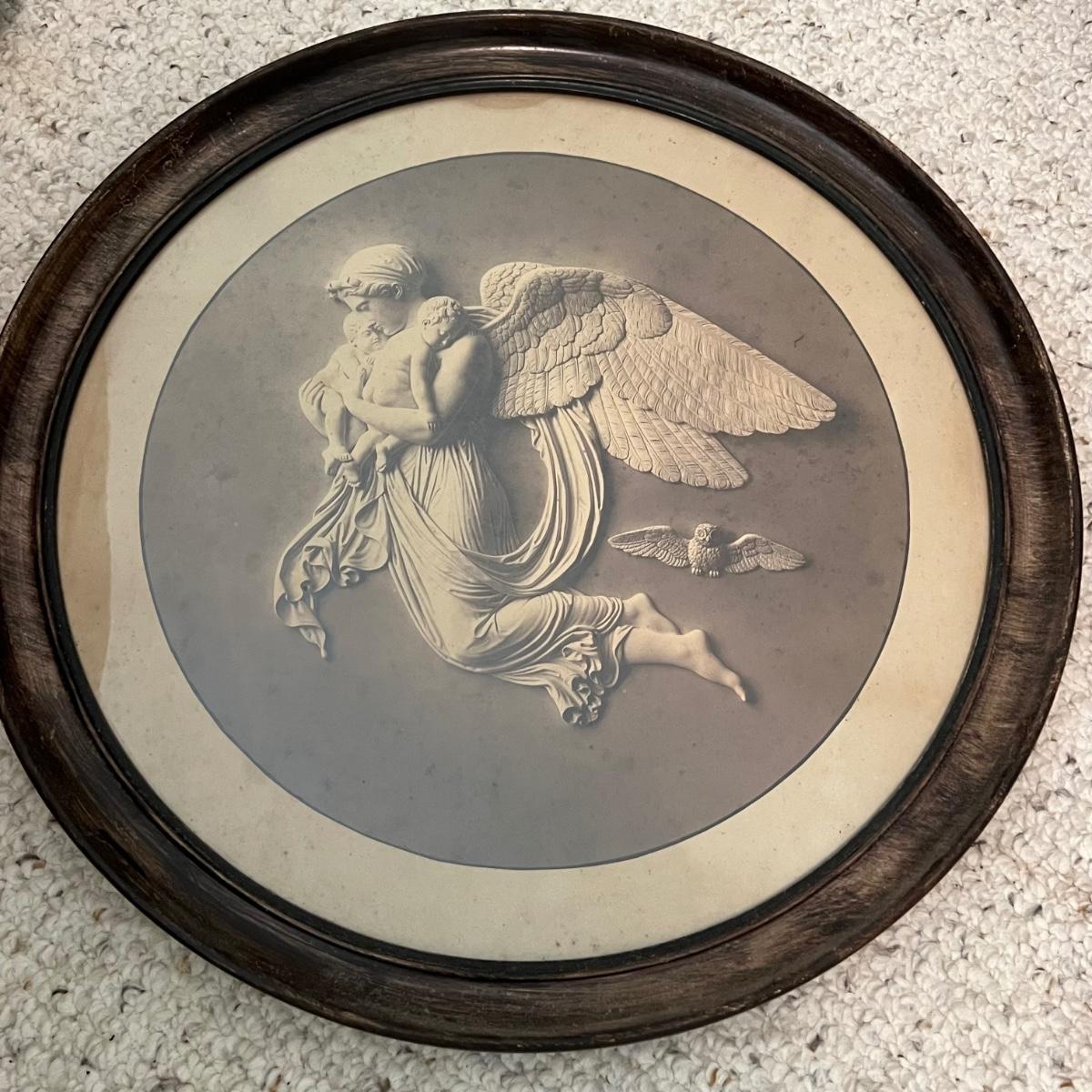 Two beautifully framed photos taken of the neo-classical plaques “Day” and “Night” created by Danish sculptor Berthel Thorvaldson. Each piece measures 22.5”D x 1.75”H framed in a distressed wooden circle frame with aged-looking matting.