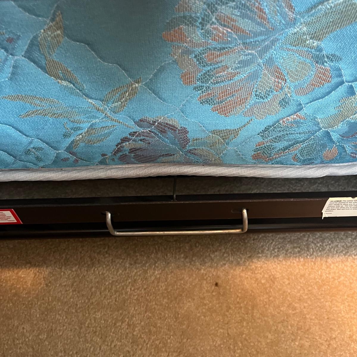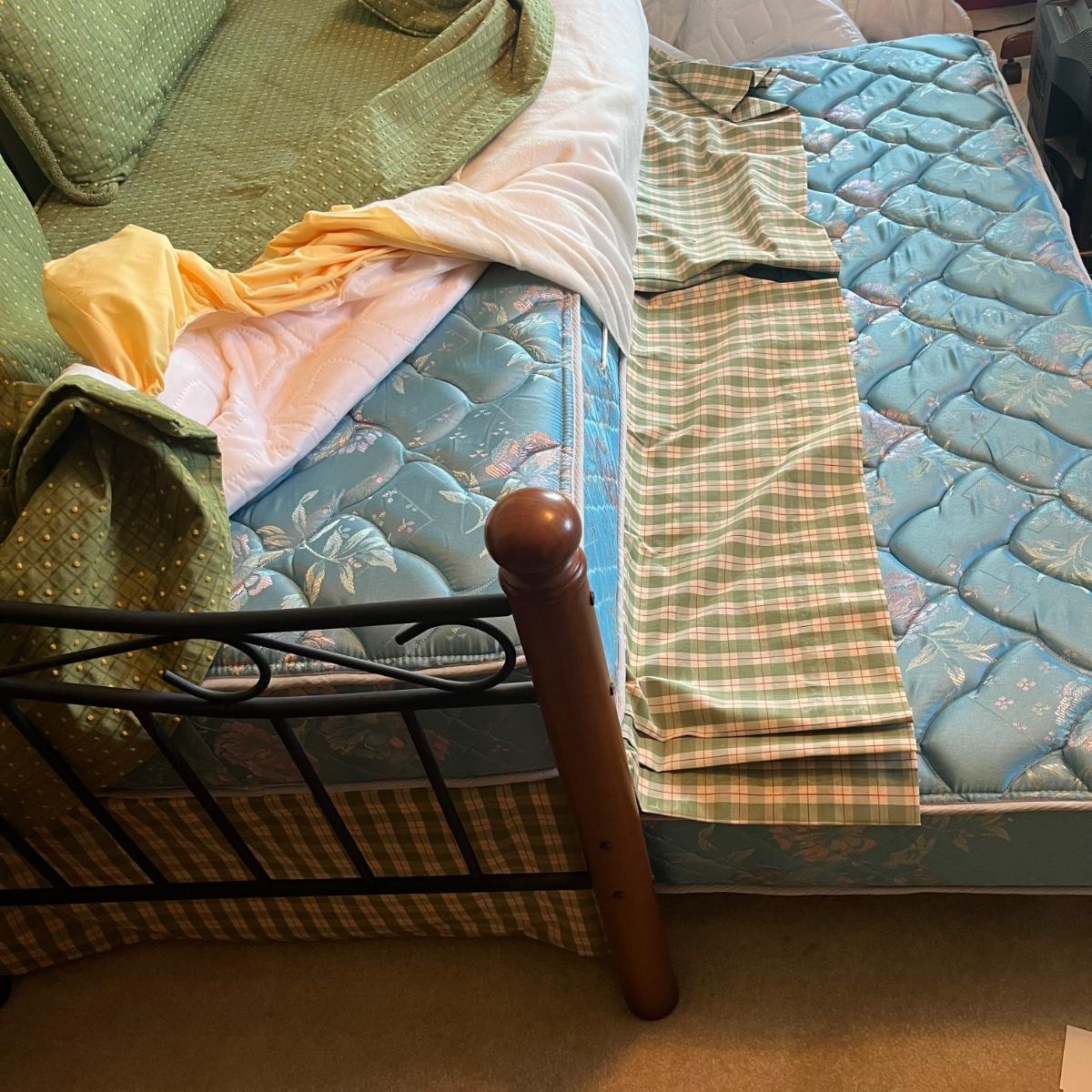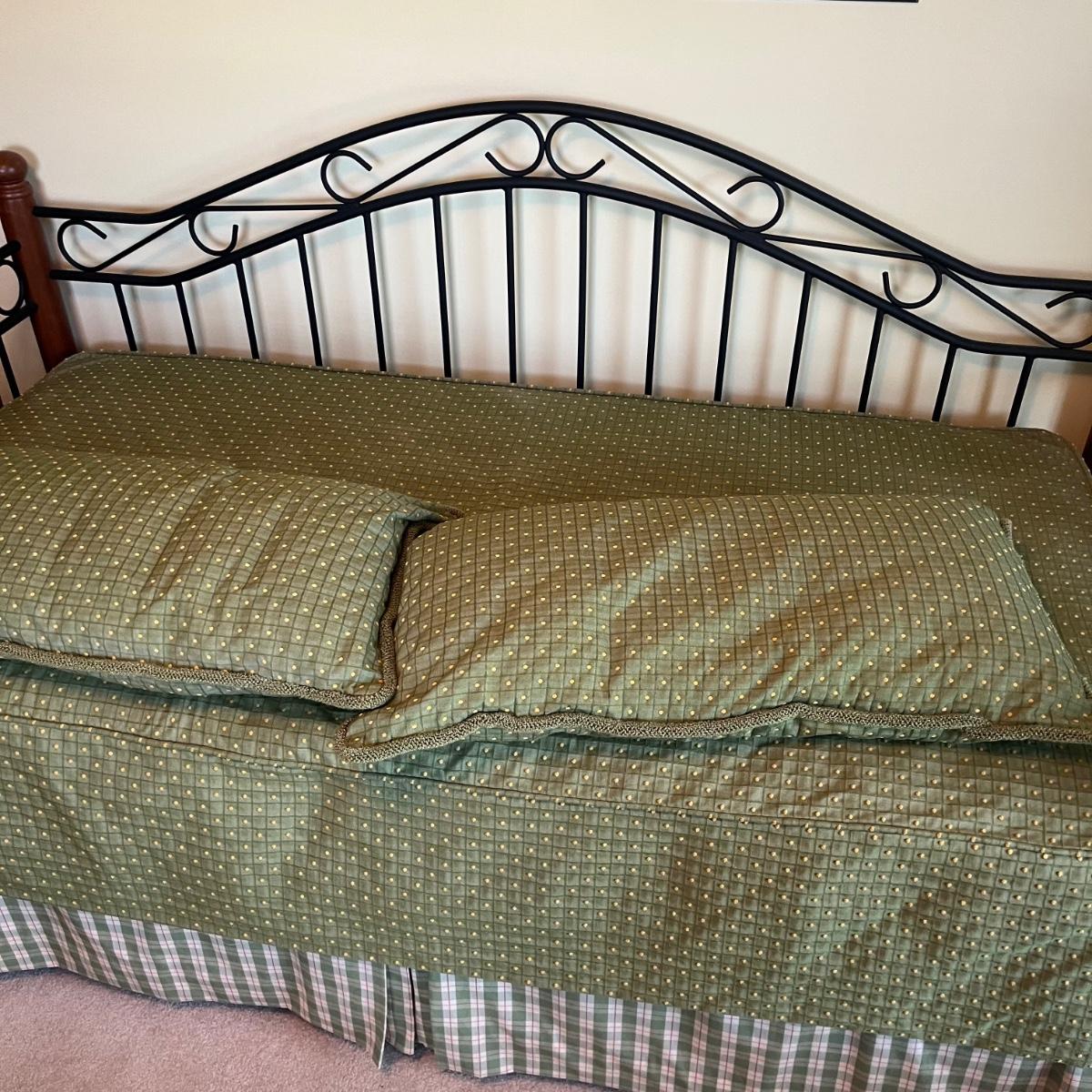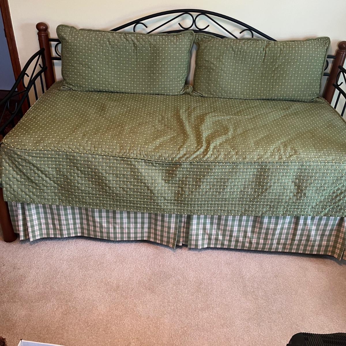Lot includes a wooden and metal framed day bed with a trundle bed underneath. Also includes a cover, sheet, and blanket on top of mattress. There is a bed spread with matching cushions. Both mattresses are twin size. Winning bidder may take mattresses if they choose but are not required to.