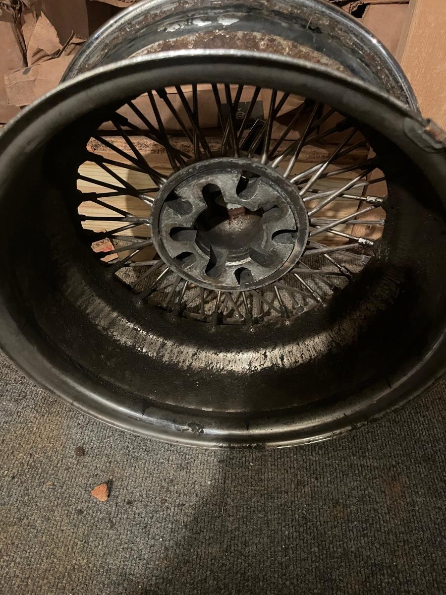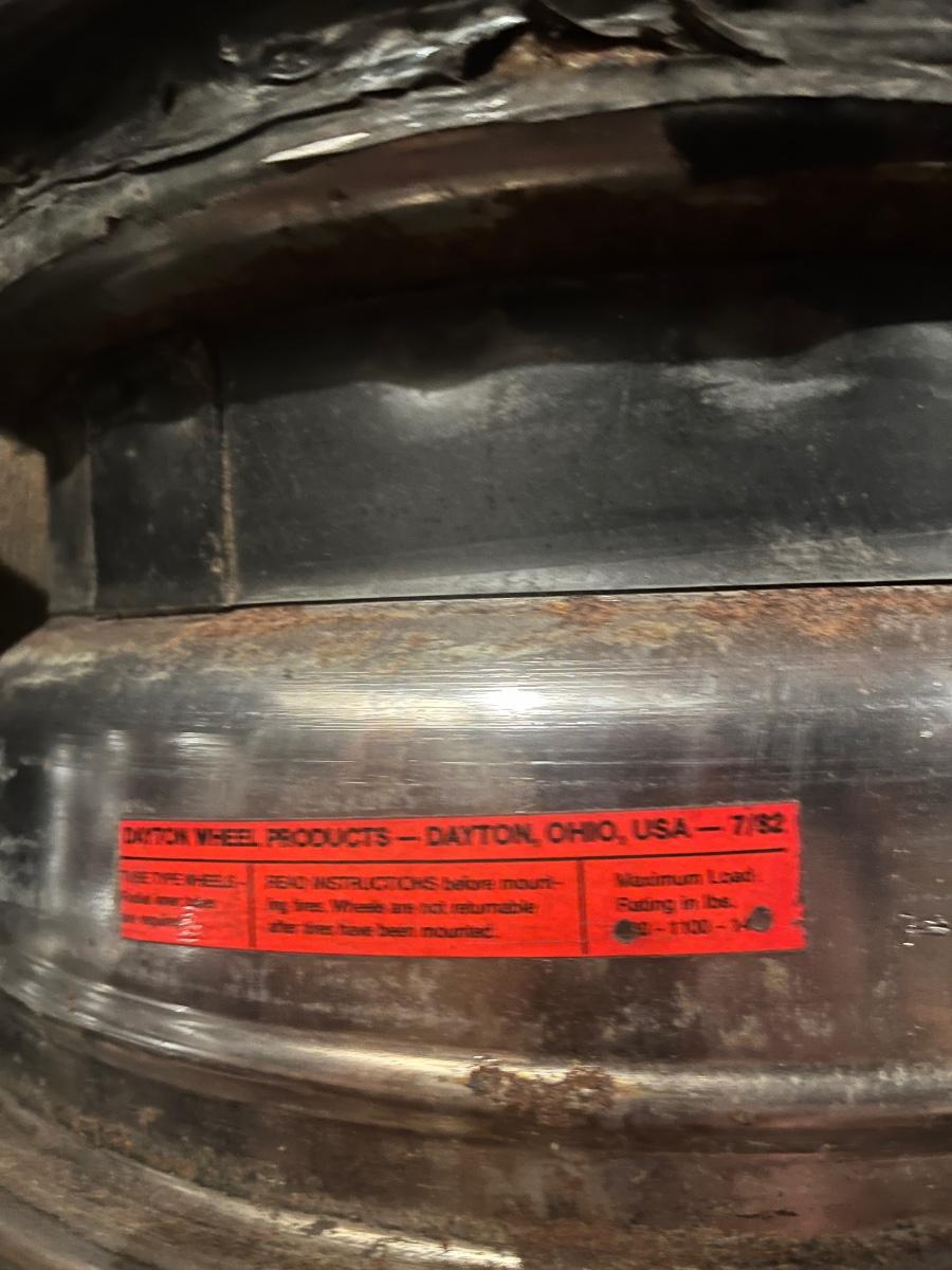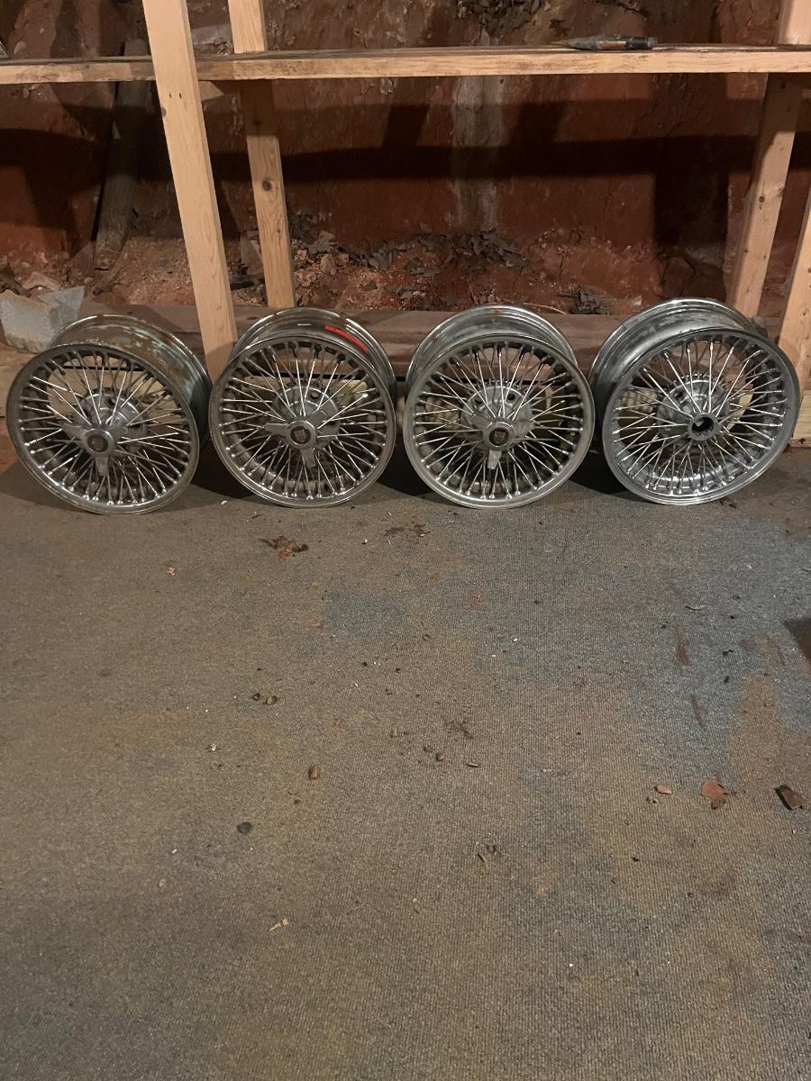 Lot includes four Dayton spoked five lug rims. One cap is missing, see pictures. Rims measure 16.5” H x 8” wide.