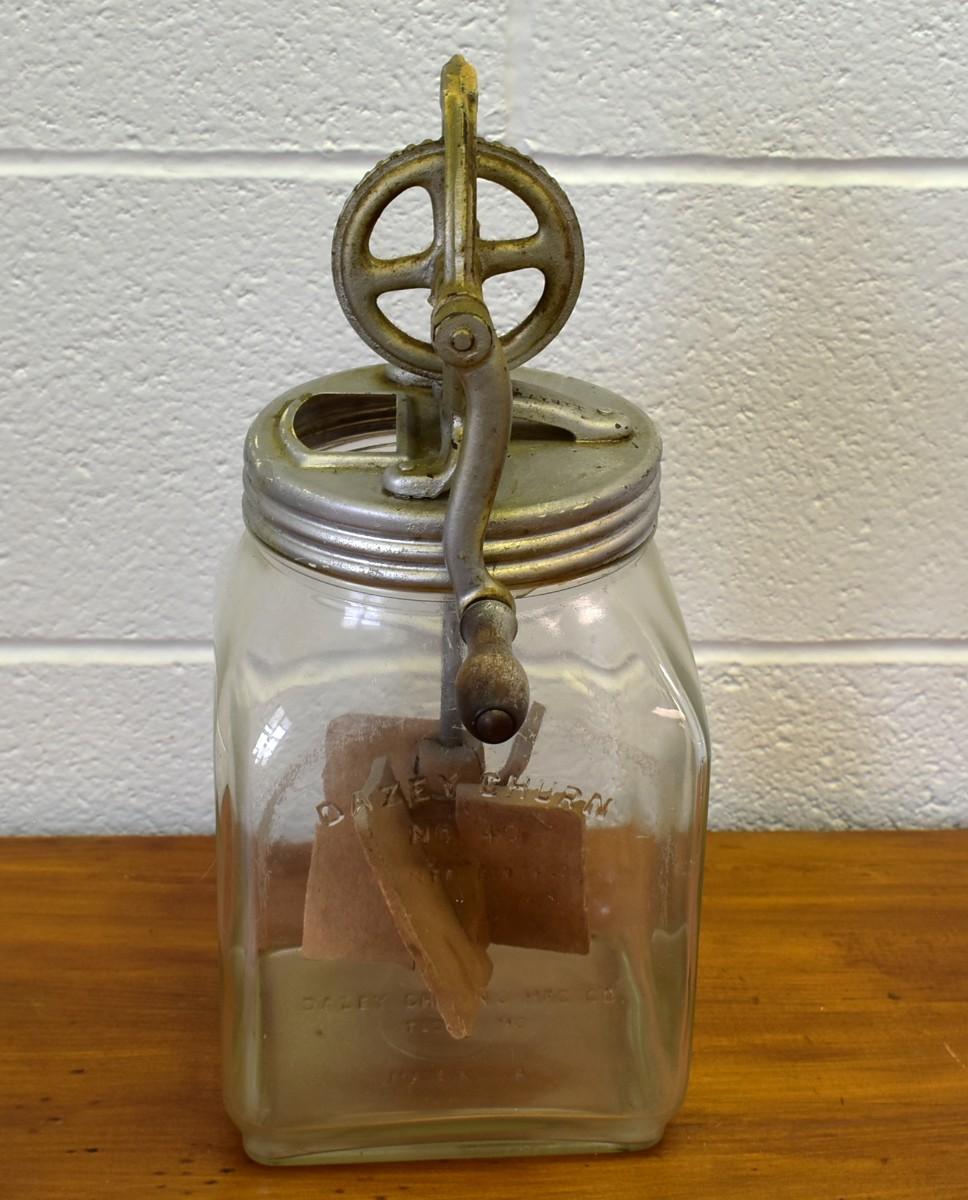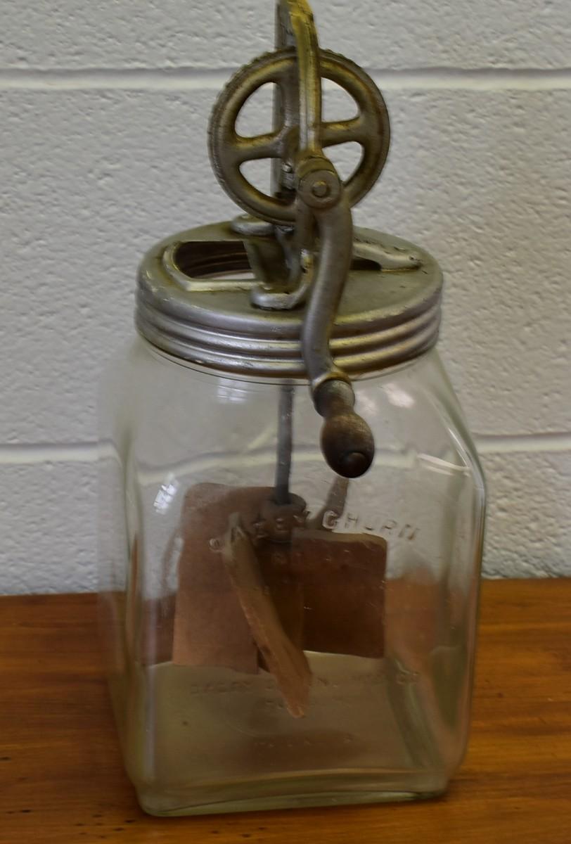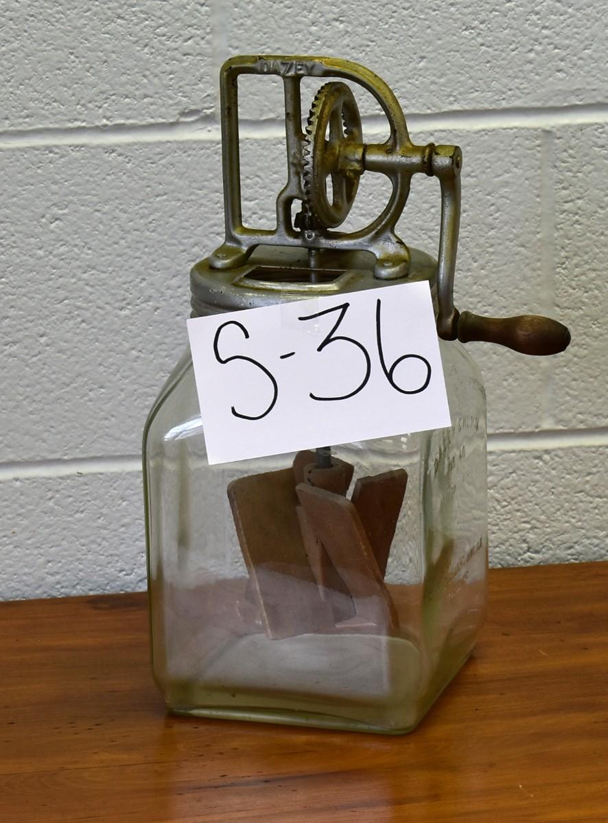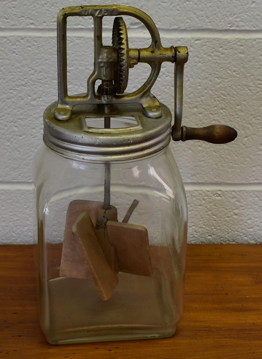 Churn whipping mechanism is in functional order. The cannister is free of any cracks, chips, or breaks. There are a couple of abrasions seen on the face of the cannister