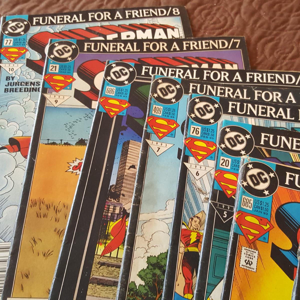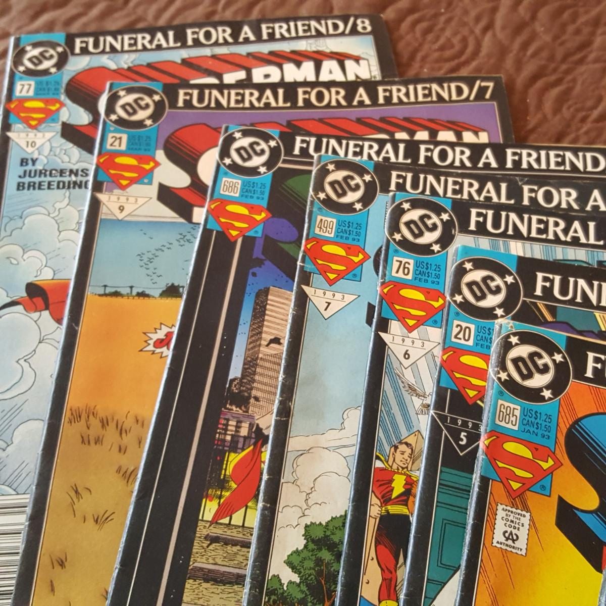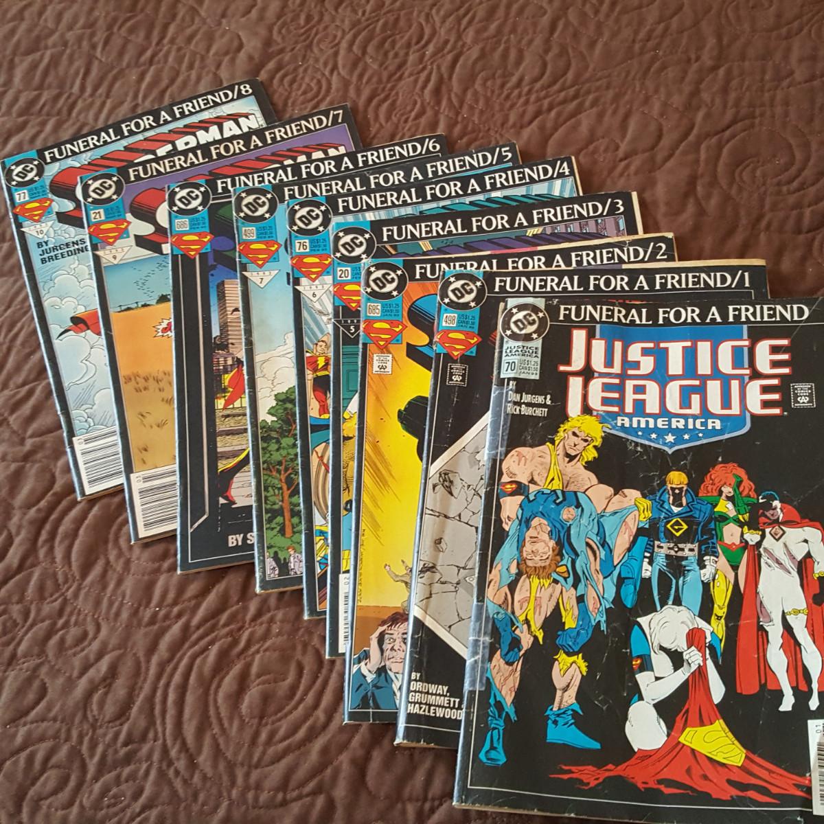 This auction lot is for a collection of DC Comics - Funeral For A Friend Series. This collection contains 9 comic magazines. Numbers 70, 498, 685, 20, 76, 499, 686, 21 and 77. All have the publishing date of 1993. Condition ranges from very good to well read.