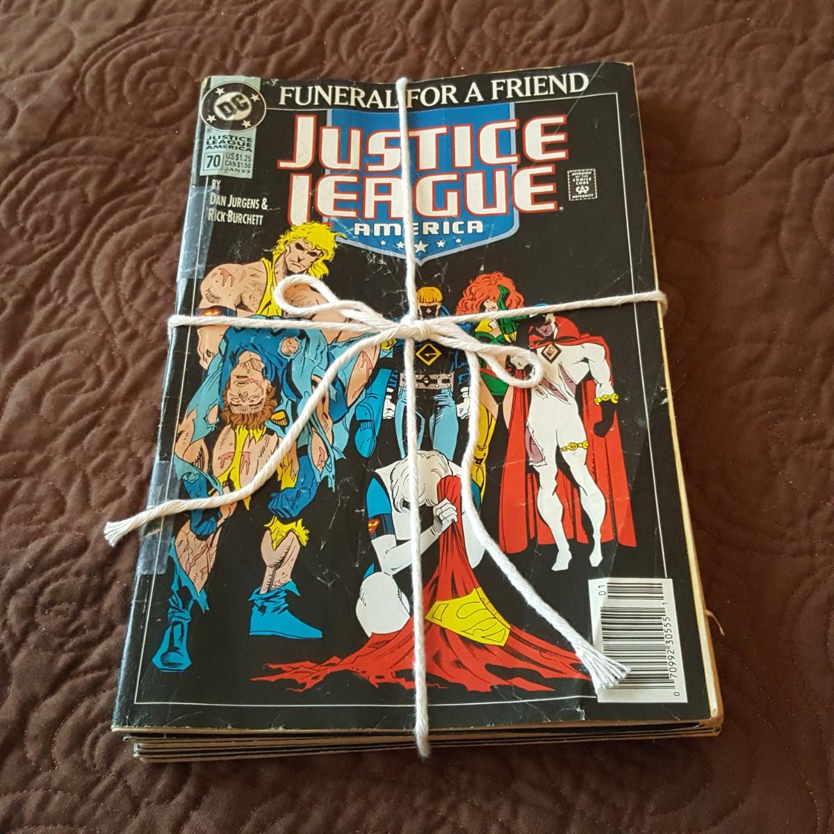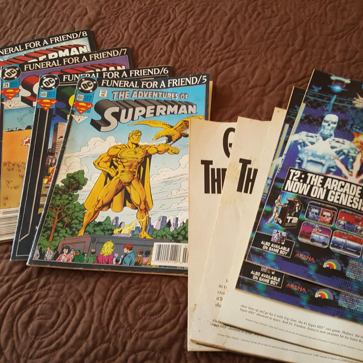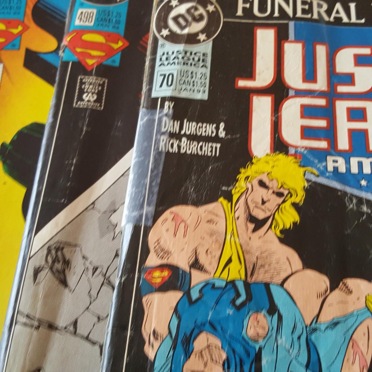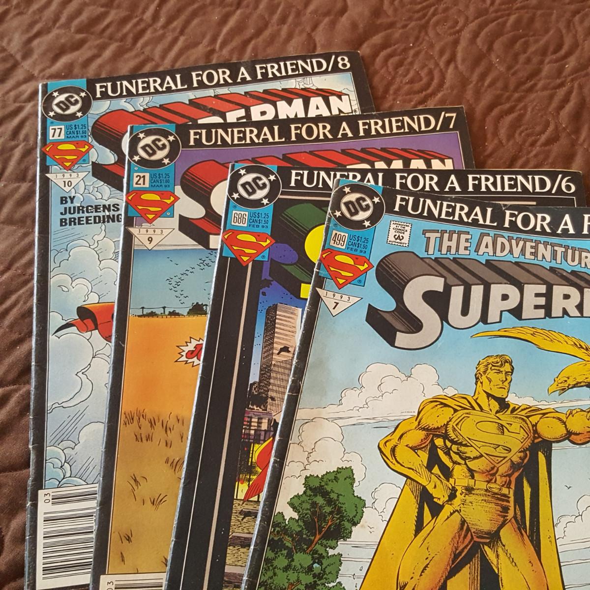 This auction lot is for a collection of DC Comics - Funeral For A Friend Series. This collection contains 9 comic magazines. Numbers 70, 498, 685, 20, 76, 499, 686, 21 and 77. All have the publishing date of 1993. Condition ranges from very good to well read.