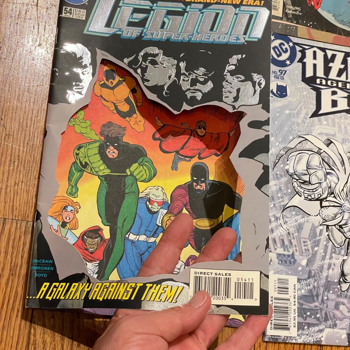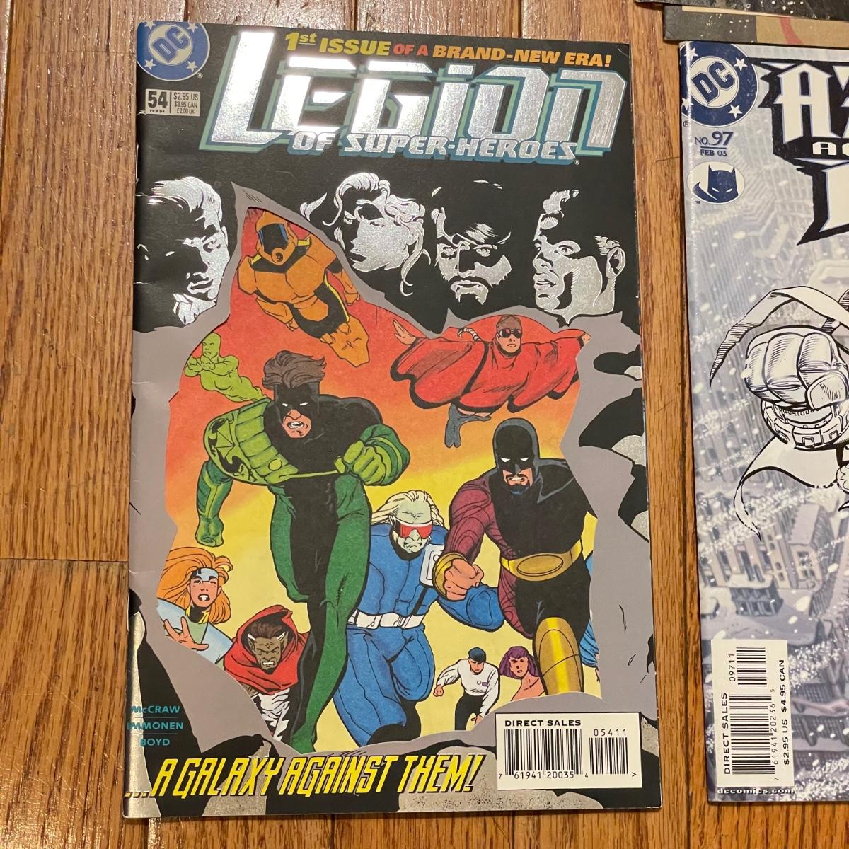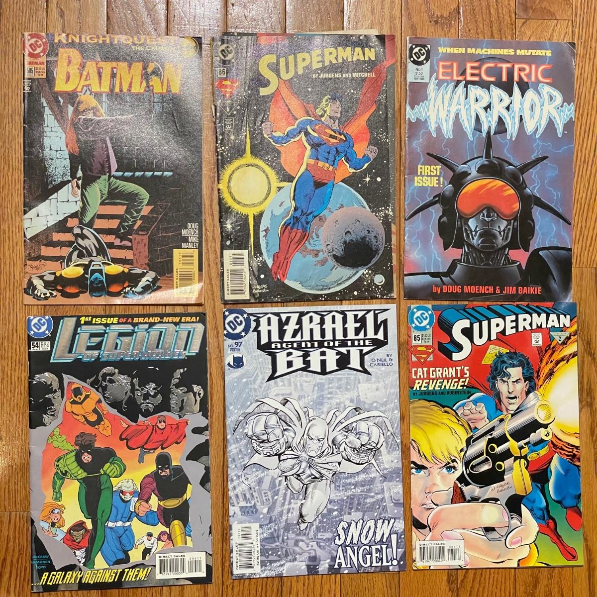 Six DC Comics including two Superman, the “1st issue of a brand new era!” Legion of Super-Heroes #54, Electric Warrior, Batman and Azrael Agent of the Bat. Superman #86 has its cover removed and a slight tear in it. See images. Shipping available.