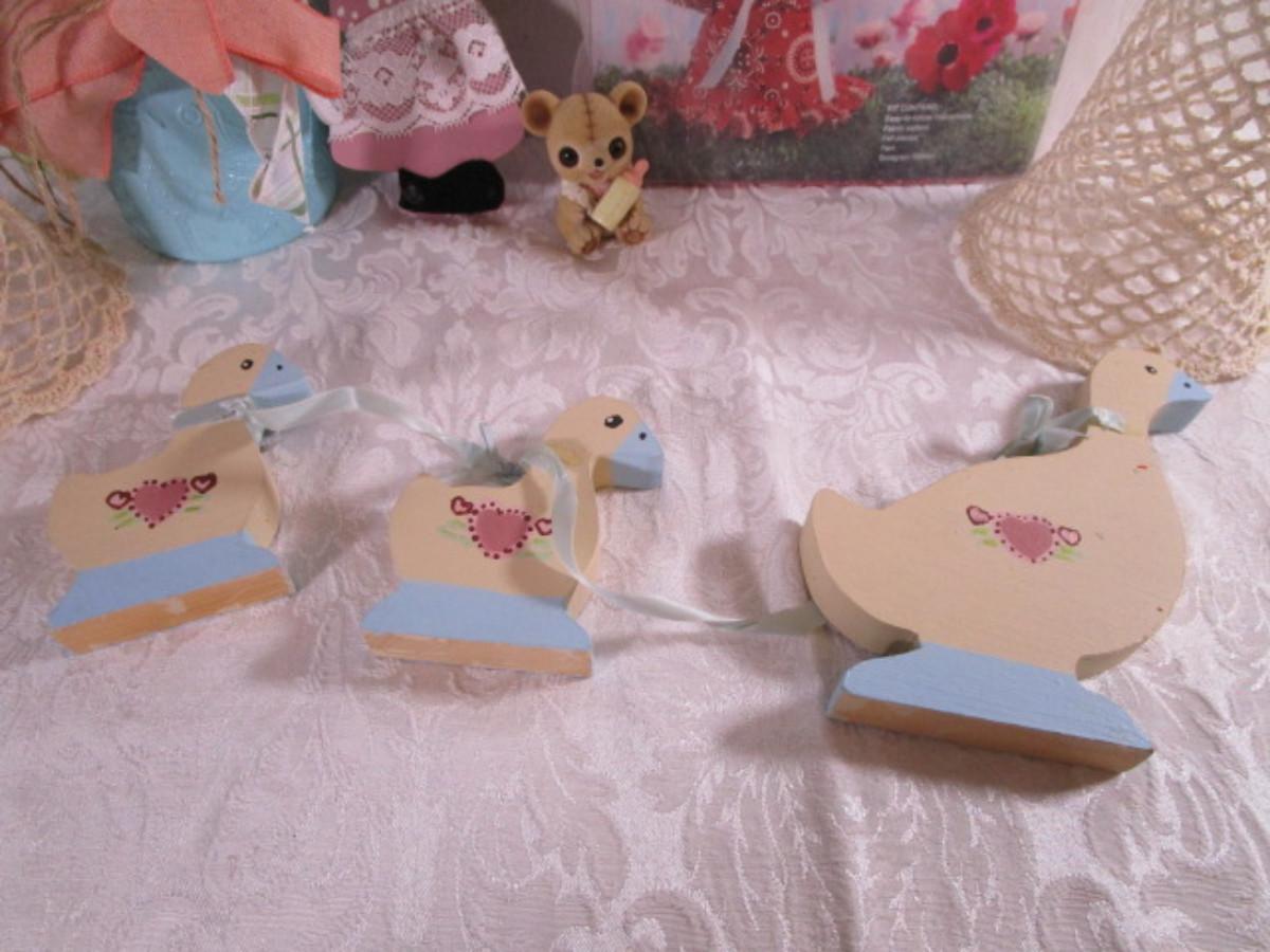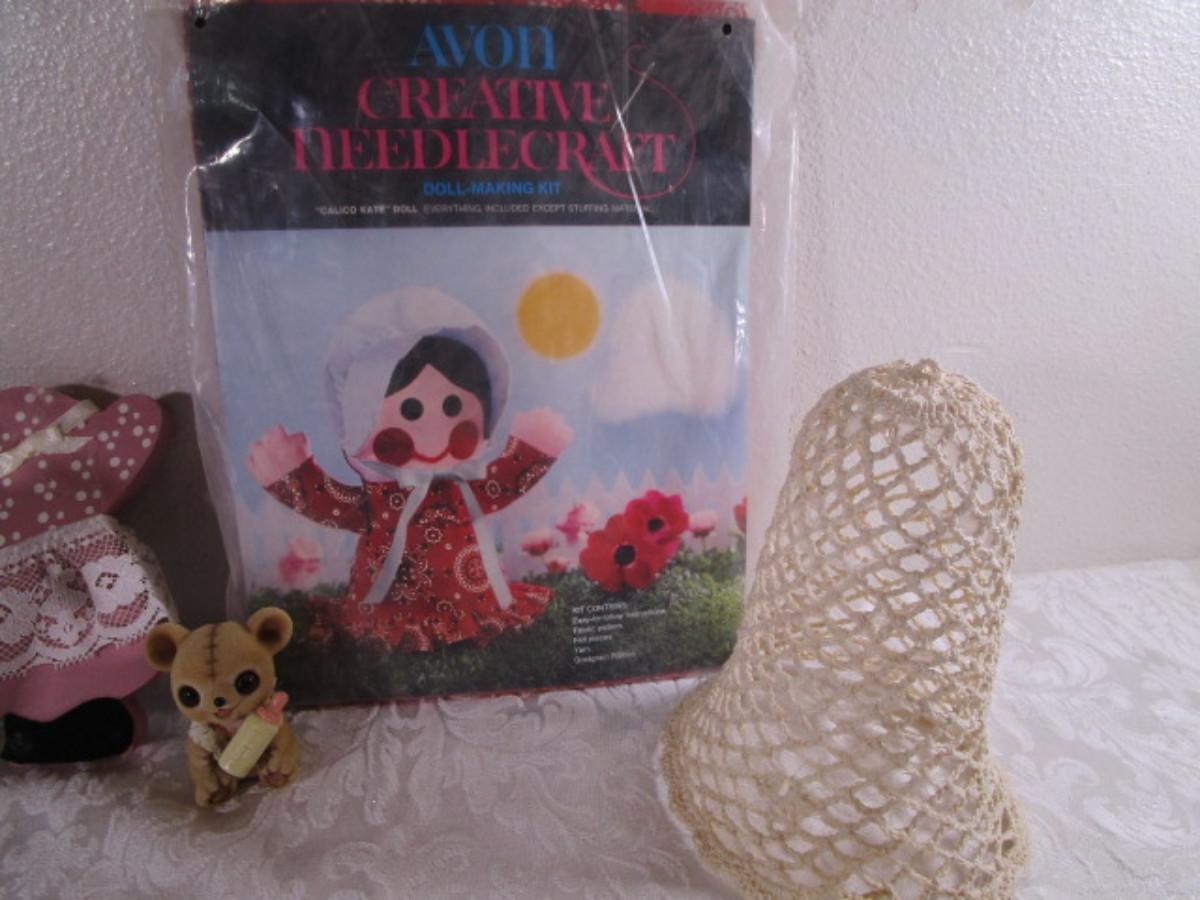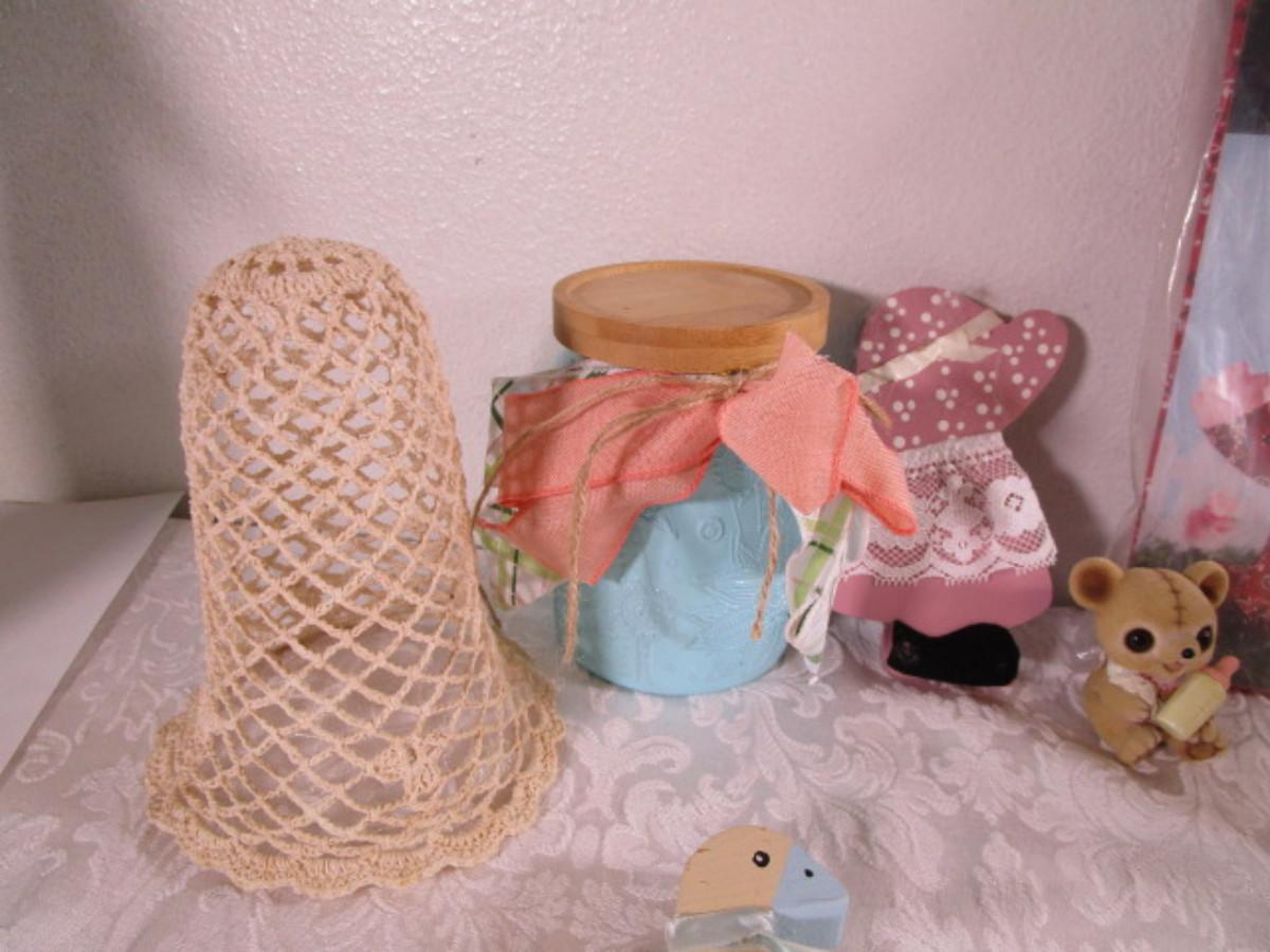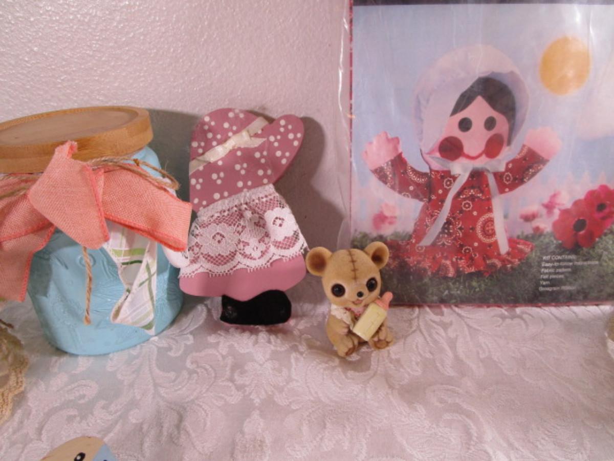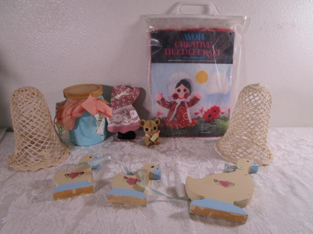 Decorative jar 5-3/4" tall x 4" in diameter, wood cutout doll 7", Needlecraft dollmaking kit, 2 crocheted bells 7" tall, 3 wooden geese hanging (big goose is 7" others are 4", bear figurine 2-1/2"