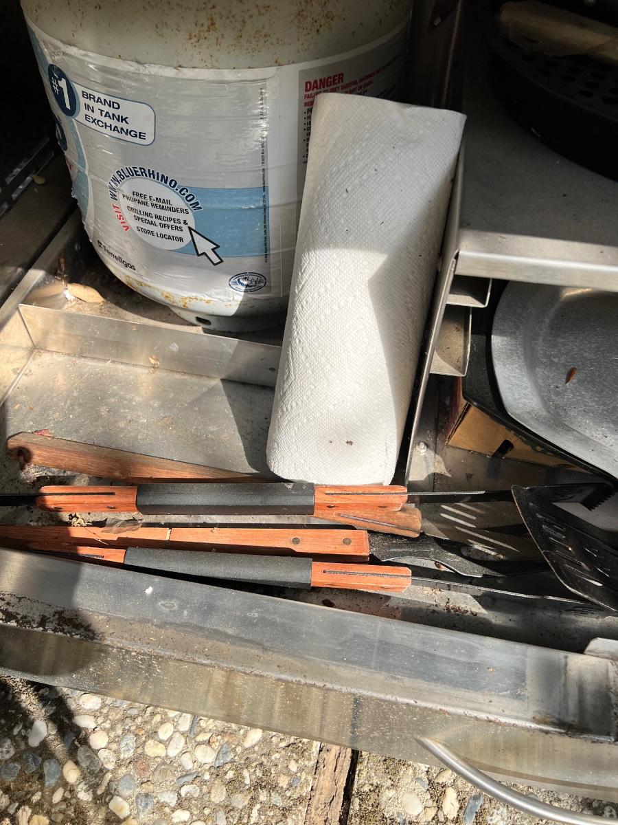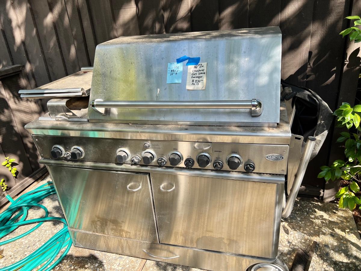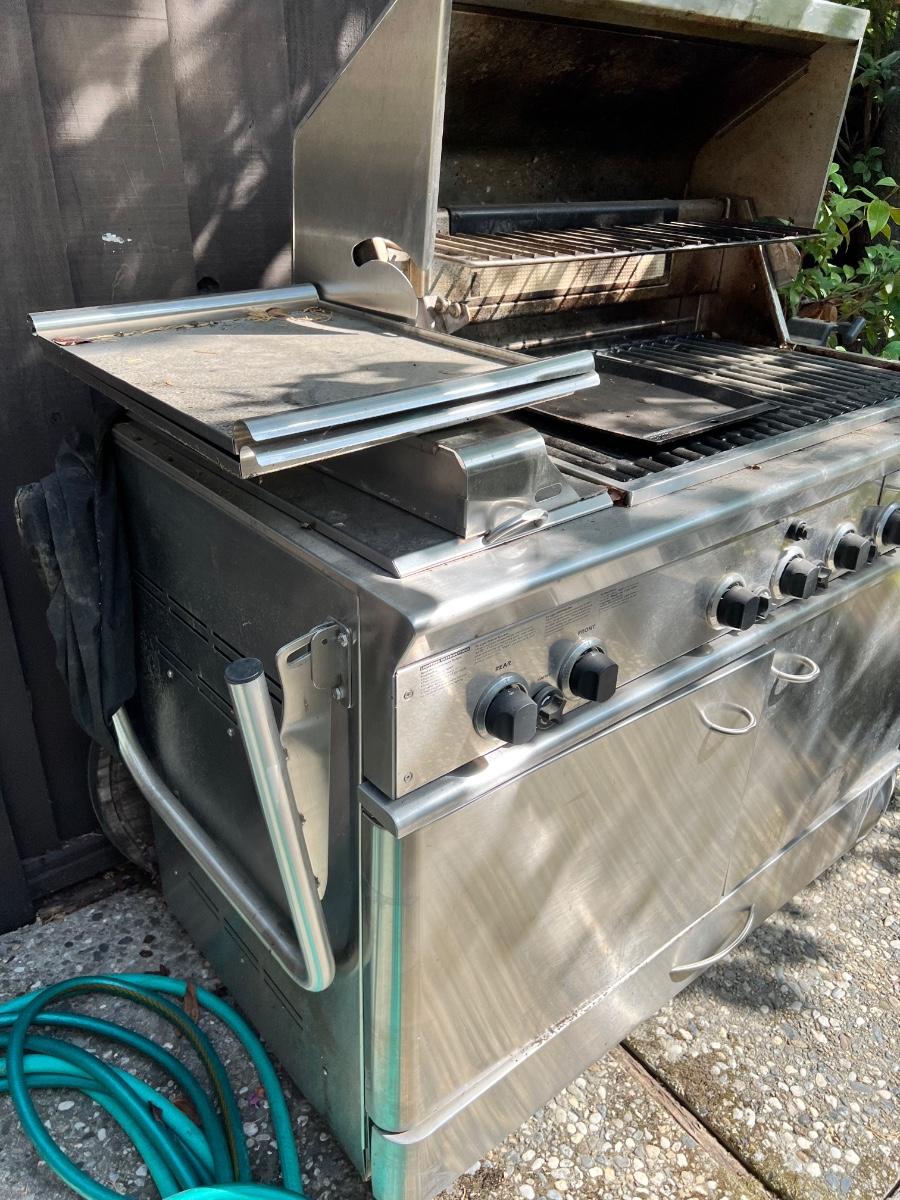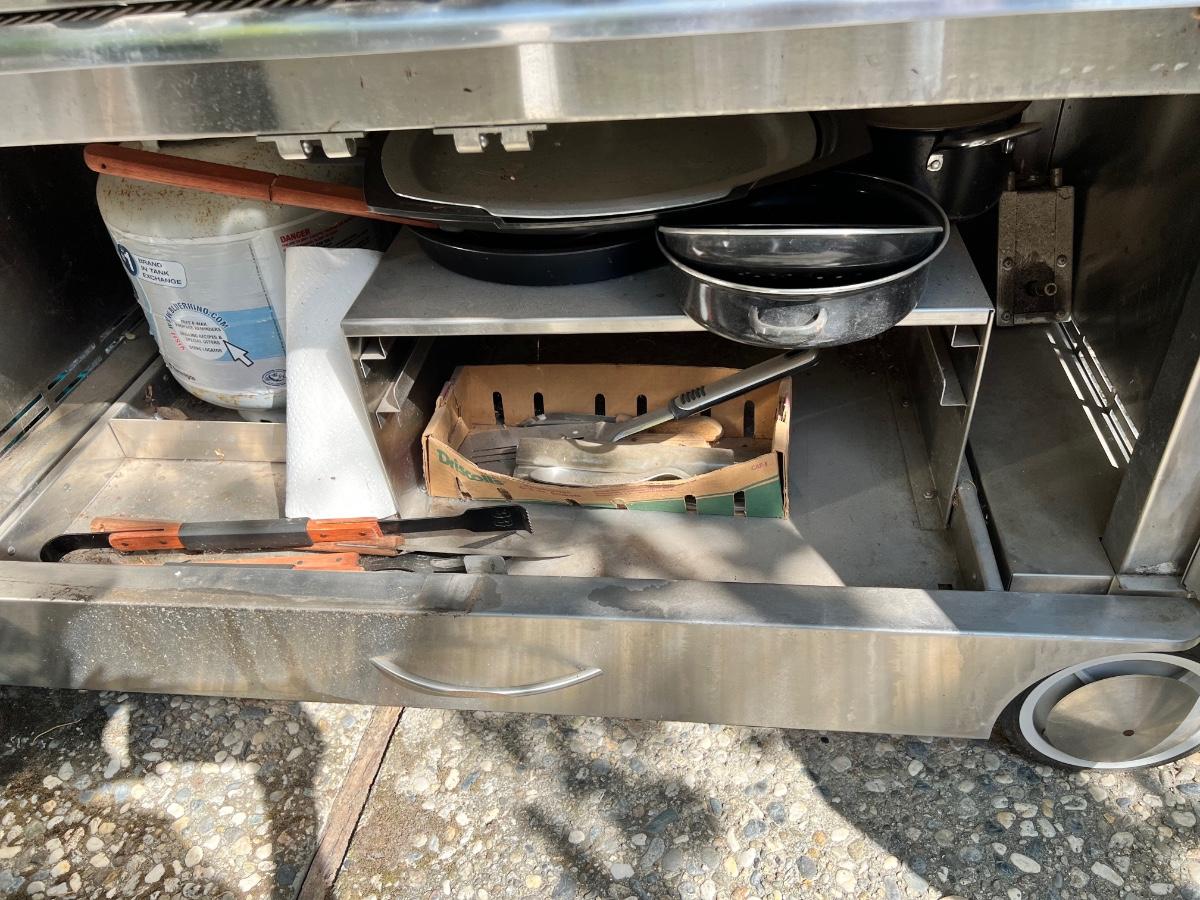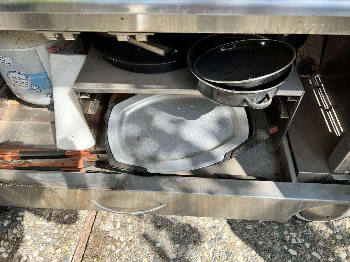 48 x27x 54 with two extension tables that fold out, cover, utensils, pans retails over 15k