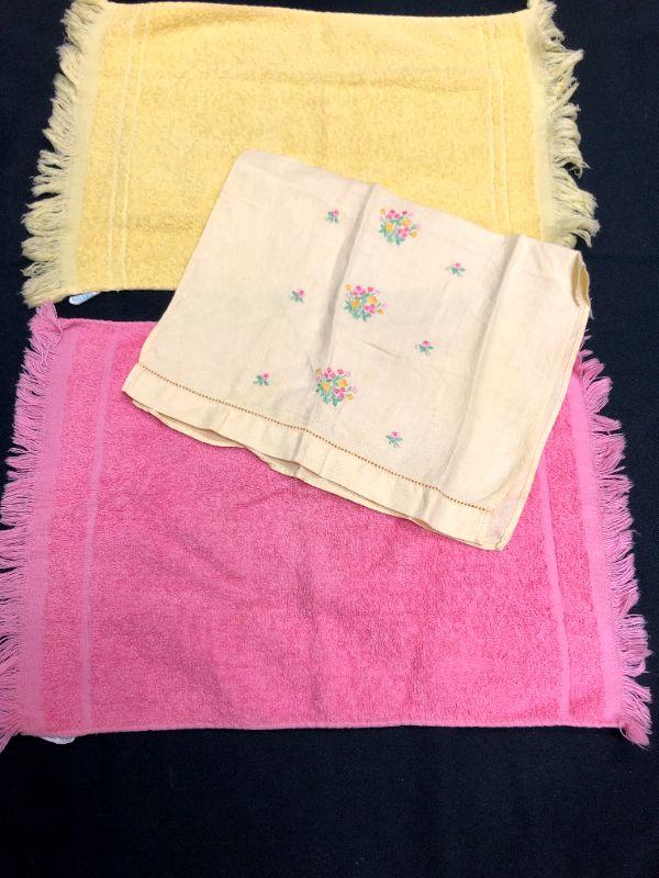 Pair of vintage fringe edge hand towels. Bright pink and yellow. Good condition. Included is a pastel yellow napkin/handkerchief. It is embroidered with small flowers on one half.