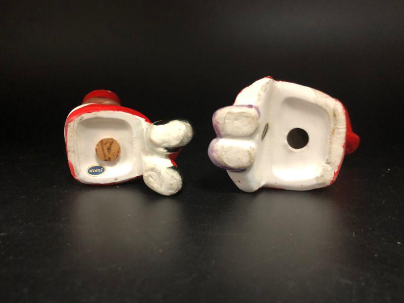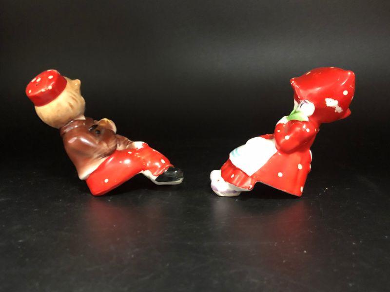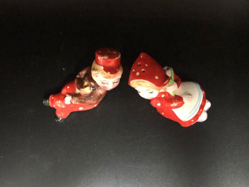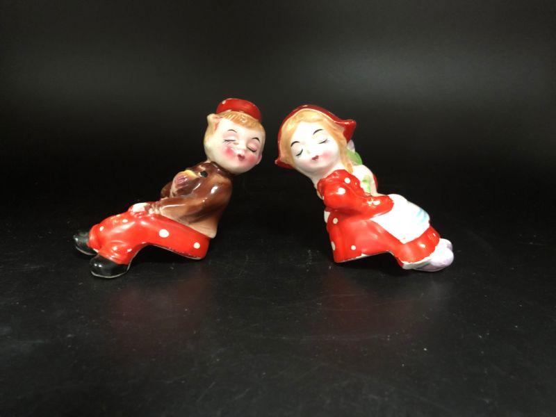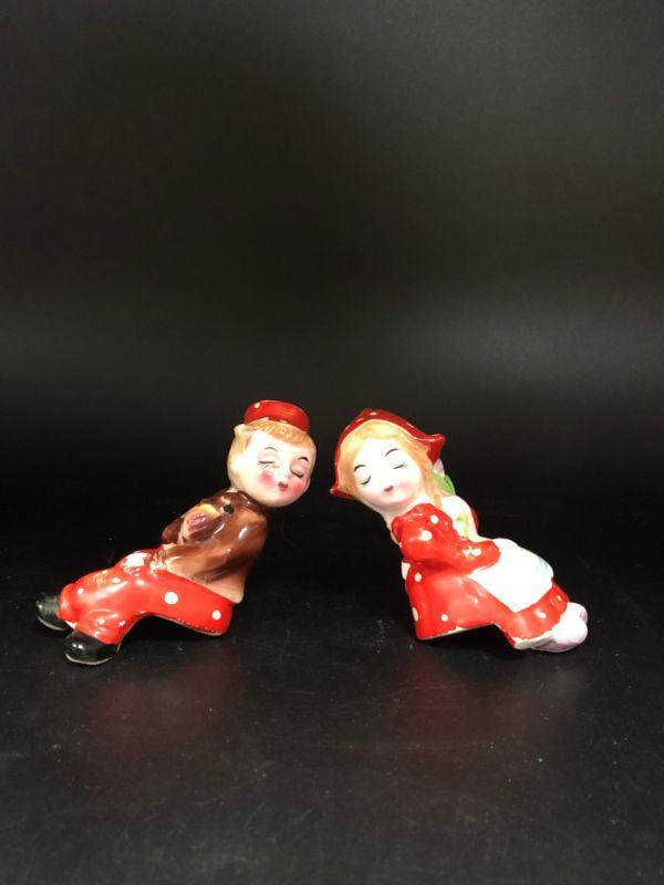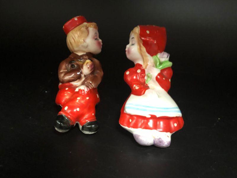 Dutch boy & girl in red shaker set. They look to be kissing each other. Could be set on a ledge as they are in a seated pose. Girl is missing her stopper. Made in Japan.