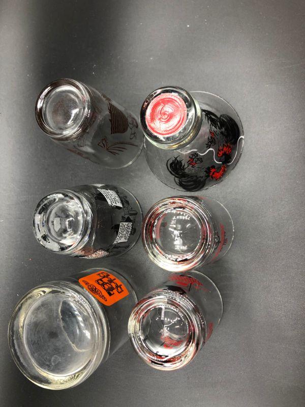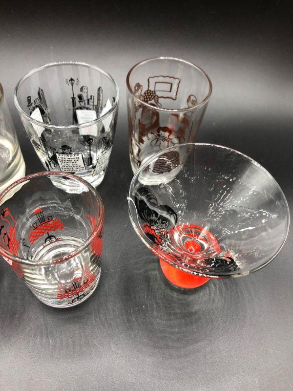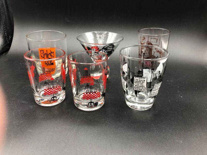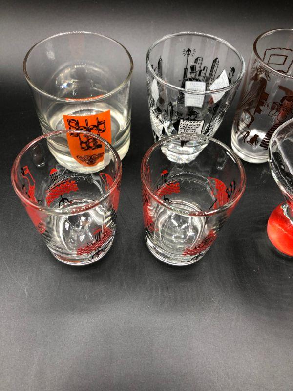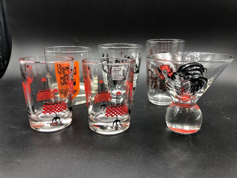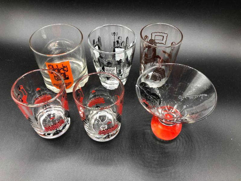 Set of 6 barware drink glasses. Mix of designs. Two are a matching pair. Good vintage condition.
