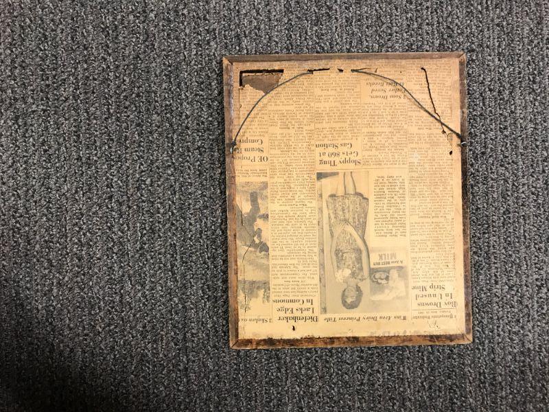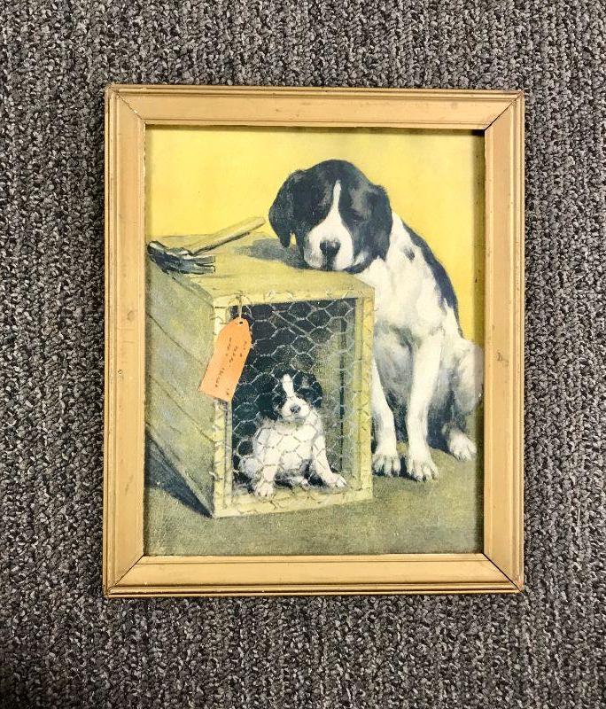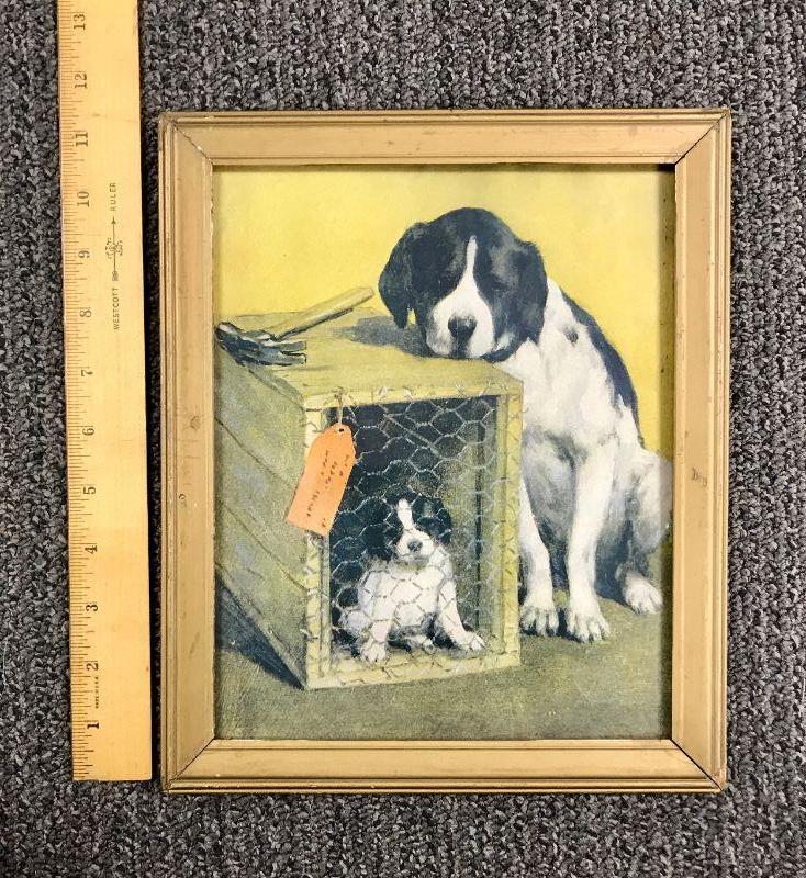 Dog print. Sad looking dog with puppy in crate. Under 12".