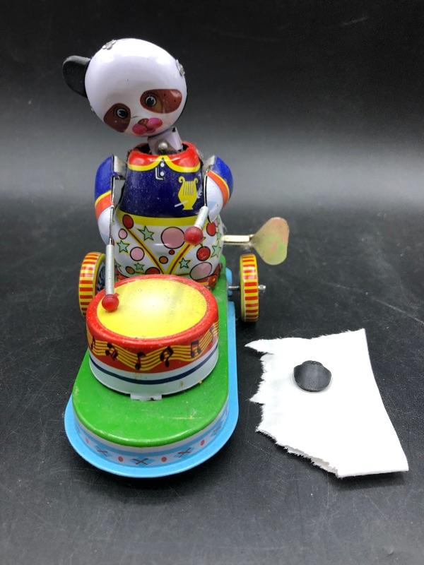 Wind up panda bear drummer toy. Litho tin toy, one ear has fallen off. May be newer, Made in China.