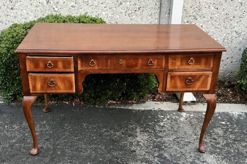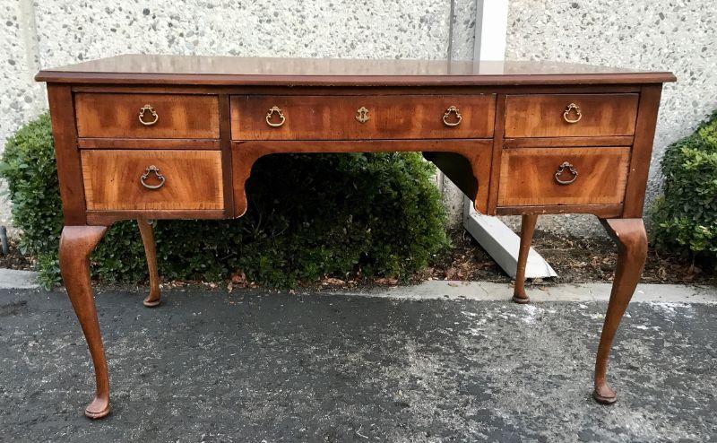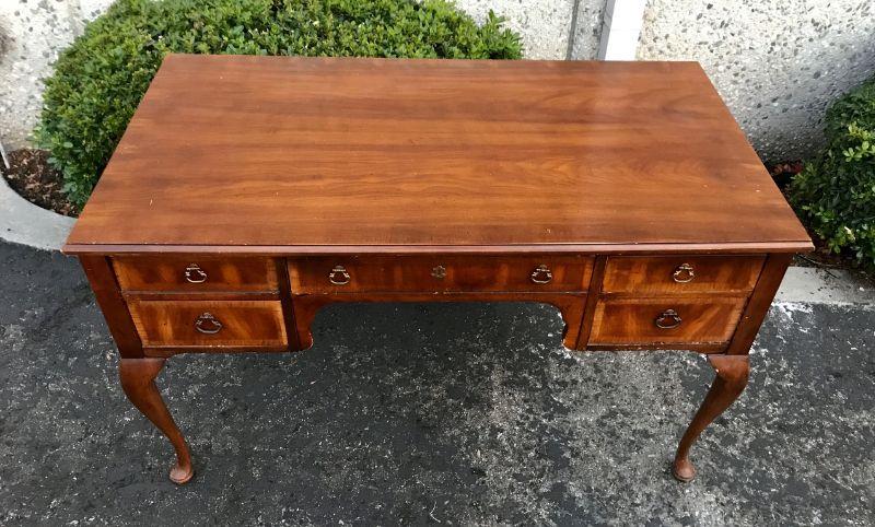Antique style writing desk. Medium stain finish. Curved legs. 5 drawers with the center locking. Measures 30"h x 49"w x 26"d. Good previously owned condition.