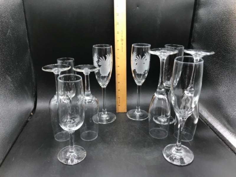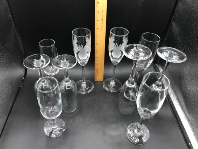 Mixed lot of champagne flutes. Two have pineapples etched into them. All are in good condition.