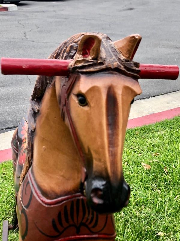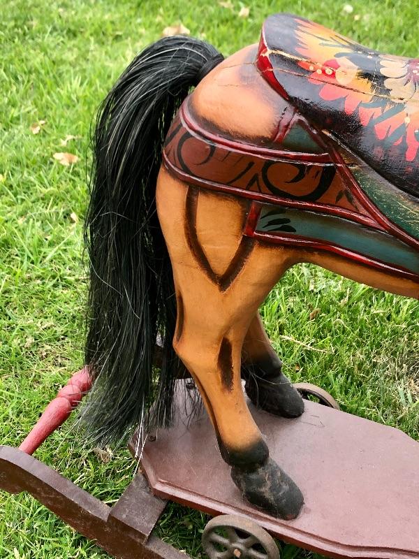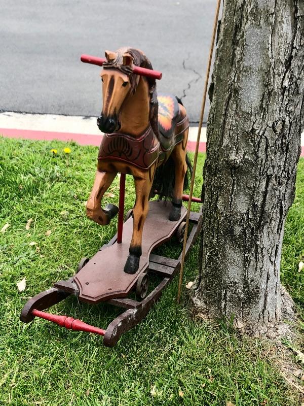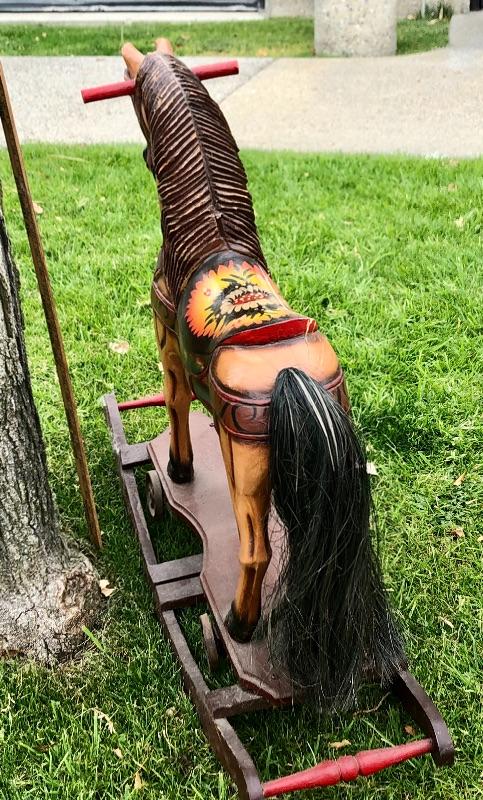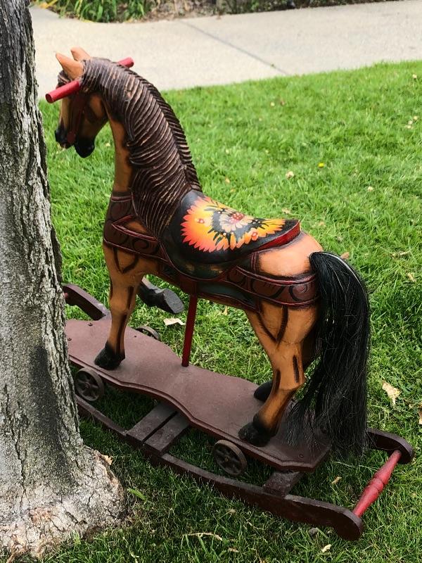 Large vintage carved wood rocking horse. Stands at about 24". Horse stands on a wheeled platform that was connected to a wood platform. It does have a couple cracks in the wood from age but is in wonderful vintage condition. Displays lovely, not recommended for children because of the cracks, may be unsafe.