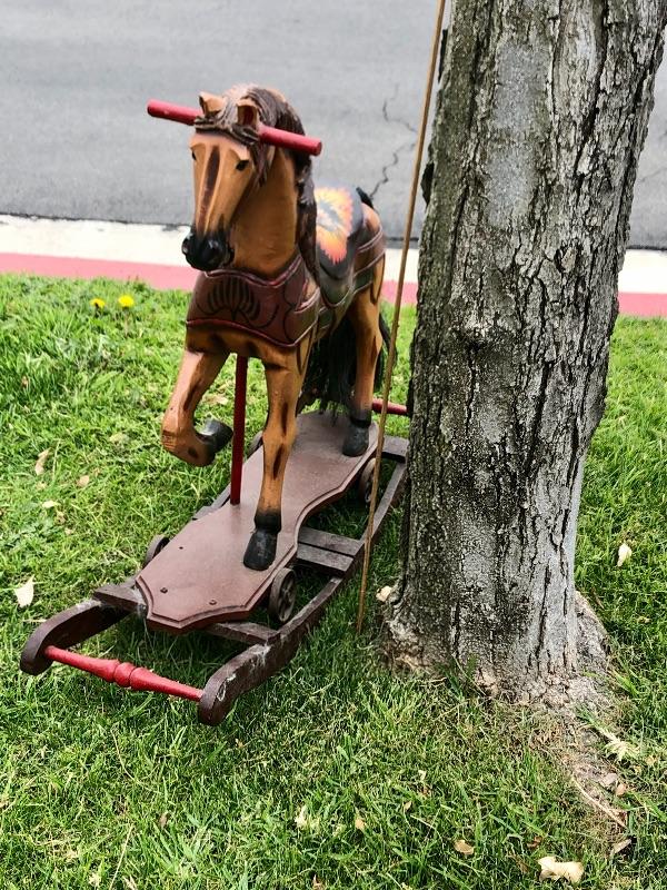 VINTAGE LARGE WOODEN PLATFORM ROCKING HORSE WITH WHEELS YD#020-1220-00147