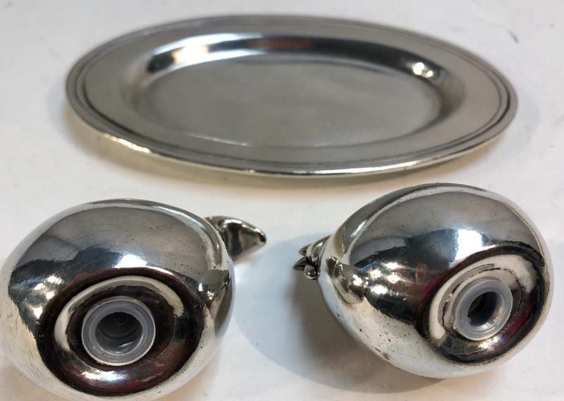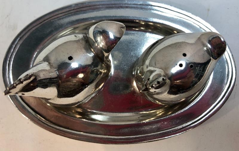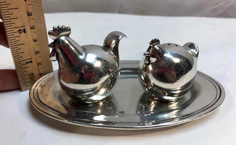 Pierre Deux Silverplate Pewter Rooster & Hen Chicken Salt & Pepper Shakers with Tray