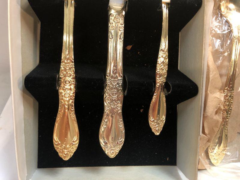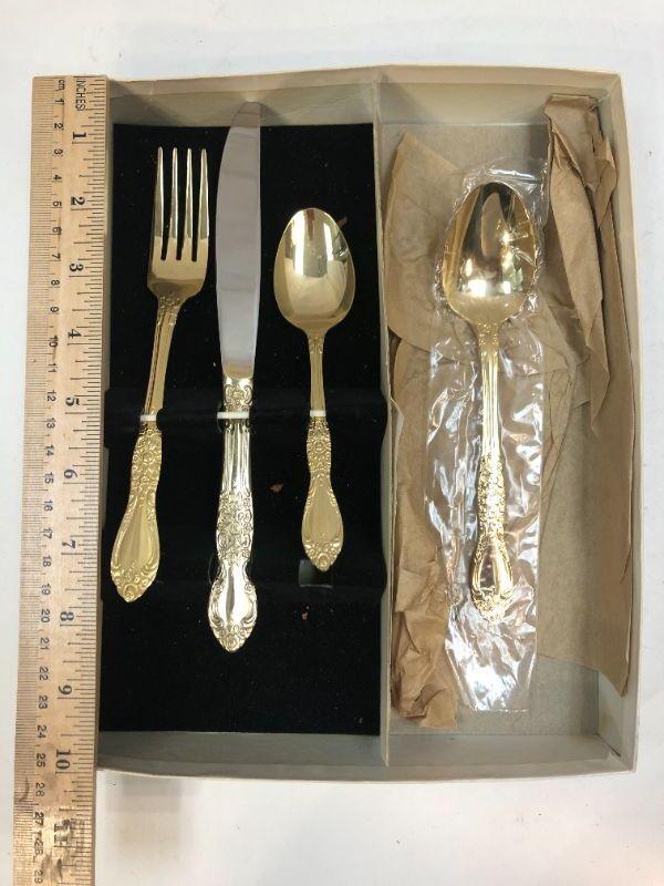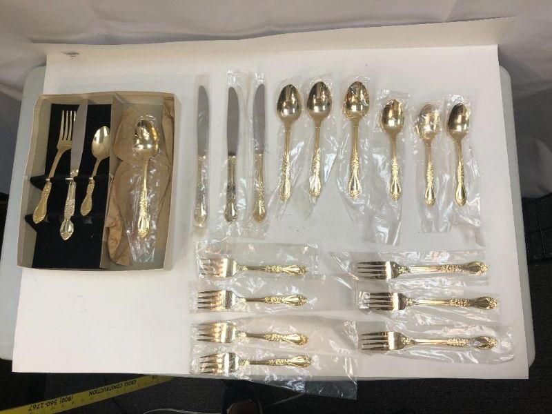 New, most in plastic, Gold tonne flatware set. 5 piece service for 4, 20 pieces total.
