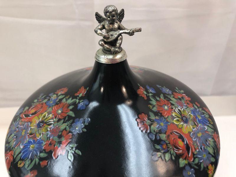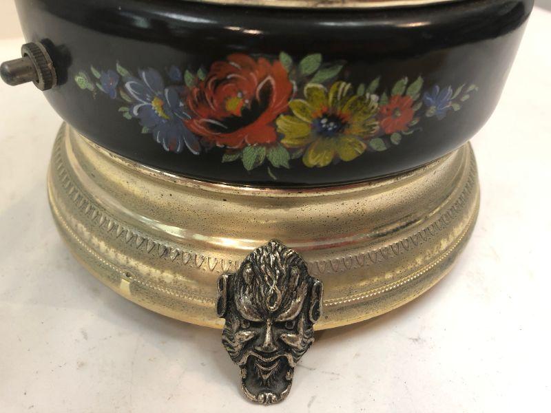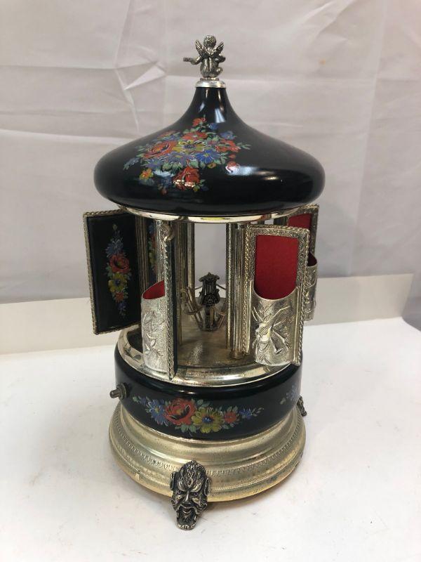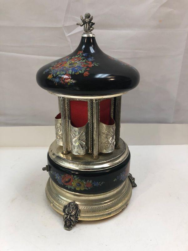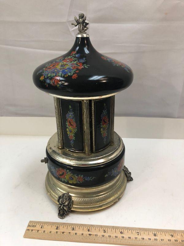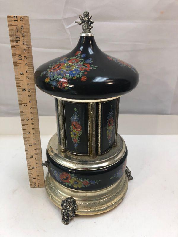 Vintage Reuge music box. Interesting Italian music box is a lipstick holder, doors open and close. In great vintage condition. Works, plays "Raindrops Keep Falling On My Head". Black with flowers on the outside, silver tone inside. A little over 12" tall. #022-0470