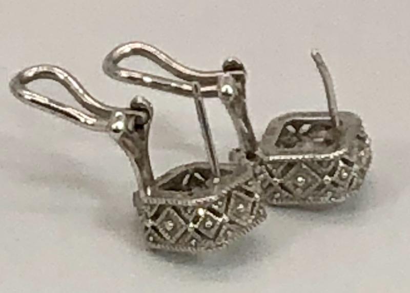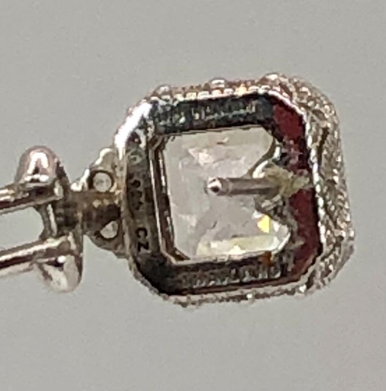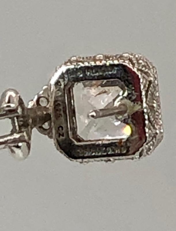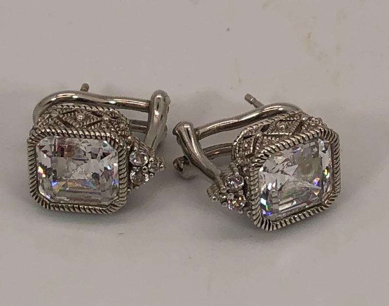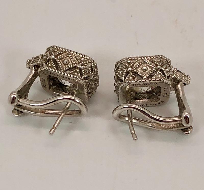 Beautiful Judith Ripka Diamonique sterling silver stud earrings. Ornate sterling setting with what looks like a cushion cut cubic zirconia. Great sparkle. About 1/2" size. #020-05091