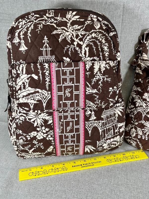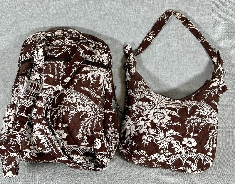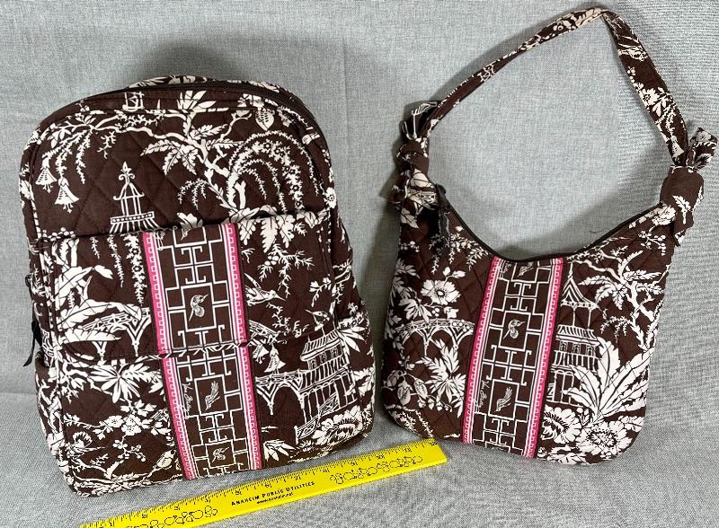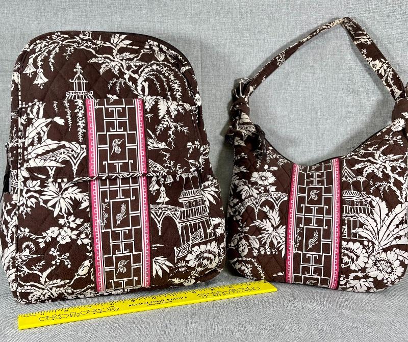 Matching set of Vera Bradley IMPERIAL TOILE bags. Zipper backpack and a hobo shoulder bag, Brown with with and pink floral Asian inspired design. Both in good condition.