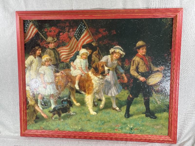 Framed painting of patriotic children titled "American Parade" by George Sheridan Knowles. Nicely done reproduction print. About 30" wide.