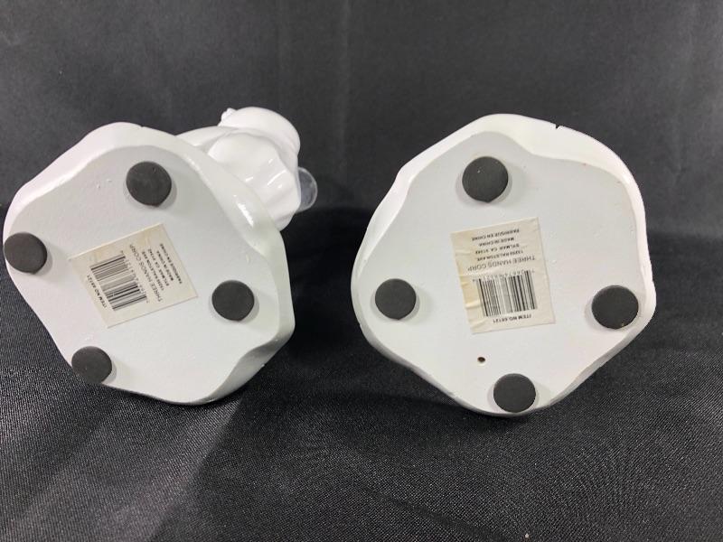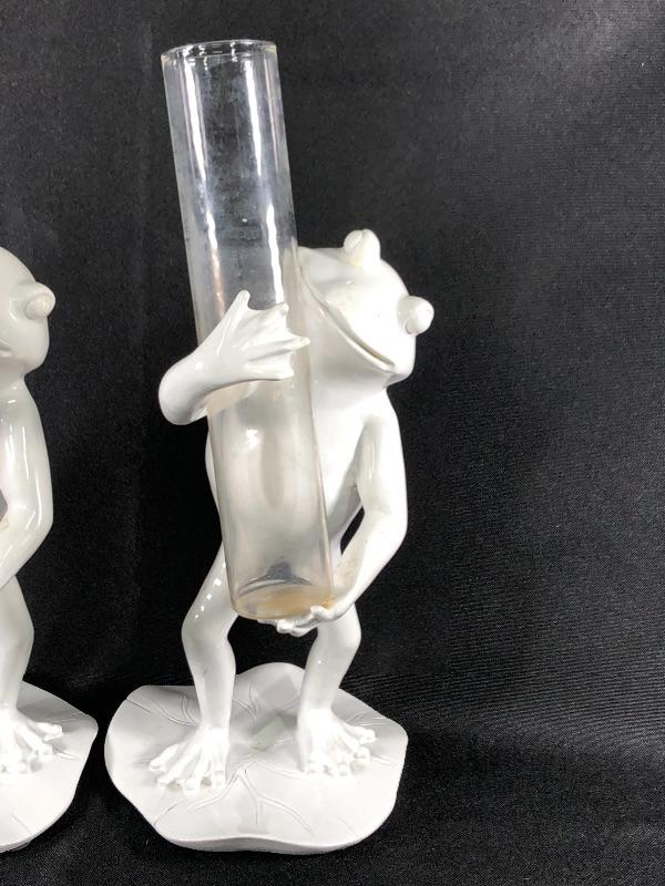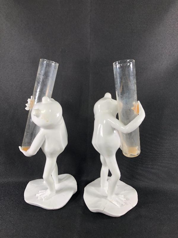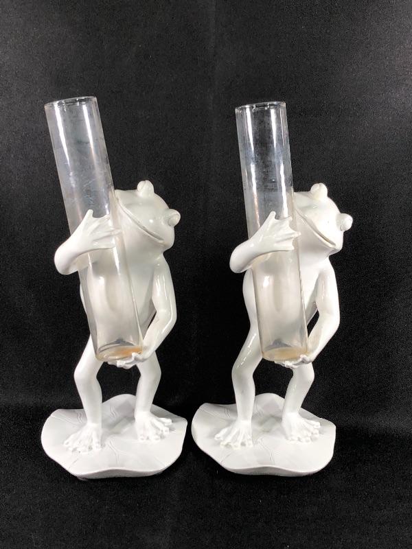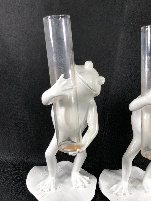 Pair of white standing frogs holding glass bud vases. Need to be leaned a little but in good condition. #24-20013