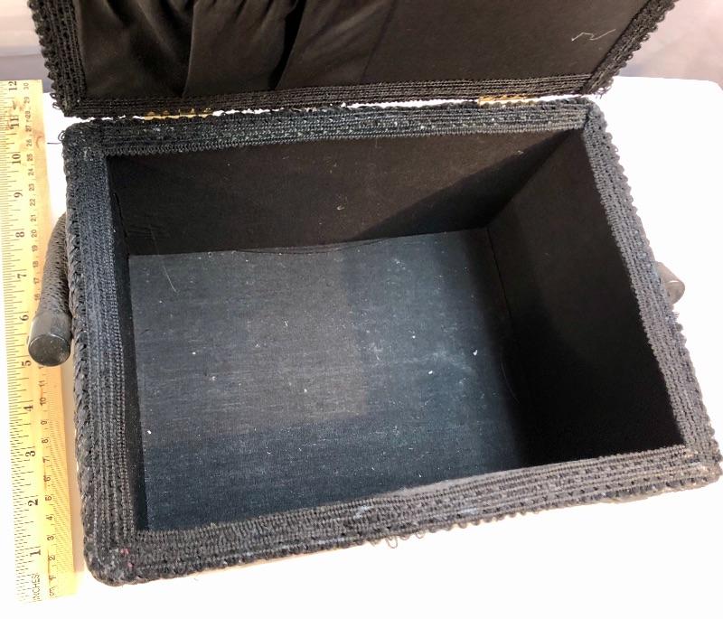 Small sewing box. Covered in sewing themed fabric. Good condition.