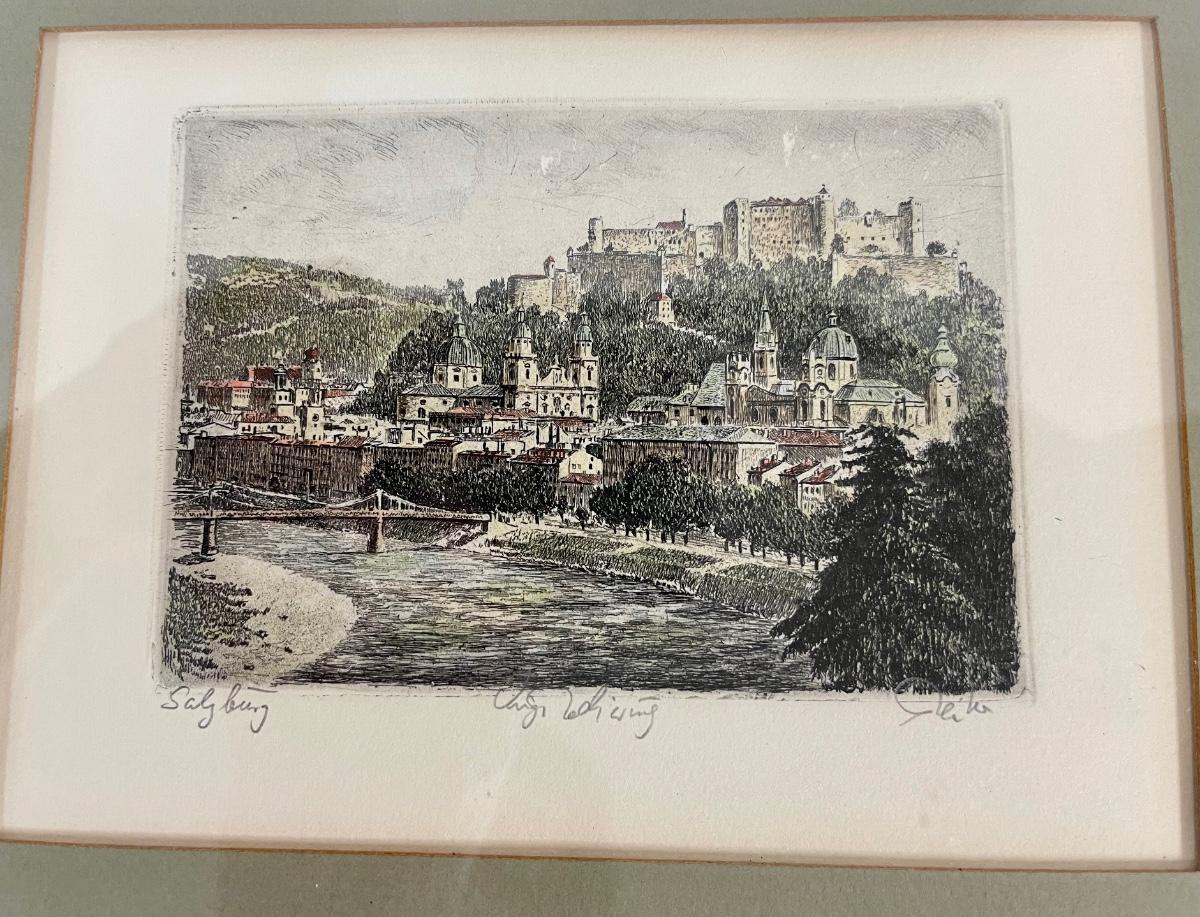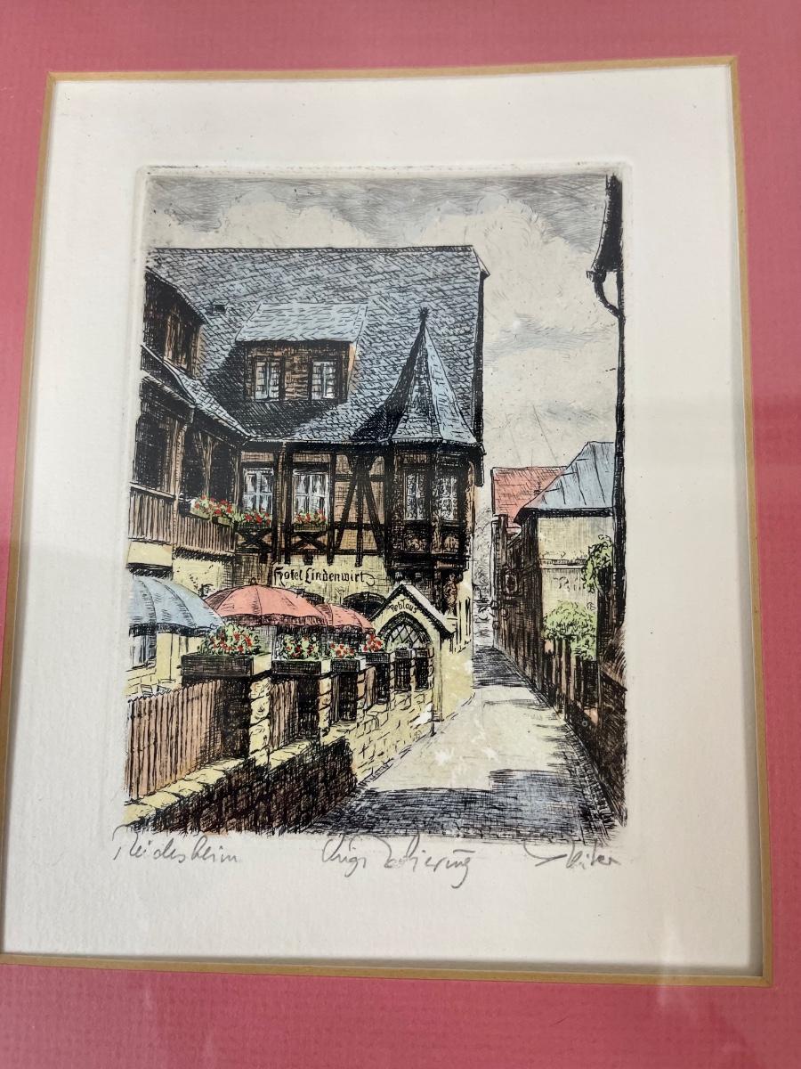 Pair of Vintage Town Castle Street Scene Colorized Etchings Artist Signed. In good vintage condition.