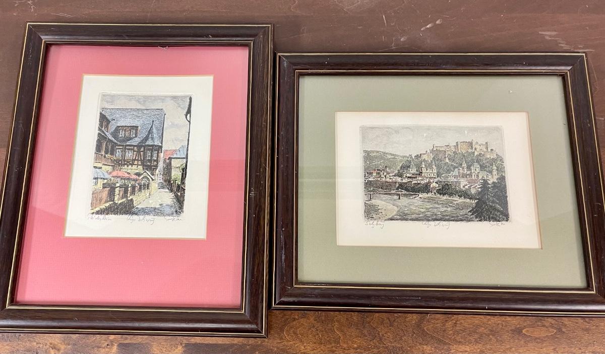 Pair of Vintage Town Castle Street Scene Colorized Etchings Artist Signed
