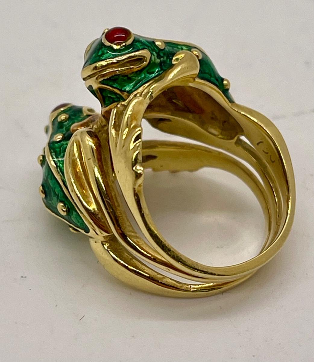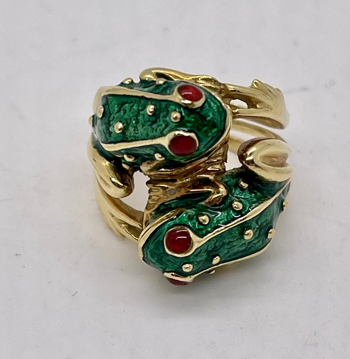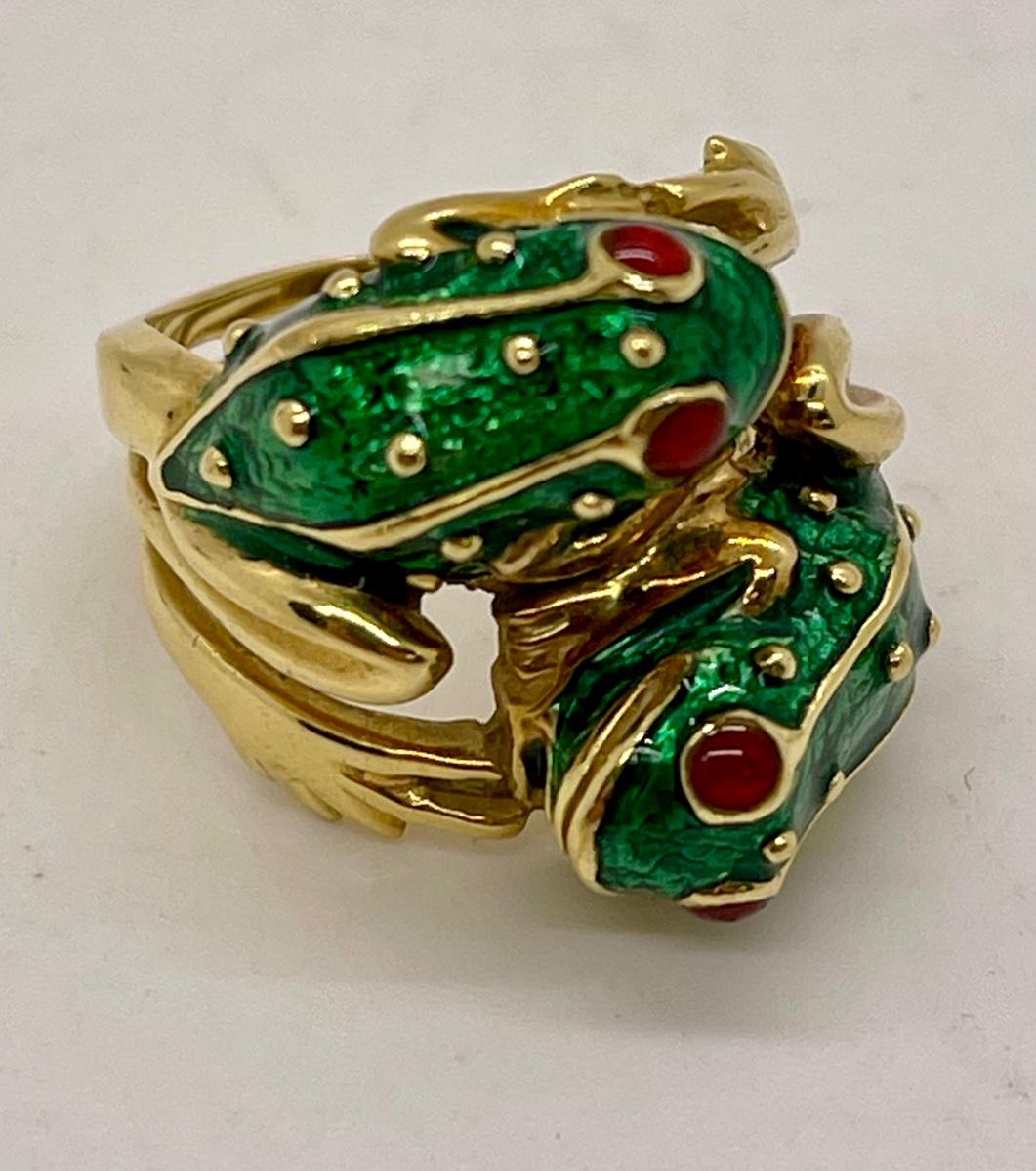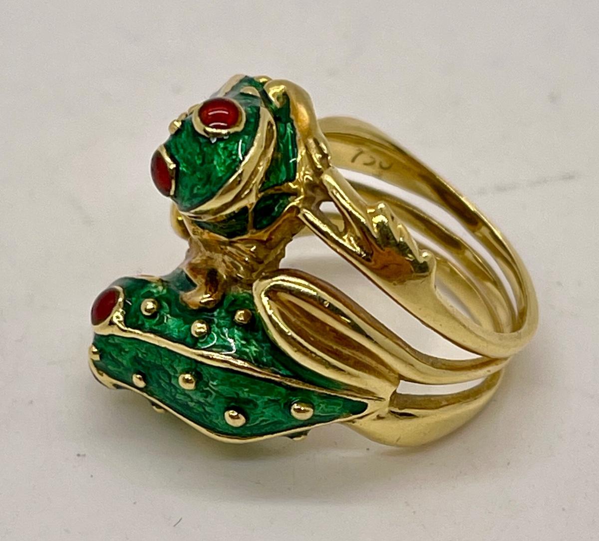 18k Green Enamel Double Frog Ring marked 750, size 6