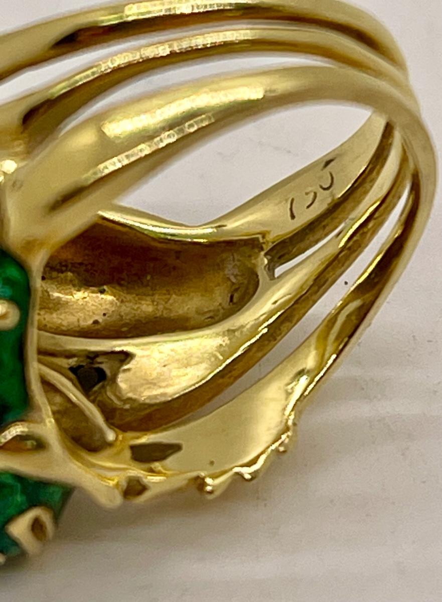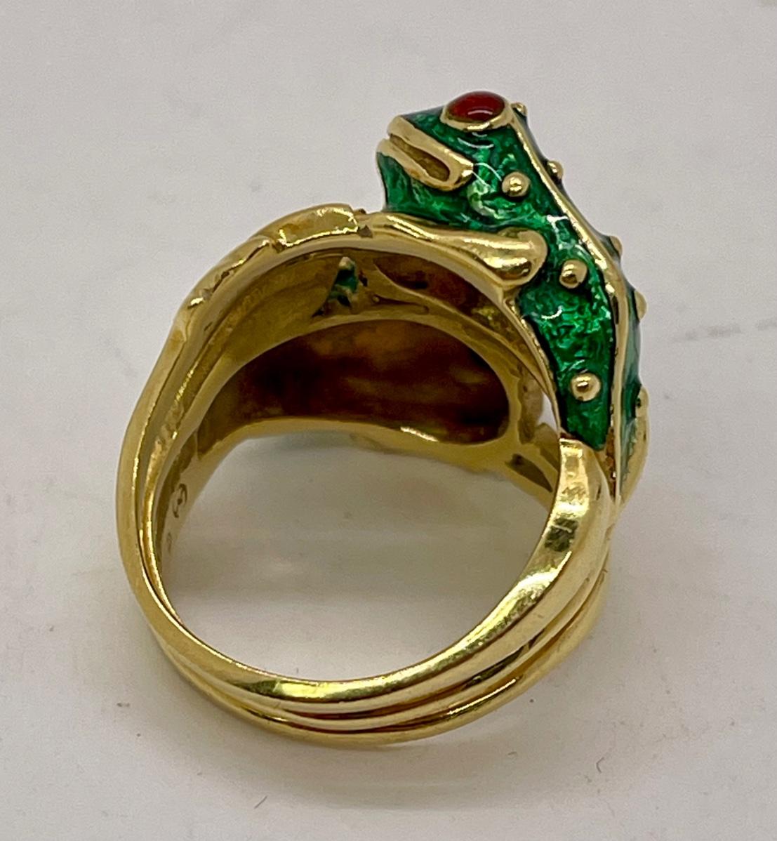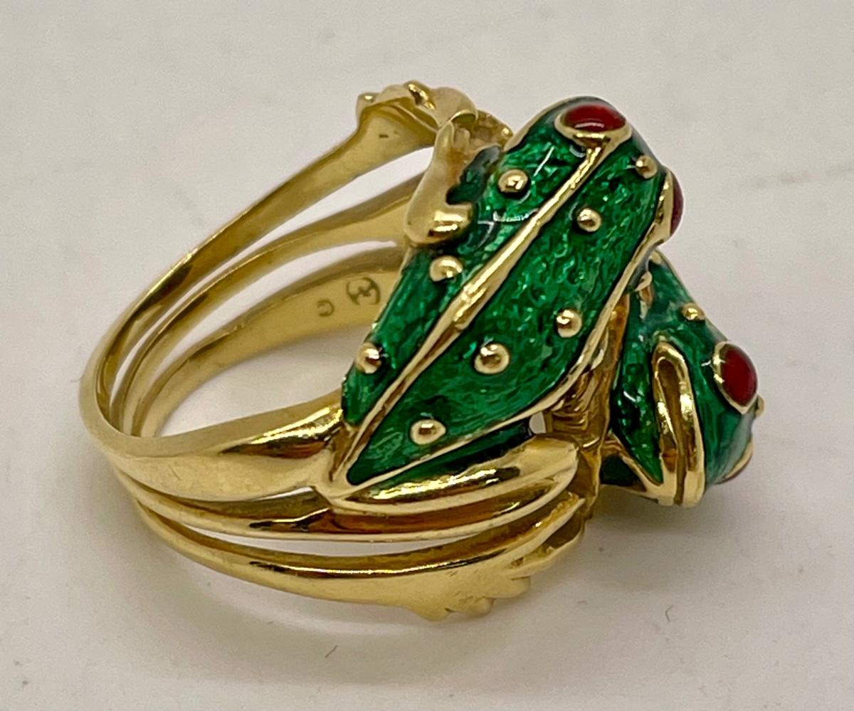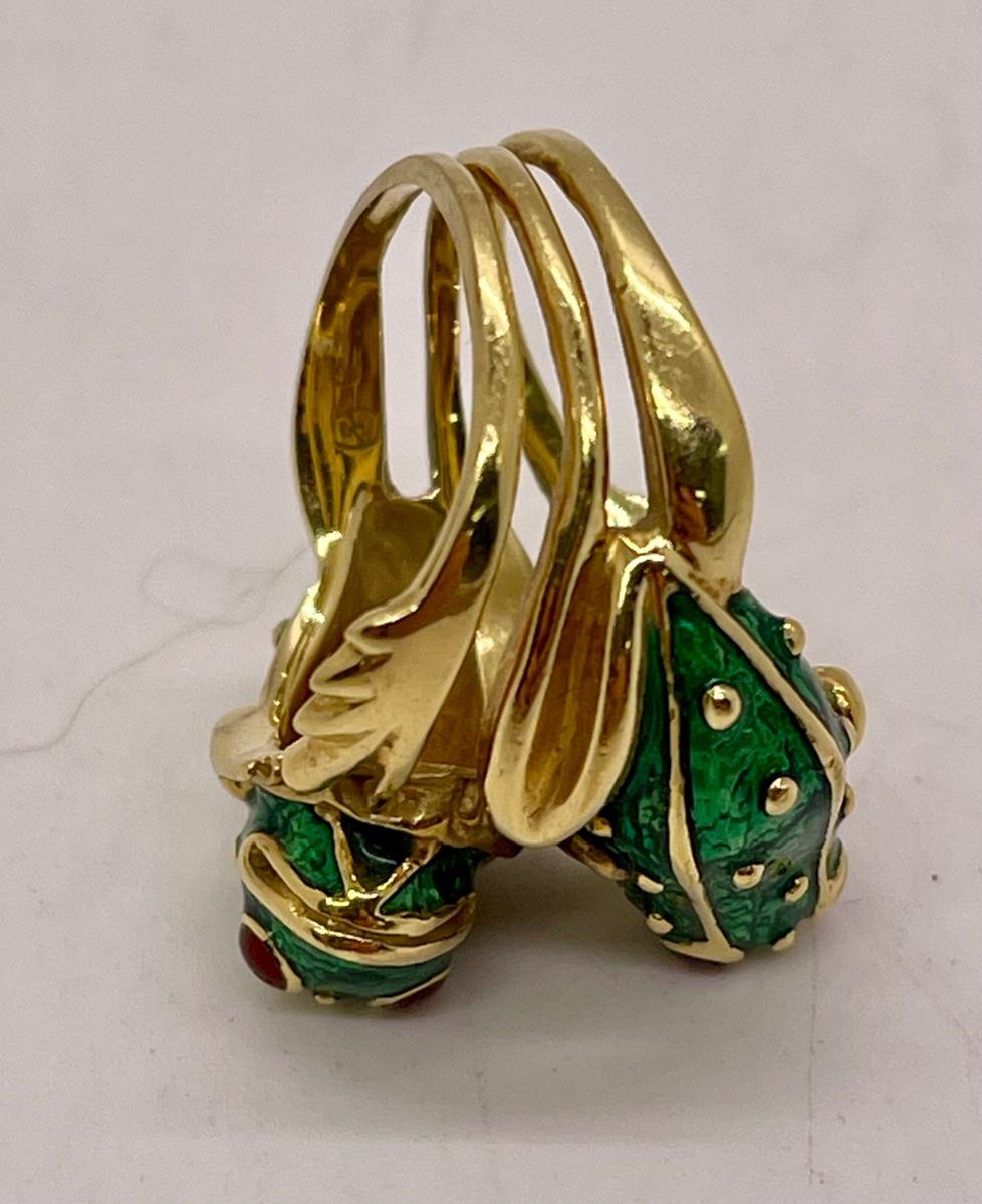 18k Green Enamel Double Frog Ring marked 750, size 6