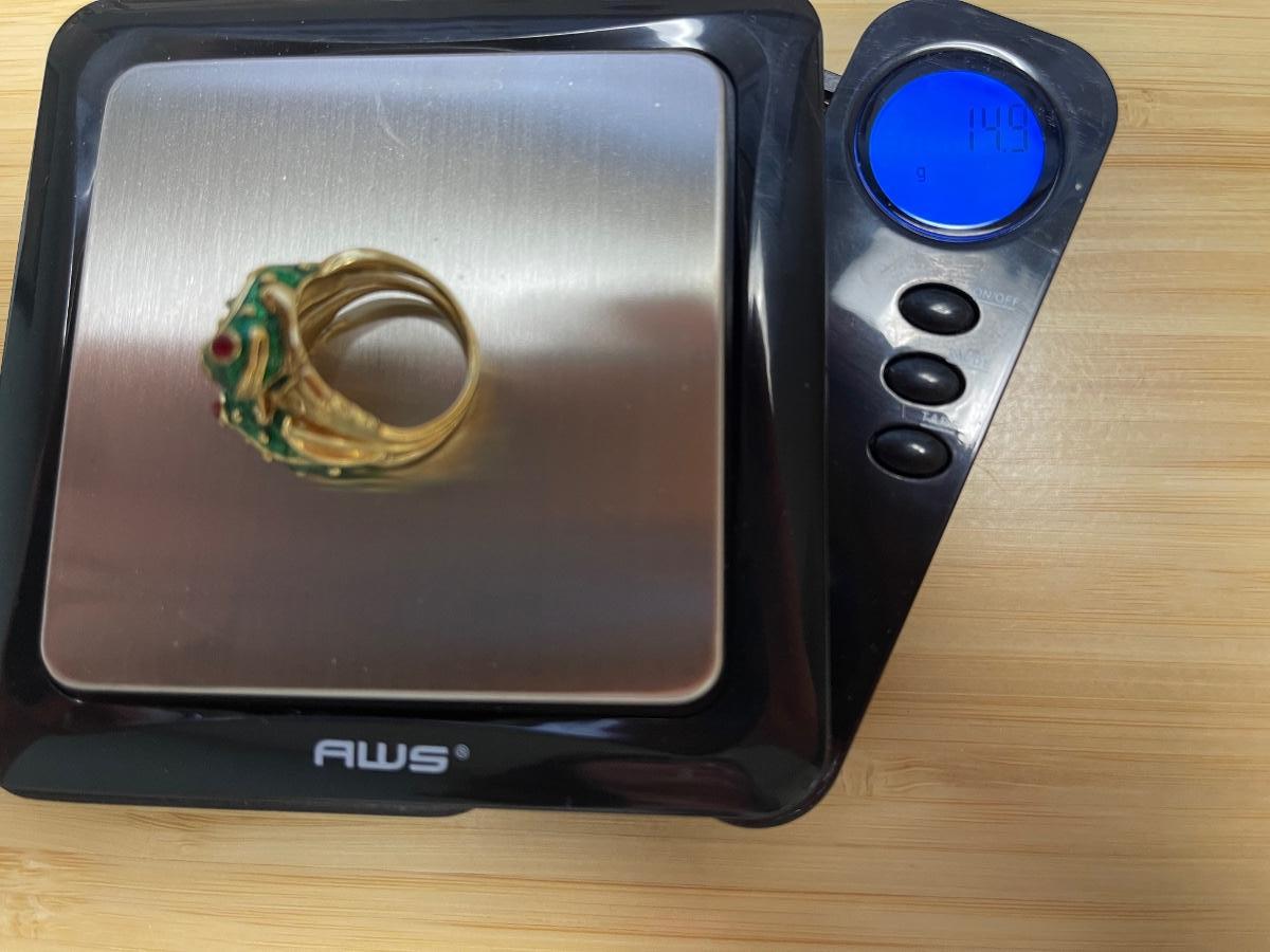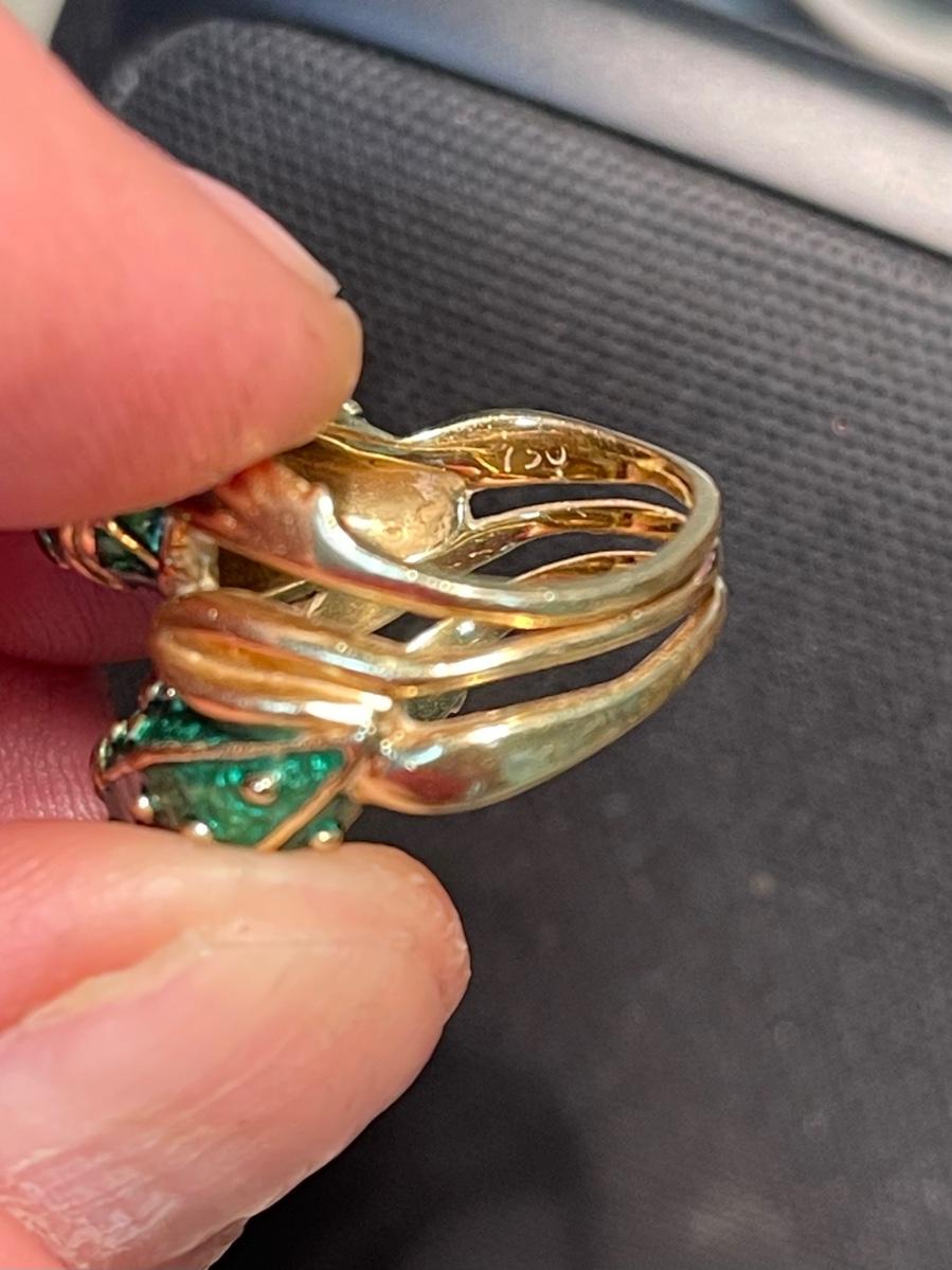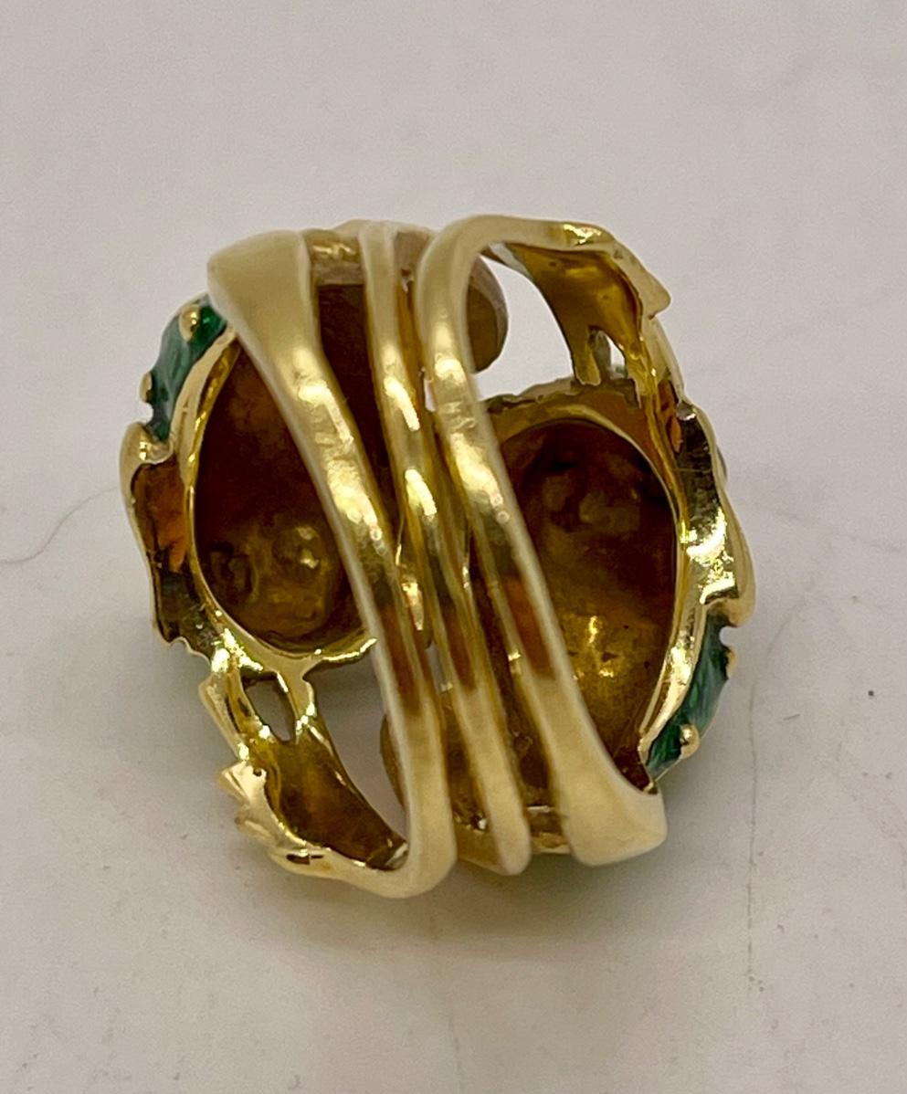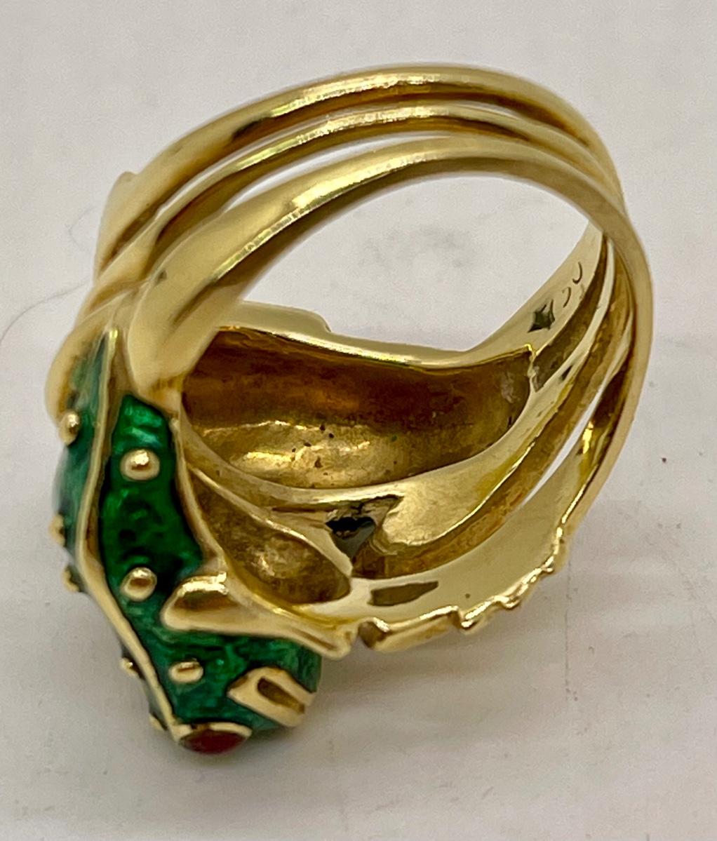 18k Green Enamel Double Frog Ring marked 750, size 6