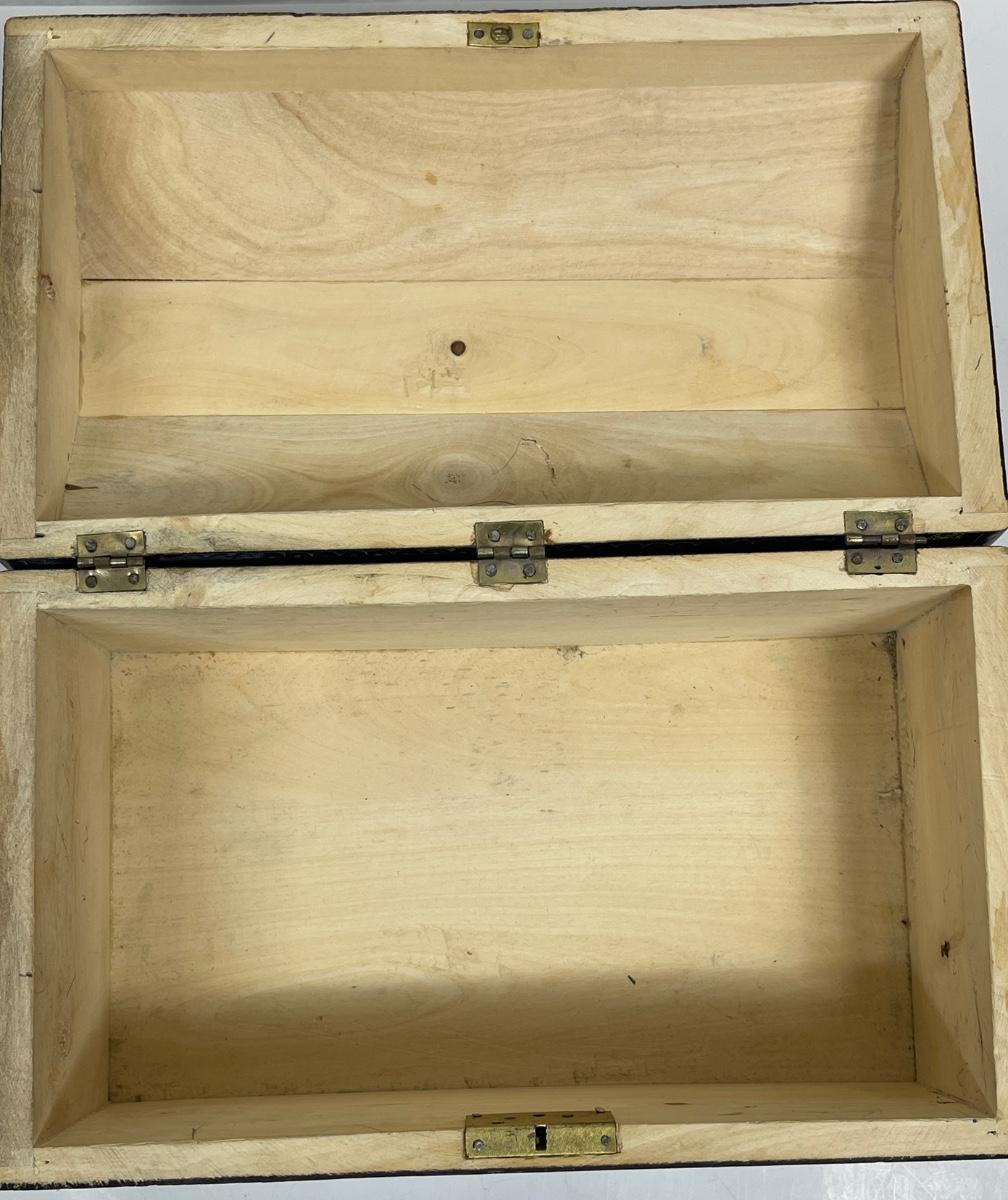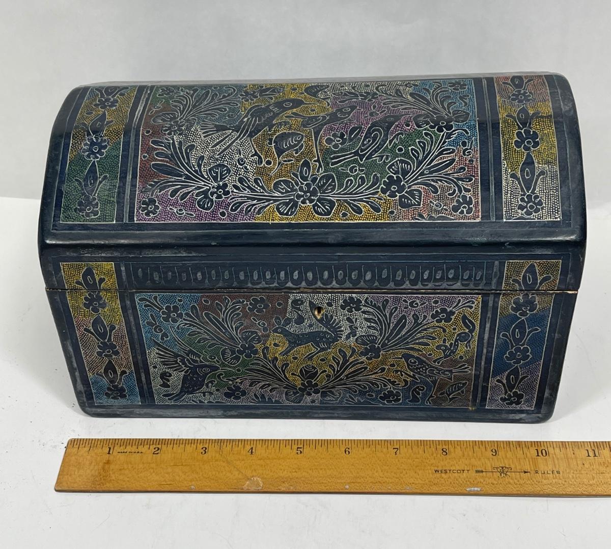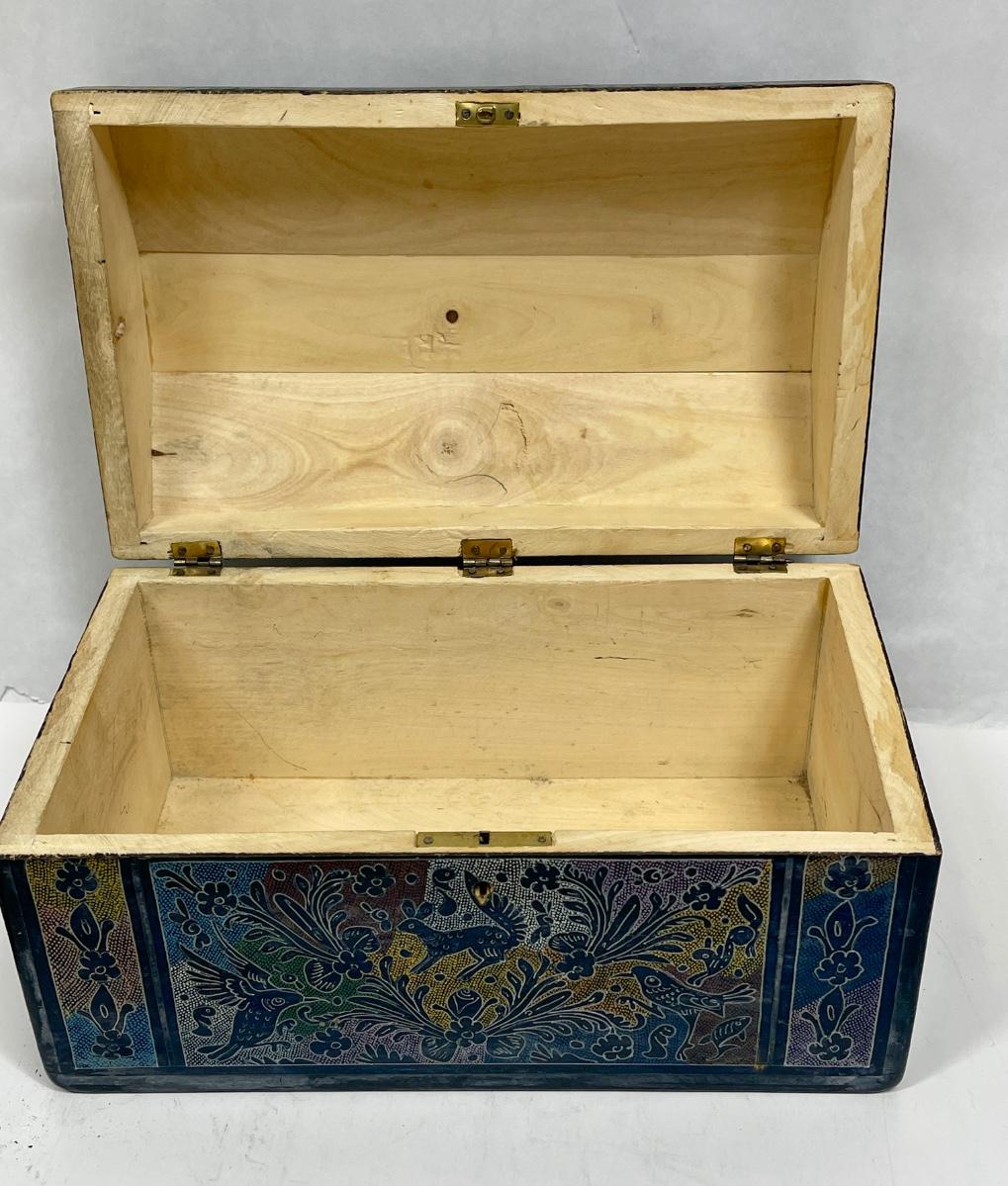 Hand-painted with a traditional stippling technique (dots of various colors, such as red, purple, blue, yellow green and white). Box and hinges are in good condition, box is very clean and unpainted inside. Approx. 10" long, 6" high and 5.75" deep.