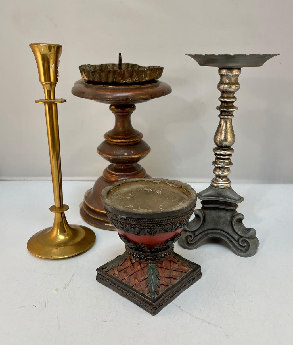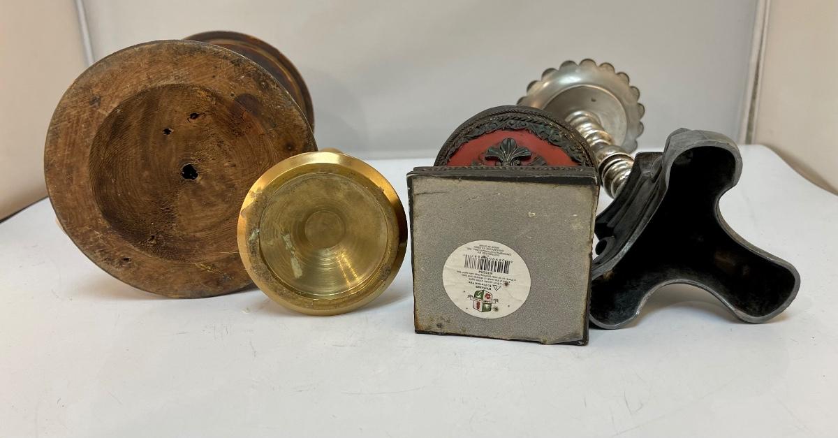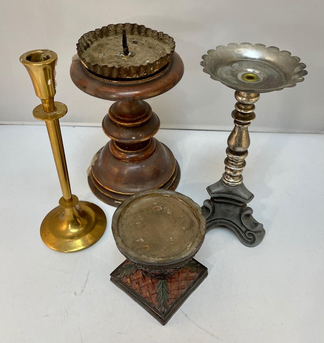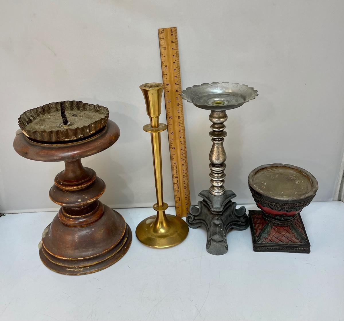 Variety of Wood, brass, & metal candlestick holders in good condition.