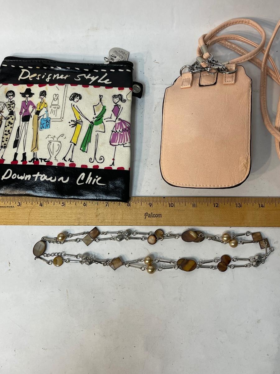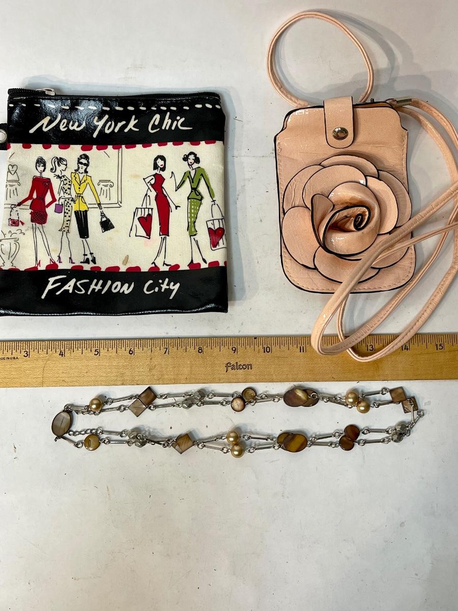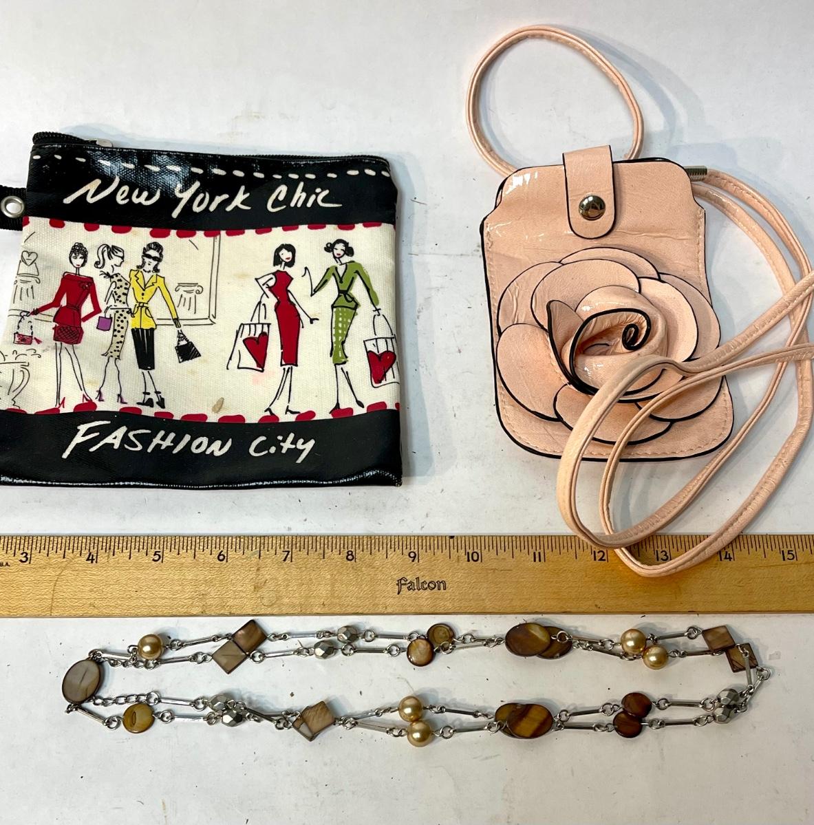 New York Chic purse or make-up bag, Pink Leather shoulder strap cross body purse for phone, Chain with Chaarm & Bead necklace.