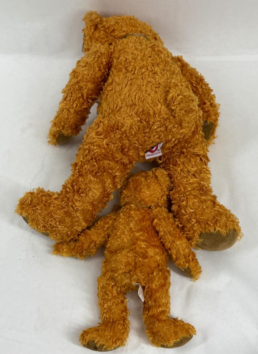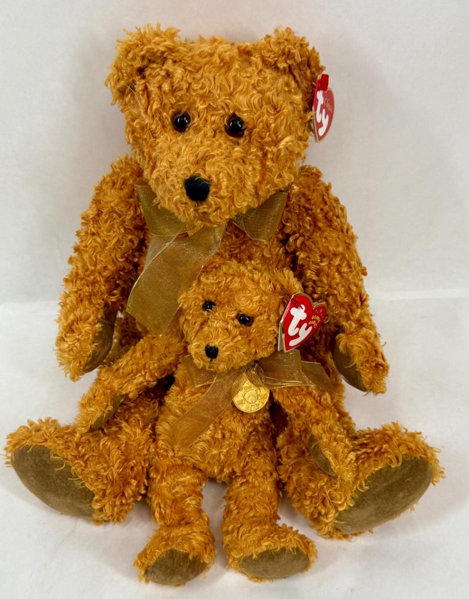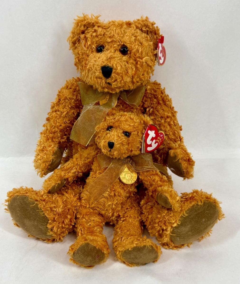 Ty Classics Teddybearsary the Brown Bear, which was produced in 2002 to celebrate the 100th anniversary of the teddy bear. It wears a gold mesh ribbon and a gold medallion around its neck. The medallion has a picture of a teddy bear with the dates 1902-2002 on one side, and a picture of Teddy Roosevelt on the other. He is in great condition, approx. 14" tall. Also included is the 8" Beanie Baby Version, named Teddy, also with the ribbon and medallion.