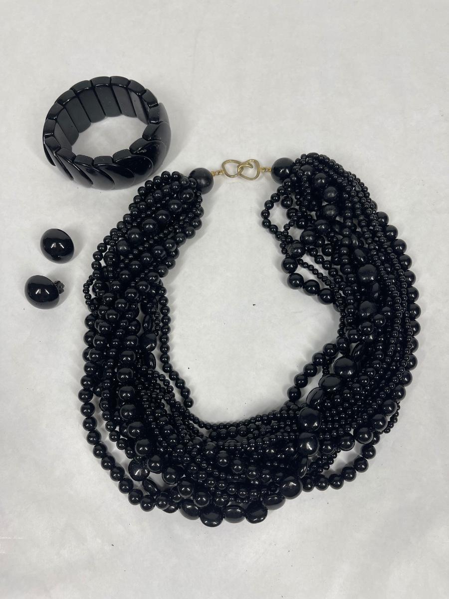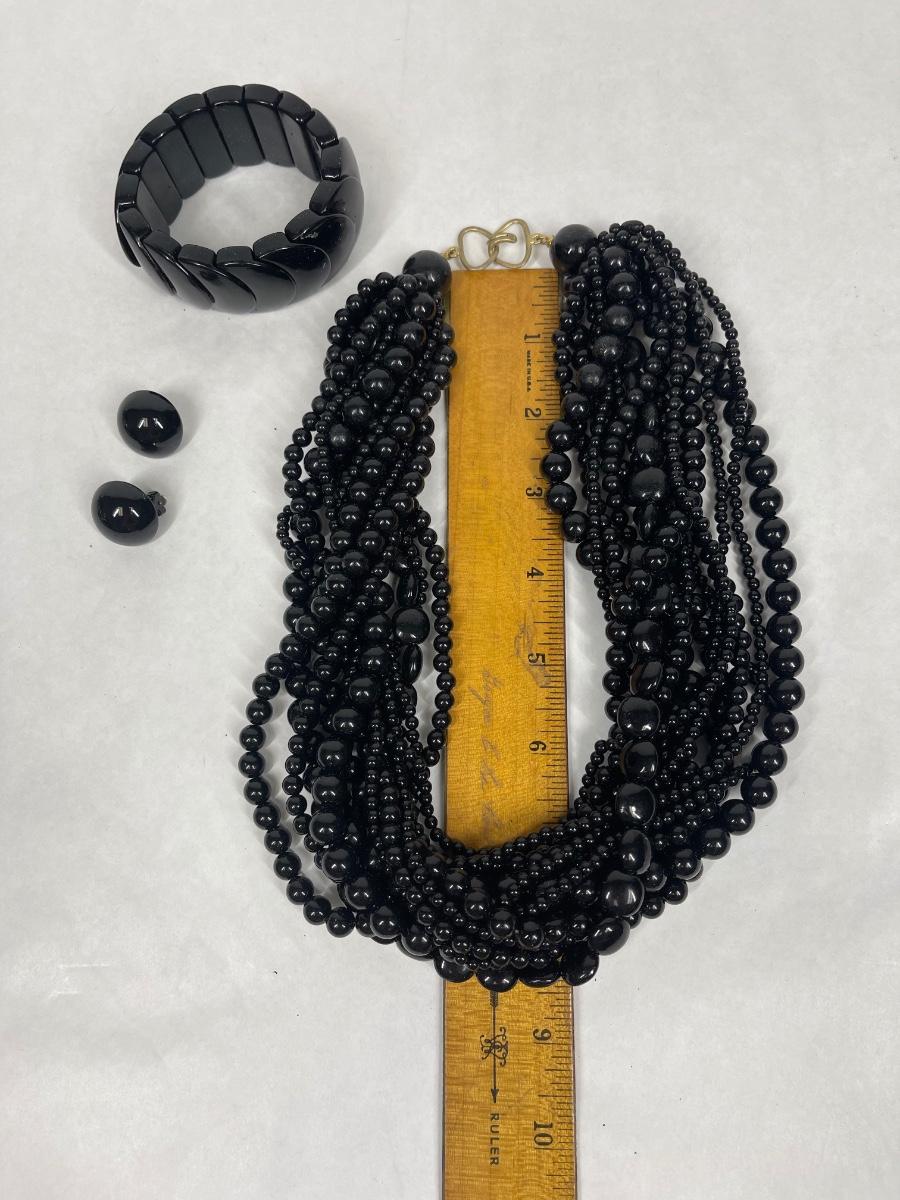 Vintage Multi Stand Black Plastic Bead Necklace with bracelet and earrings