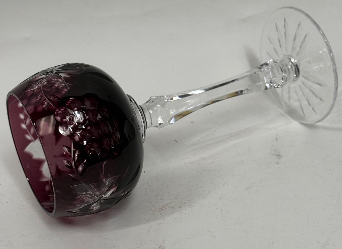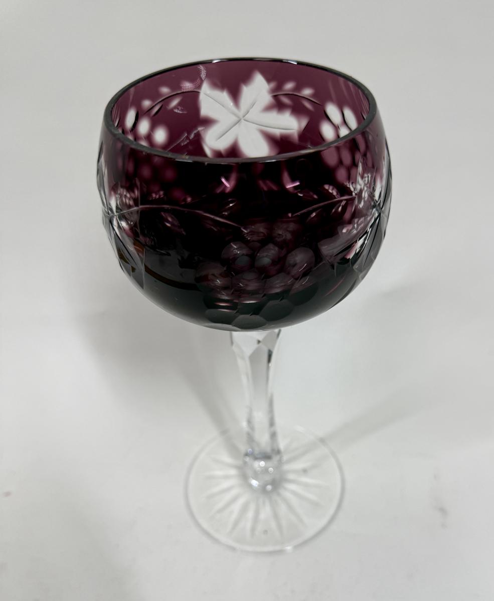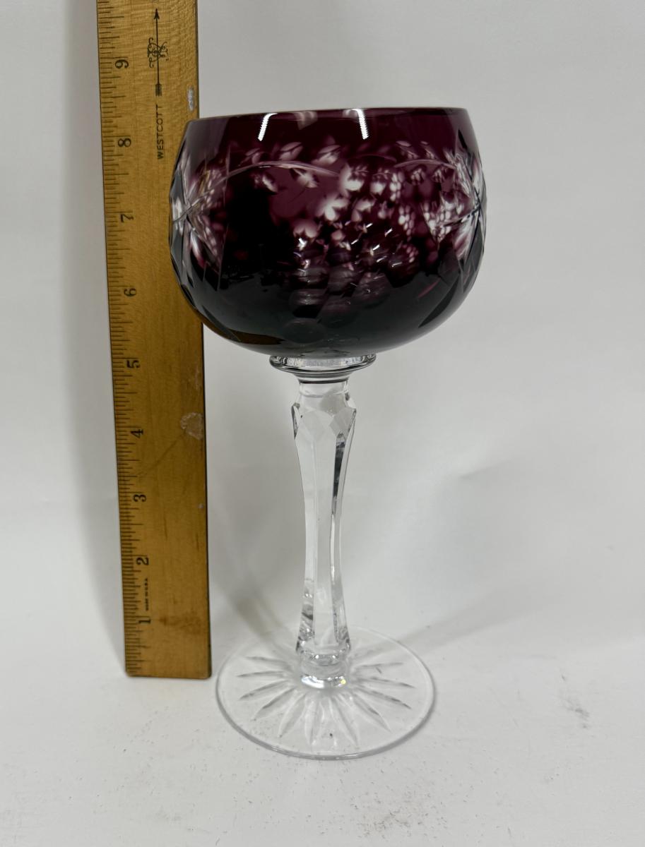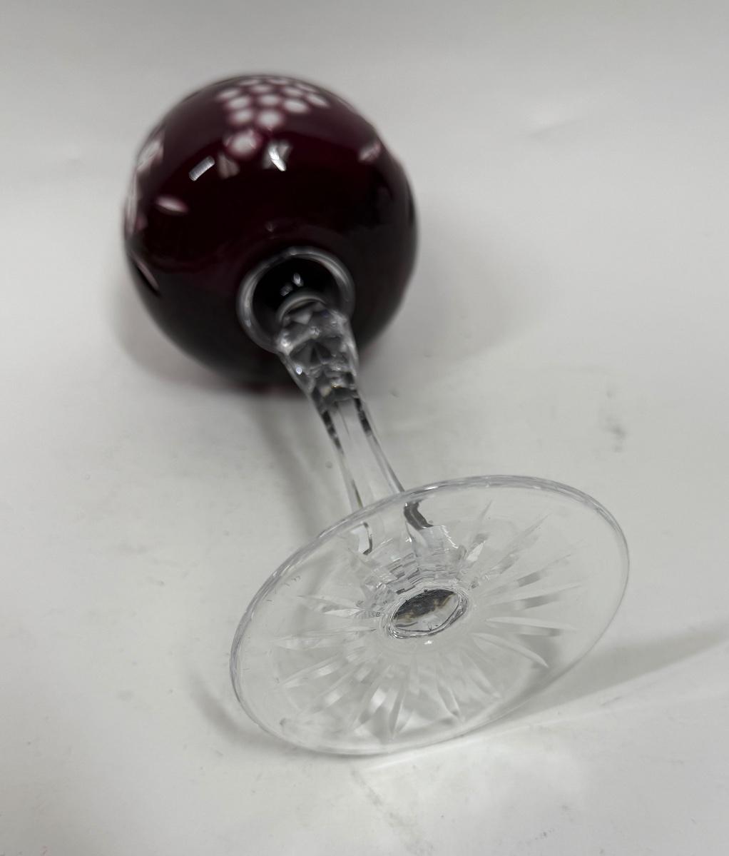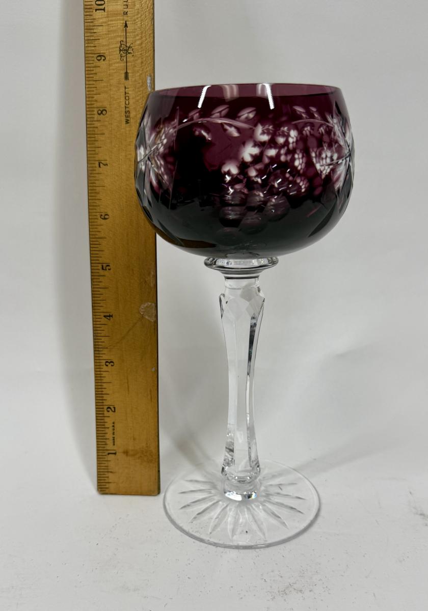 Bohemian Cut to Clear Deep Ruby Red Crystal Wine Glass Hock, Flower/Grape Motif