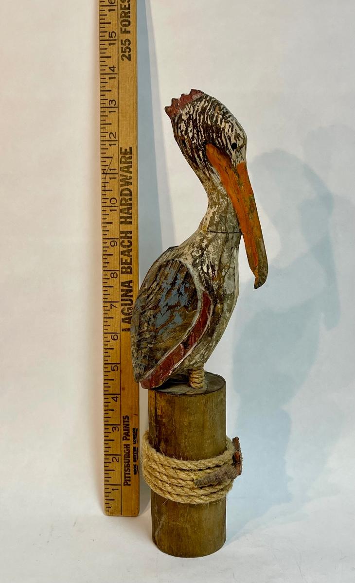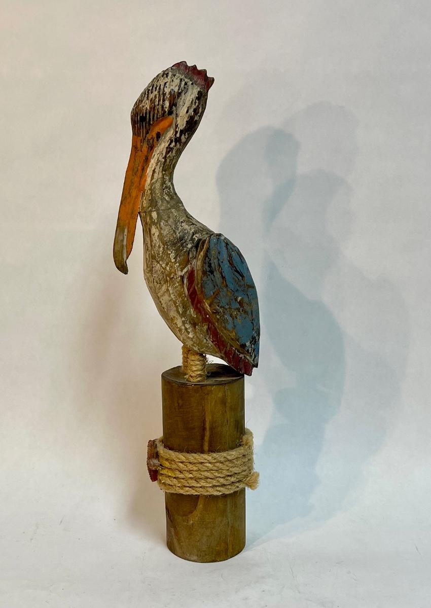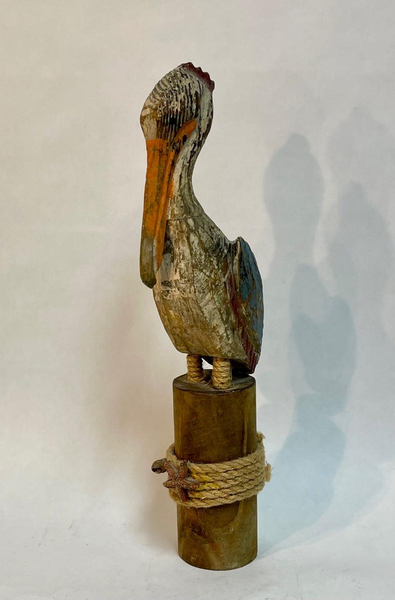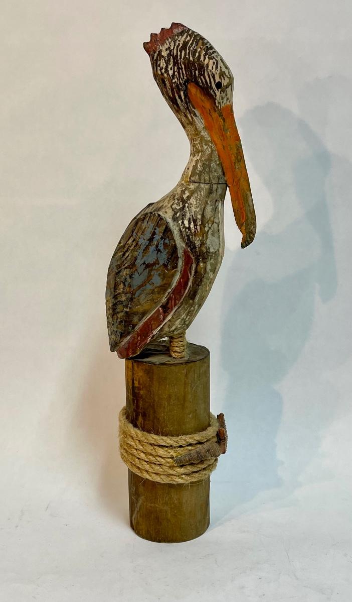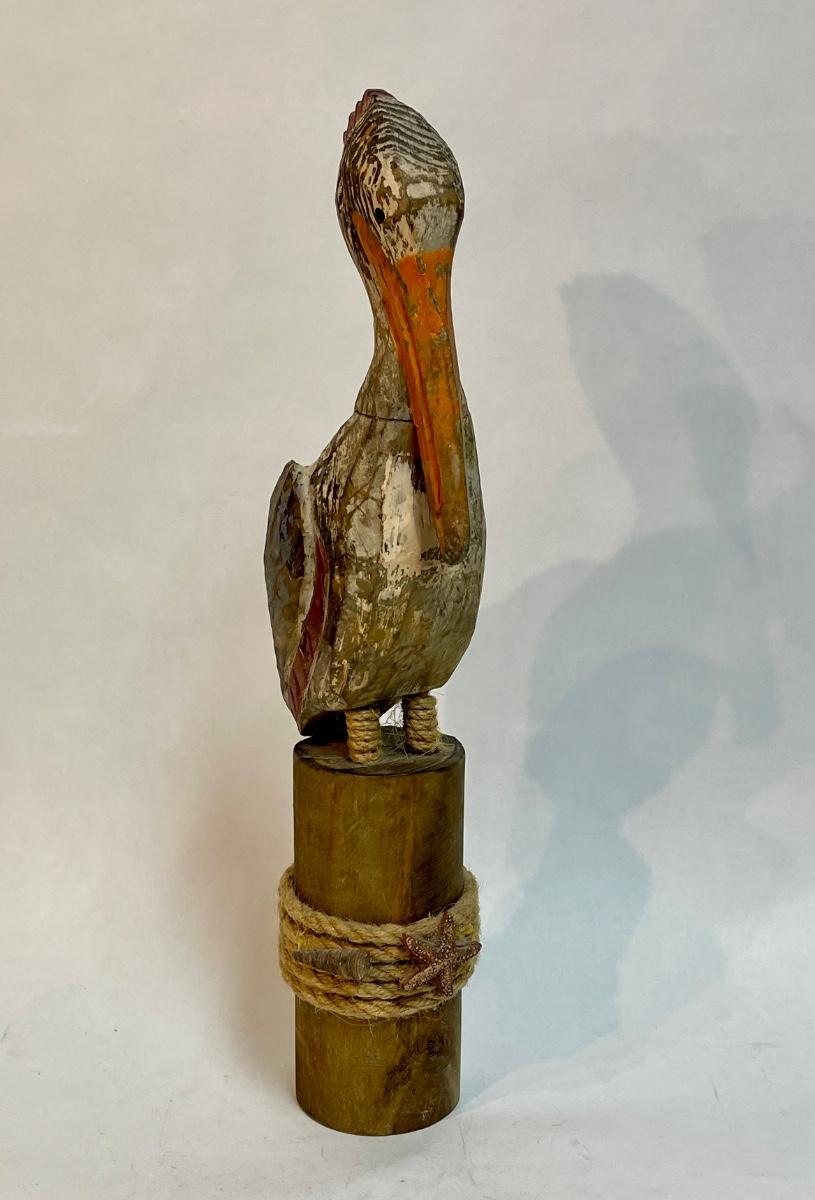 Pelican figurine, perched on a pier pileing. Very colorful.