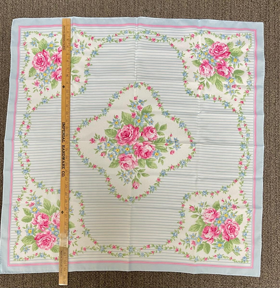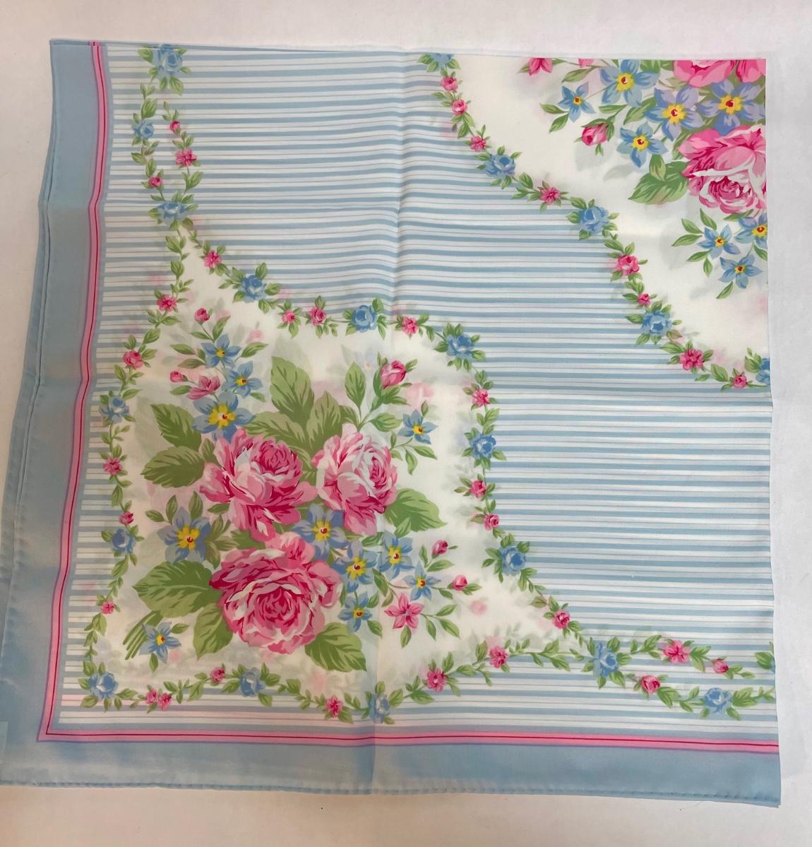 Large Scarf, pink roses, blue & white stripes