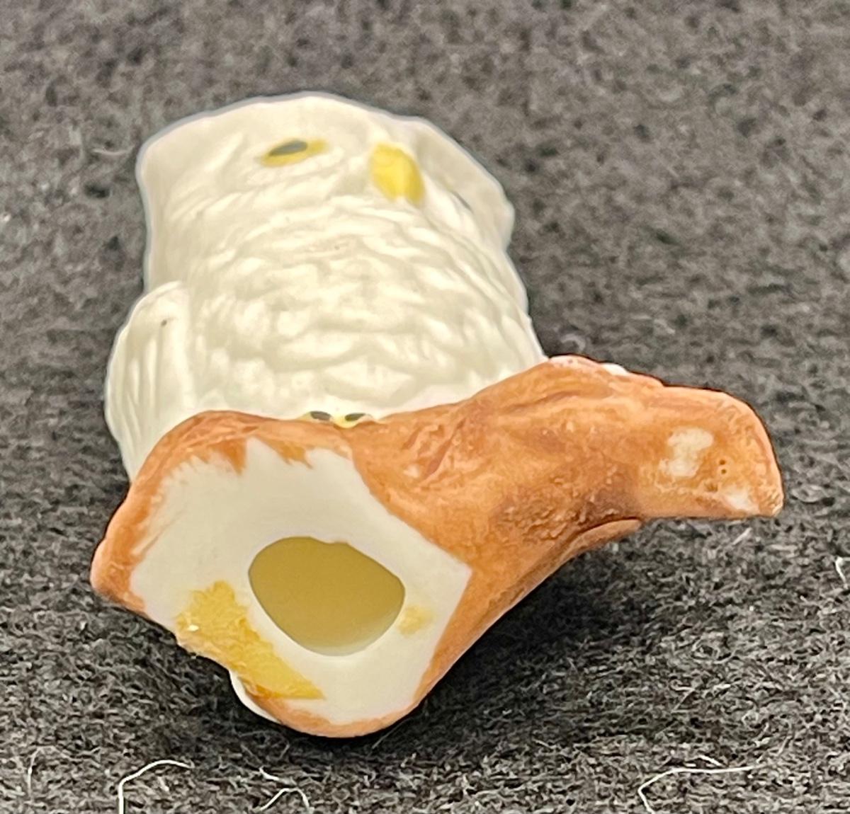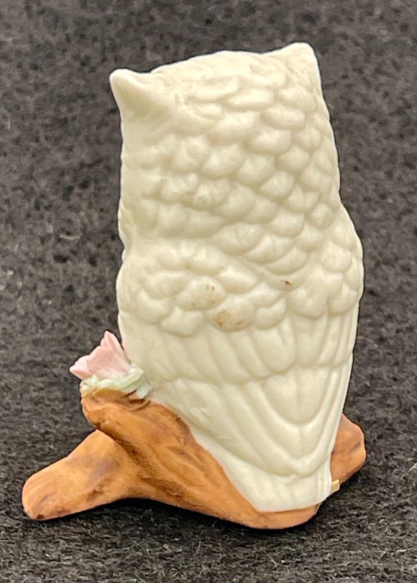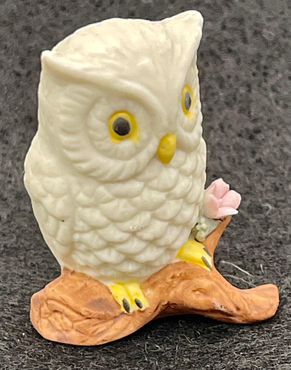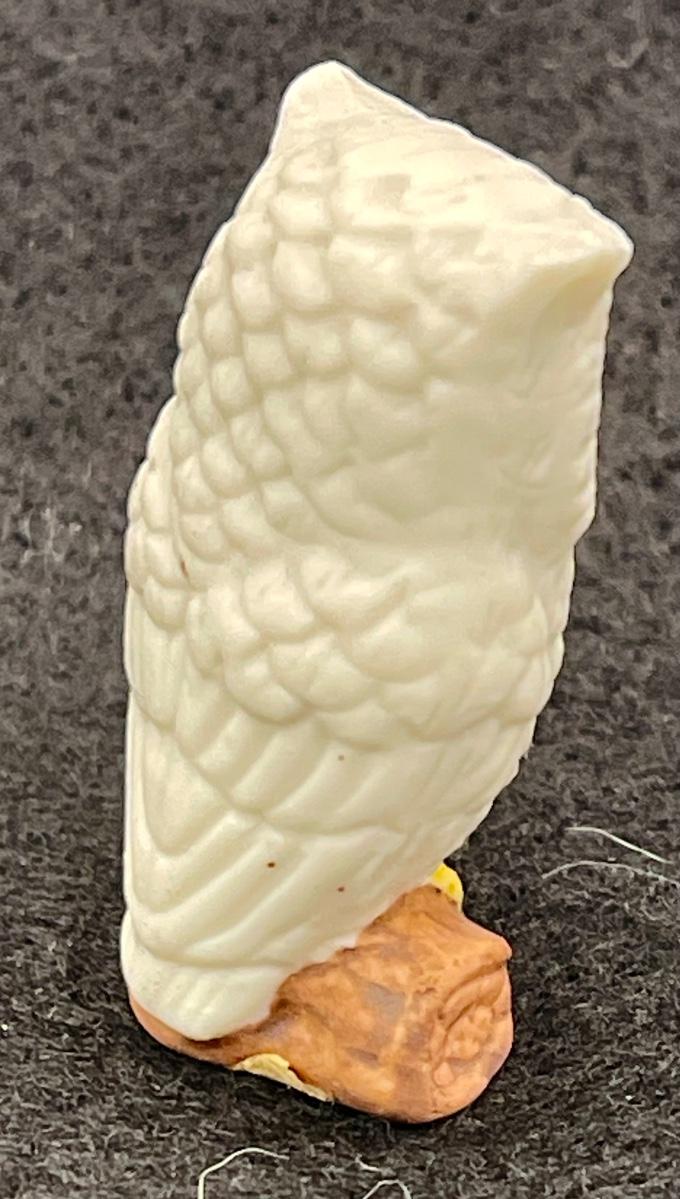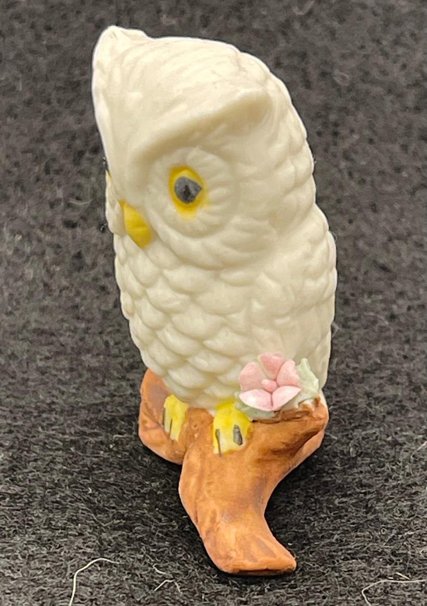 Miniature Porcelain Figurine White Snow Owl on wood branch