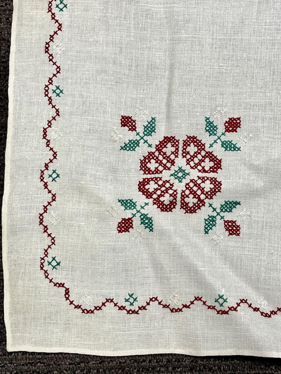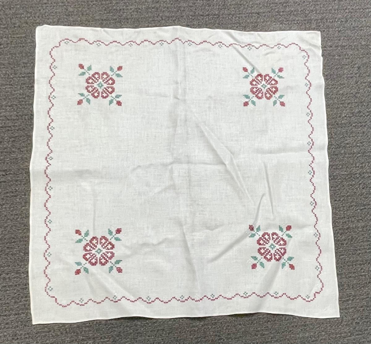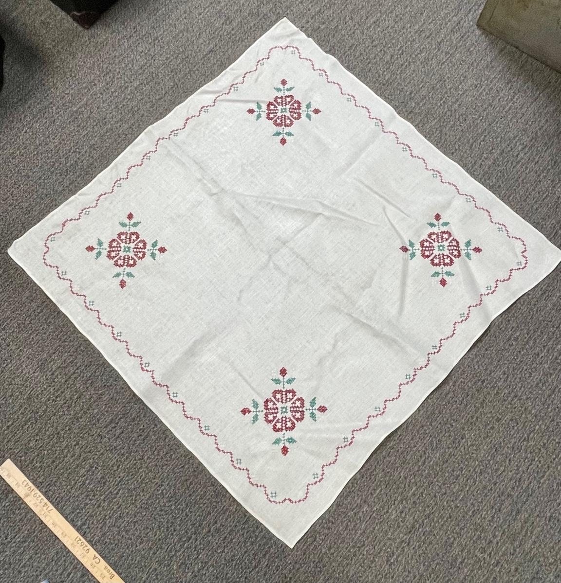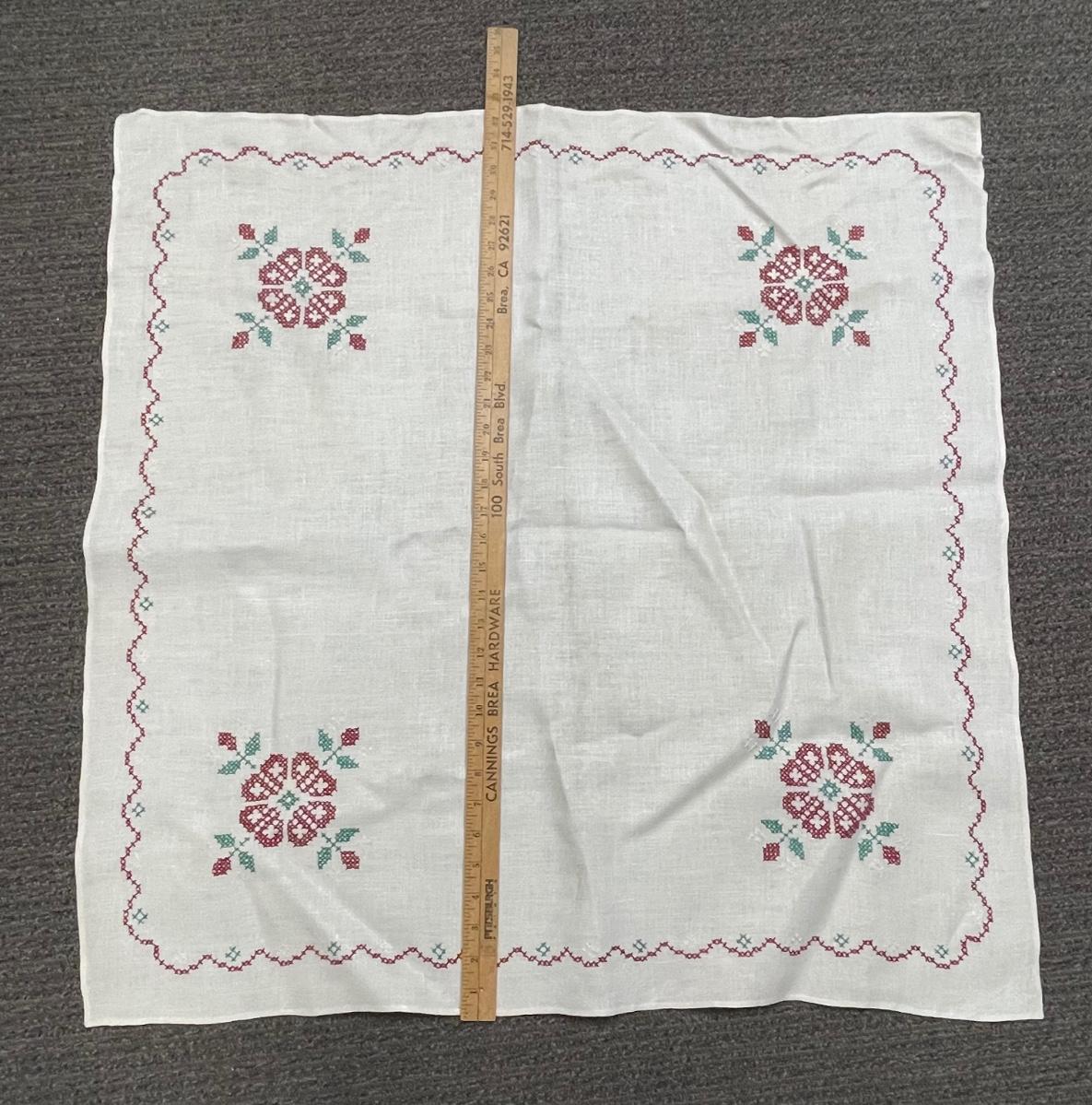 Vintage Cross-Stitched Embroidered Linen Square Card Table Tablecloth Flowers